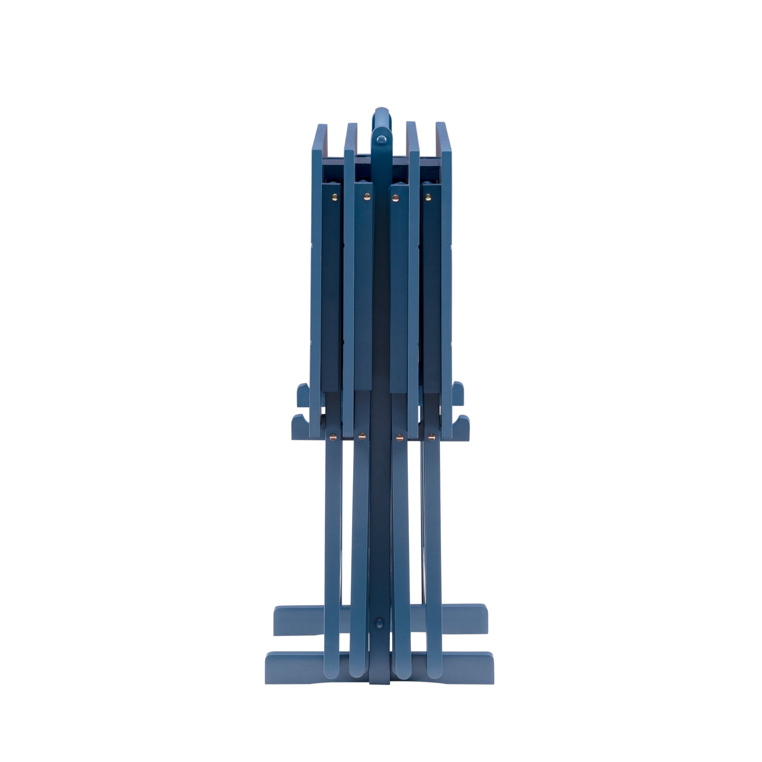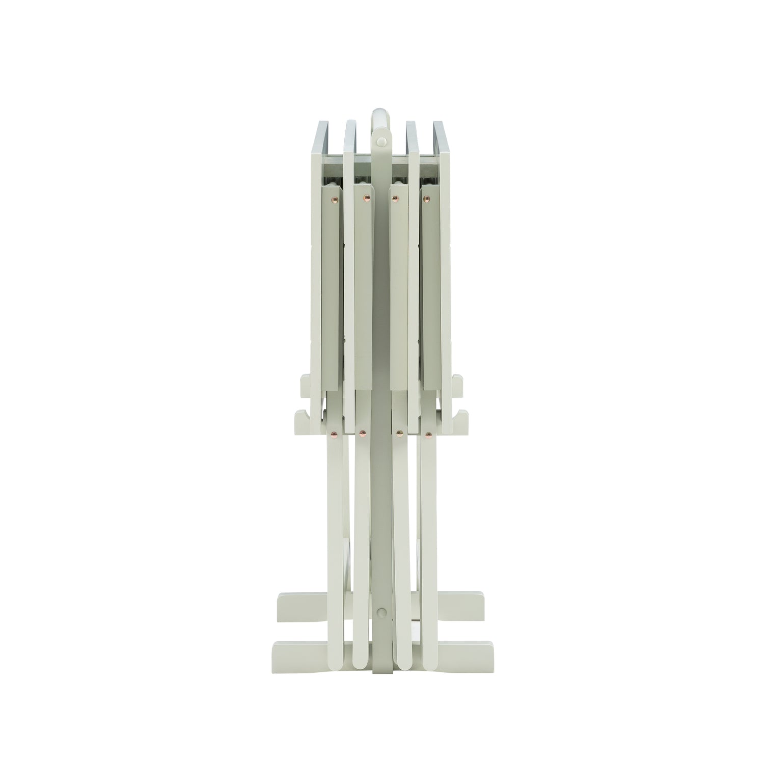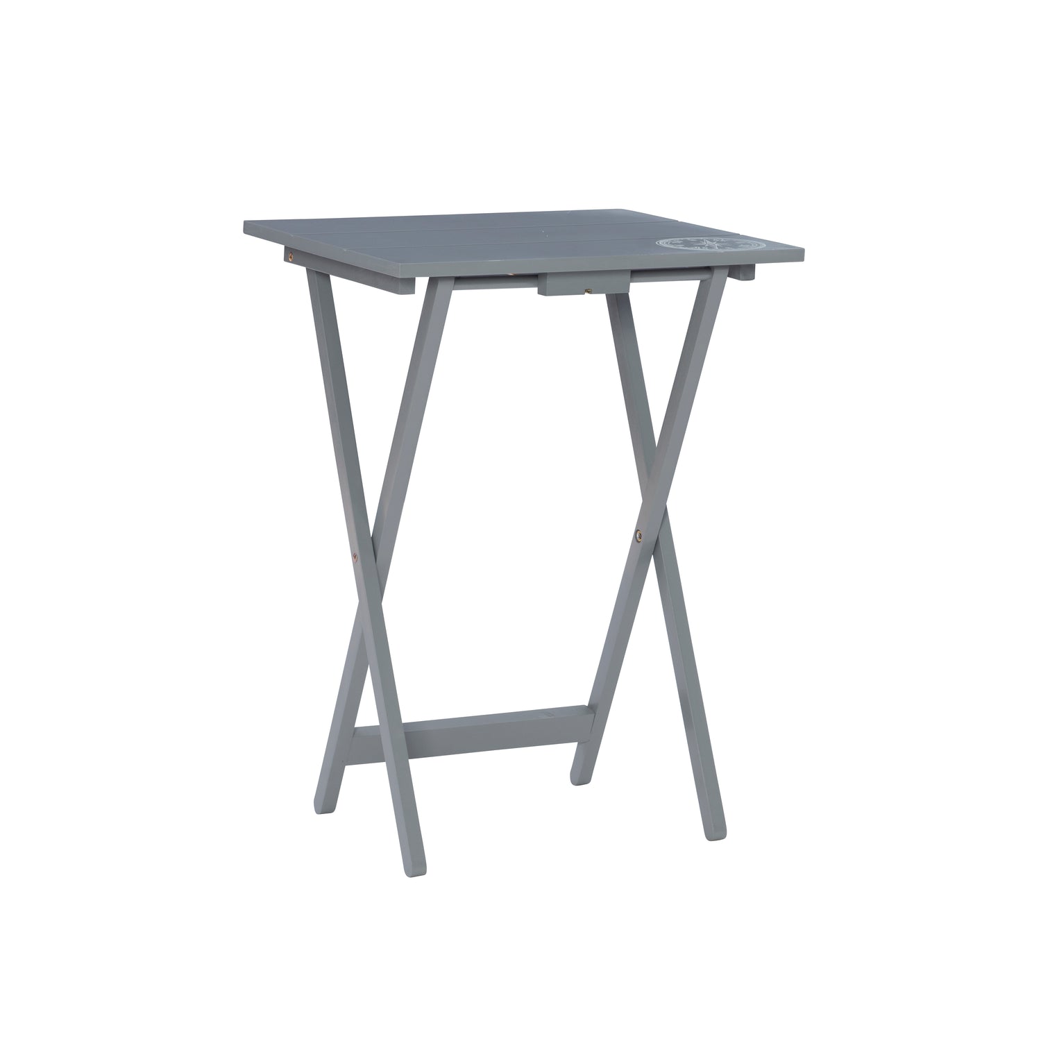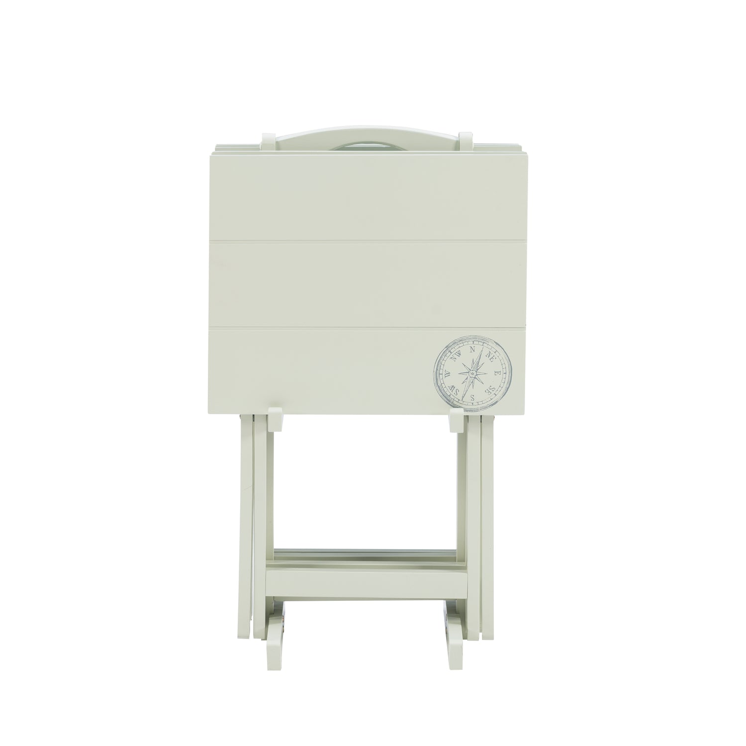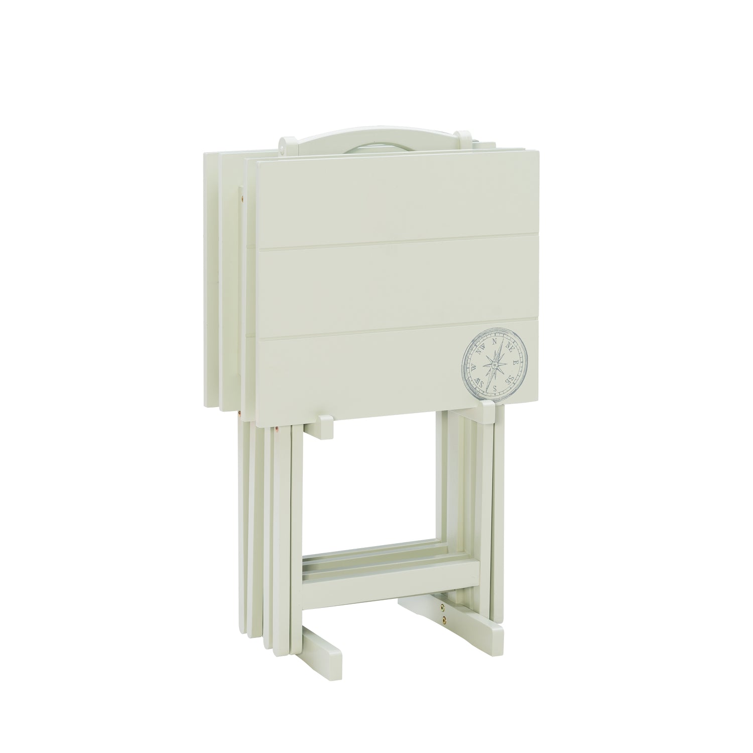 Bring convenience and style to your living space with this set of 4 foldable TV tray tables and a coordinating storage stand. Crafted with sturdy wood construction and accented with a compass-inspired design, these tray tables are perfect for meals, snacks, games, or extra workspace. Each table folds away neatly onto the portable stand, complete with a handle for easy transport from room to room. A classic, space-saving solution that blends function with coastal-inspired charm.