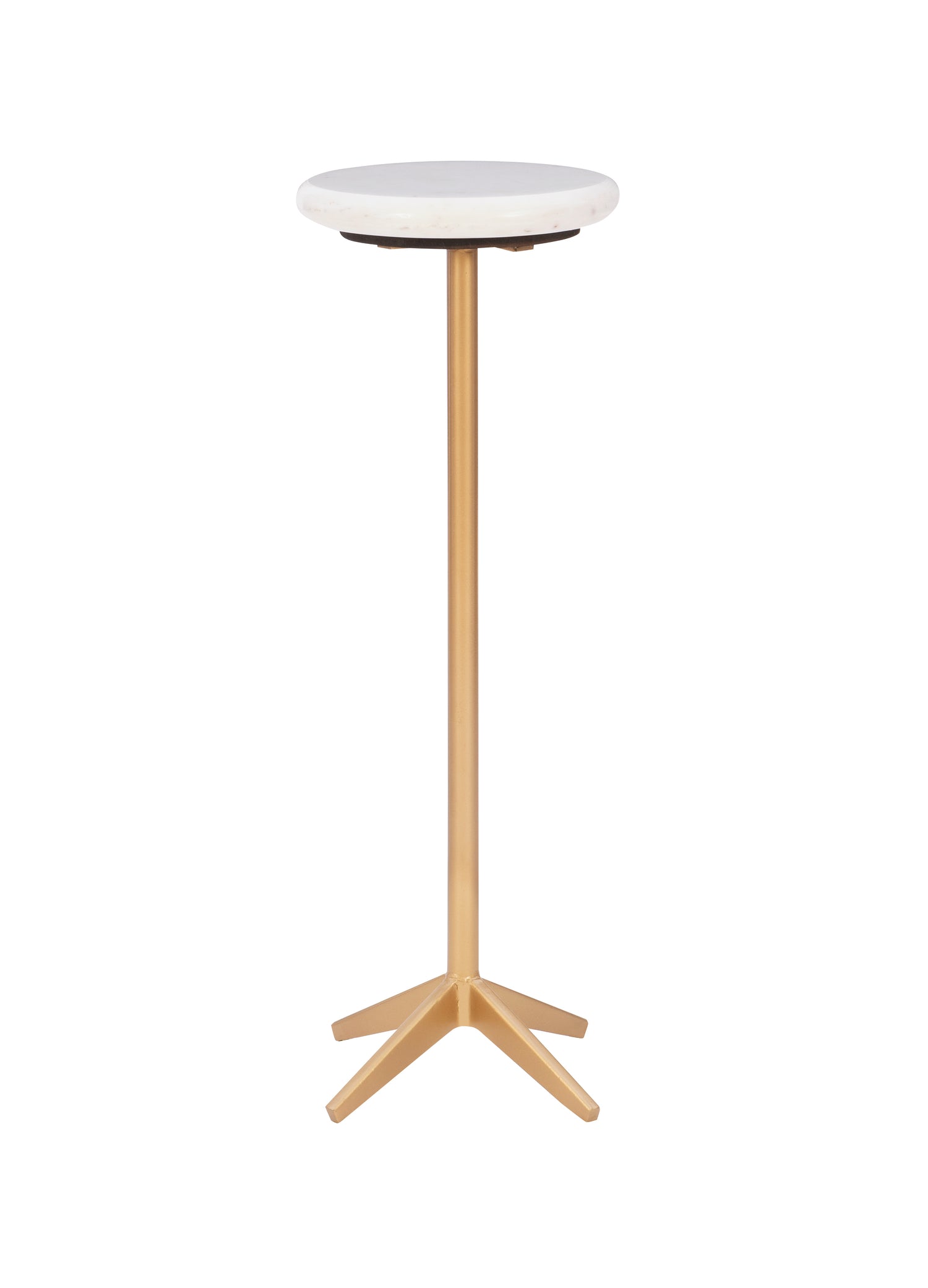 Elegant and refined, this drink table can do more than hold beverages. This glamorous table looks lovely sitting solo or set alongside a sofa. The open metal base allows surrounding accents to breathe, while the gold finish completes the look. A 10 inch round white stone top provides a perfect stage for drinks, candy dishes, framed photos and beyond. Levelers under the four iron feet ensure a stable surface to keep your belongings safe. The compact size allows the table to be effortlessly placed where it's needed most.