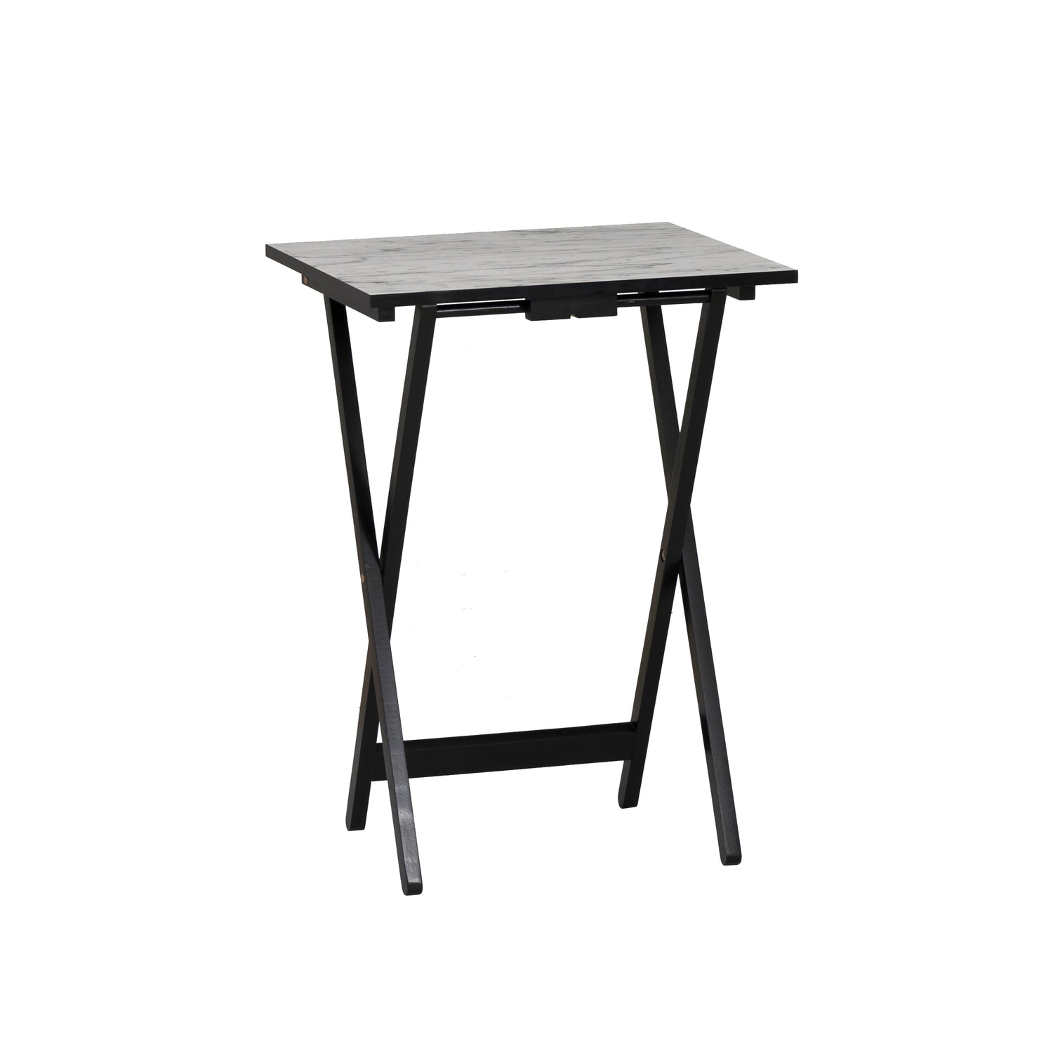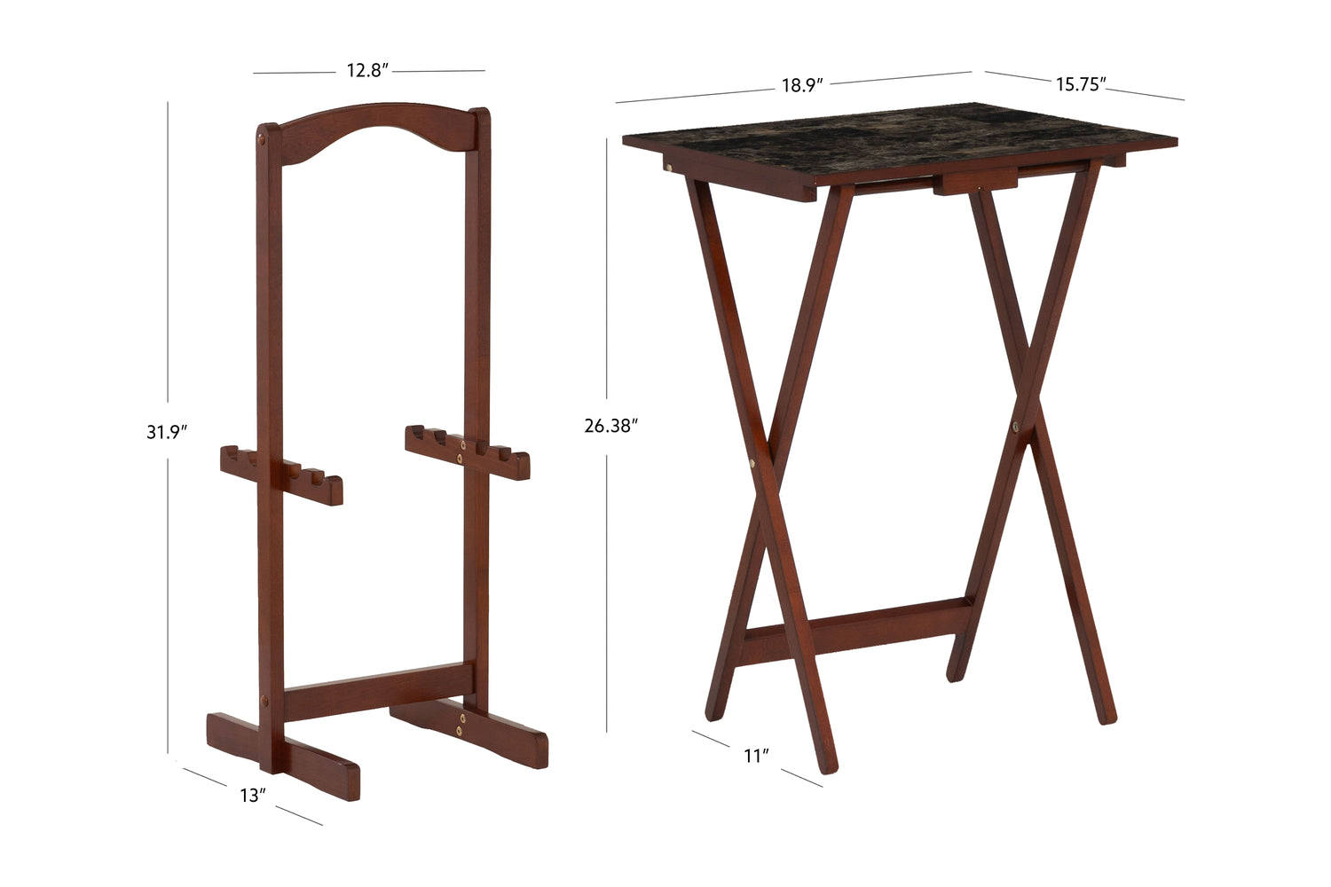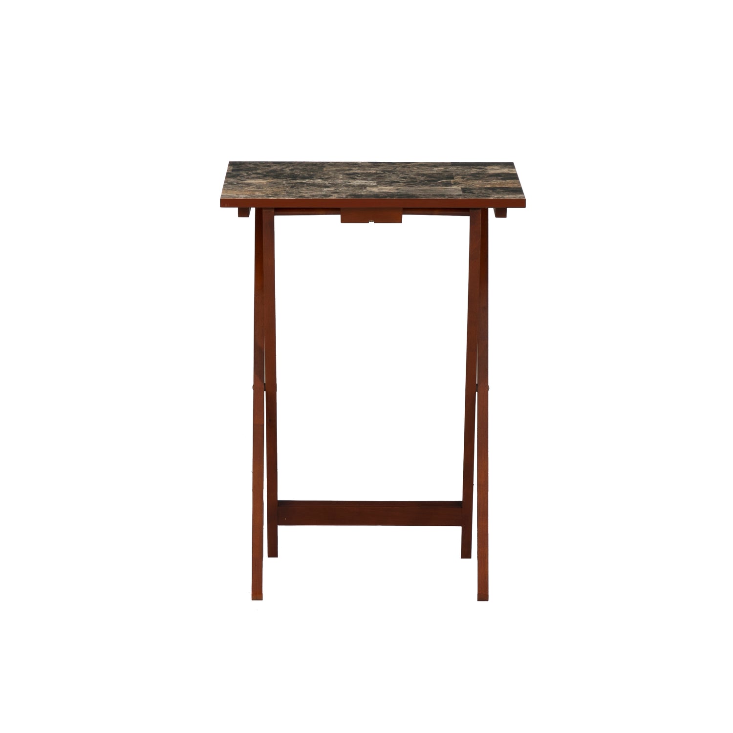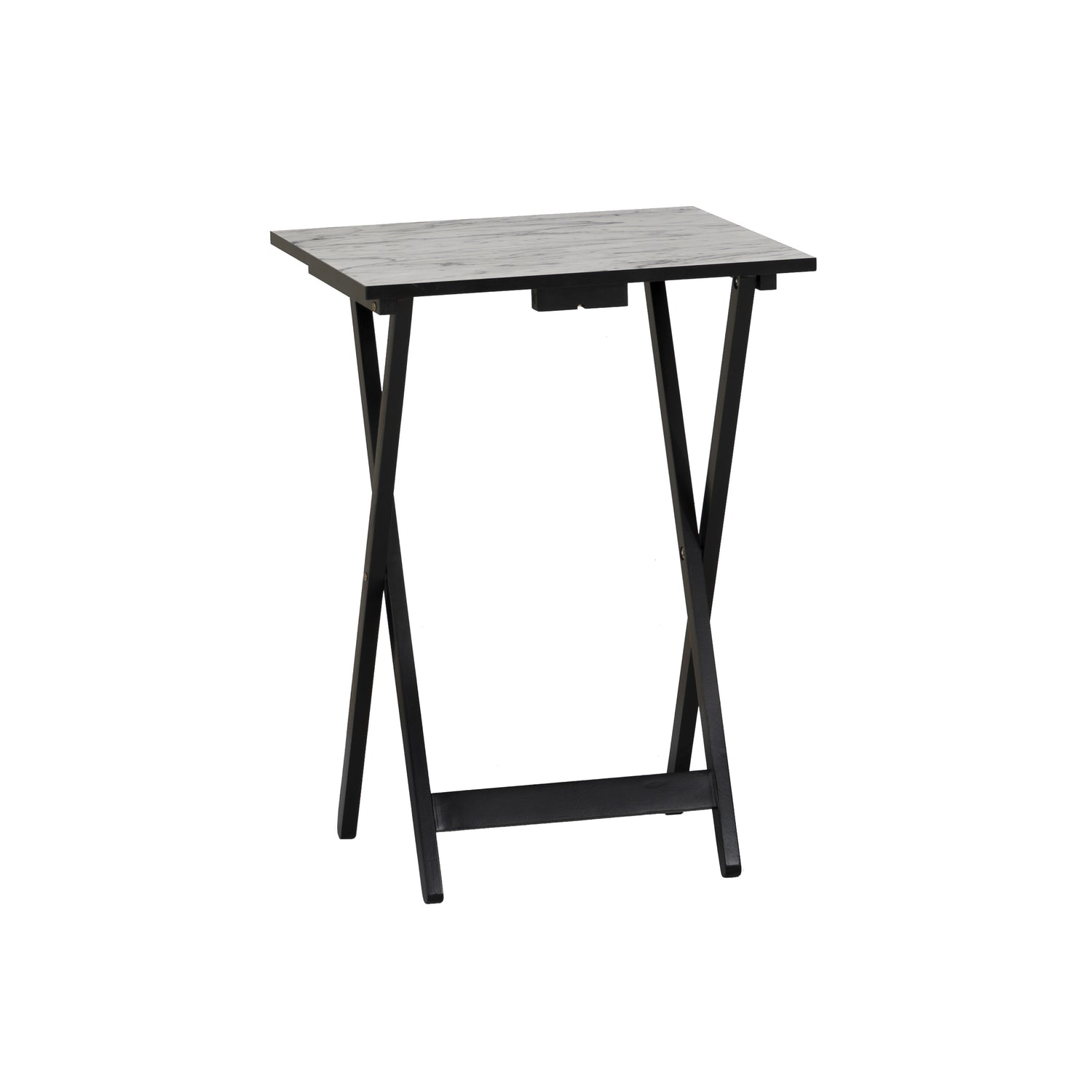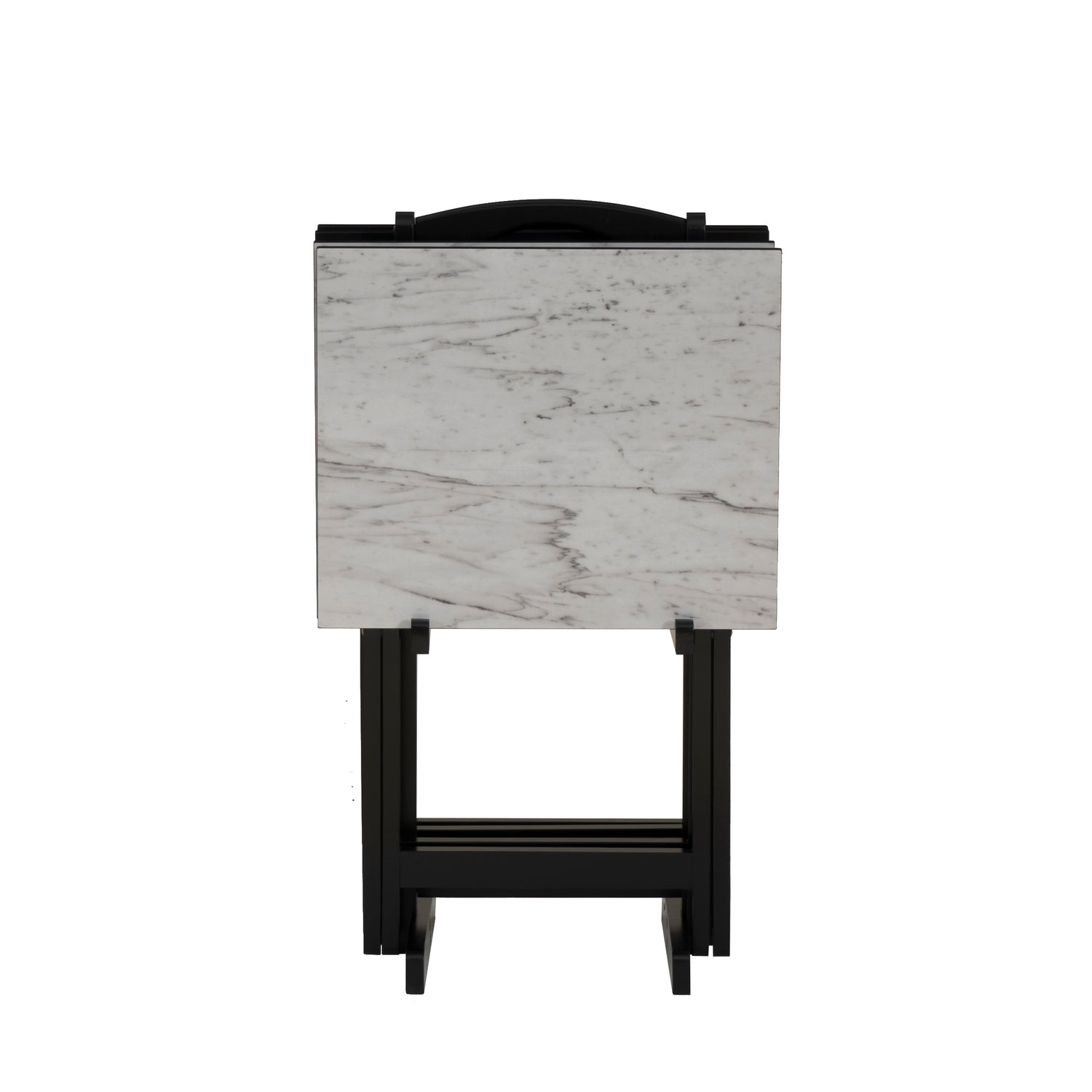Upgrade your living space with this stylish and functional 5-Piece Folding TV Tray Table Set. Featuring a sleek faux marble top and a sturdy espresso or black wood base, these trays add a touch of modern elegance to any home. Perfect for enjoying meals, working on a laptop, or entertaining guests, these foldable tables provide convenient versatility while maintaining a compact, space-saving design. The set includes four TV trays and a coordinating storage stand with a built-in handle, making it easy to transport and neatly store away when not in use. Whether you're furnishing a small apartment, dorm, or family room, this set is a must-have home essential for everyday convenience.