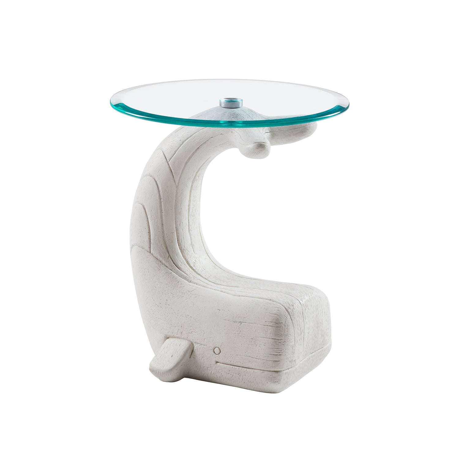 Create a one-of-a-kind look with this sculptural side table, molded from an original artist’s design to mimic the appearance of real carved wood. The rustic finished whale base is both sturdy and eye-catching, topped with a beveled tempered glass surface that’s heat-resistant and shatterproof. With a 20” diameter, the glass top provides ample space for a lamp, books, or a floral arrangement, making this piece as functional as it is conversation-worthy.