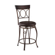 With its transitional design, durable materials, and repeating circle patterns, this handsome bar stool is a perfect addition to any space. The metal frame features a distressed bronze finish, offering warmth and versatility to complement a variety of decor styles and color schemes. The bar stool's 30" seat height is ideal for counters between 41" and 43" high, and the counter stool's 24.5" seat height is perfect for counters 35" to 39" high. The seat and decorative metal backrest swivel a full 360 degrees, allowing easy movement. Wrapped in dark brown faux leather, the seat pairs seamlessly with the frame while remaining durable and easy to clean.