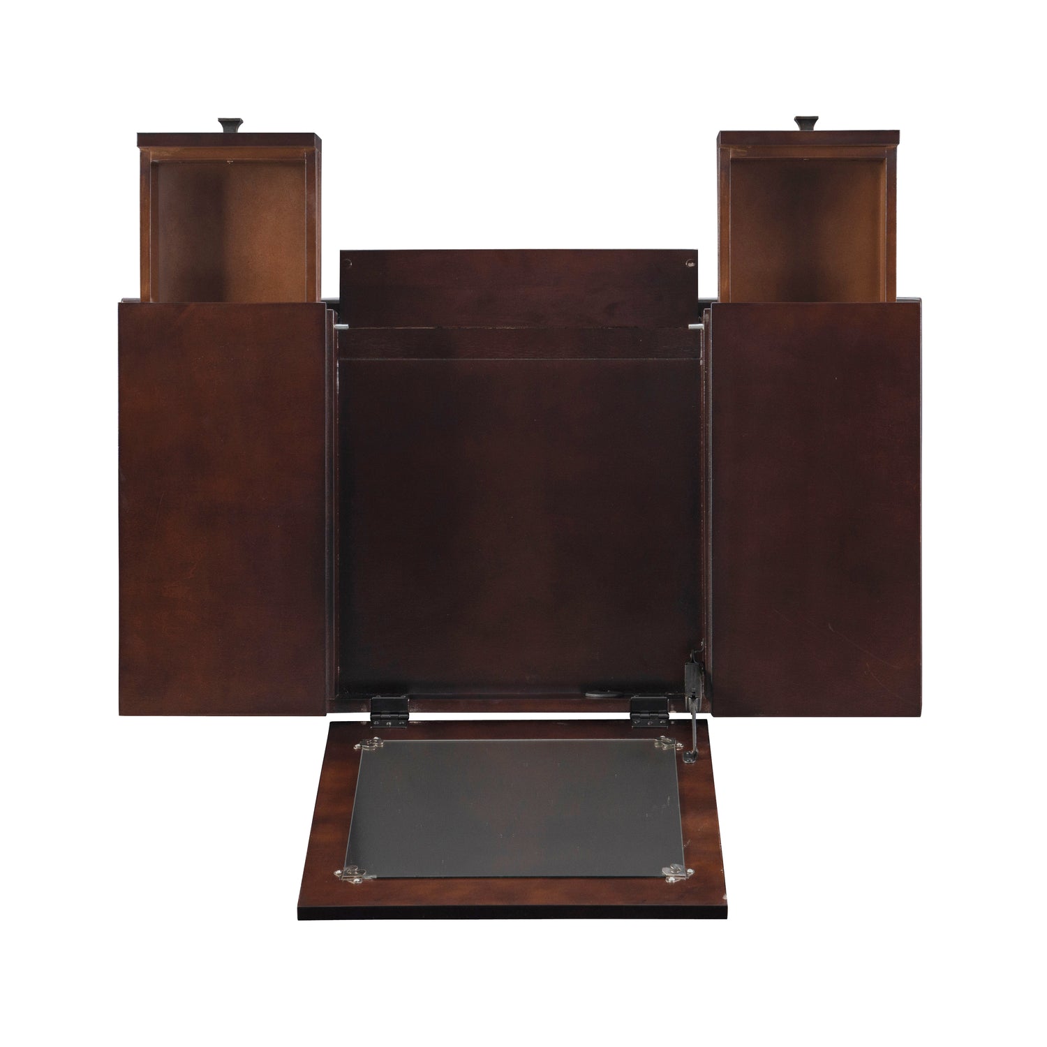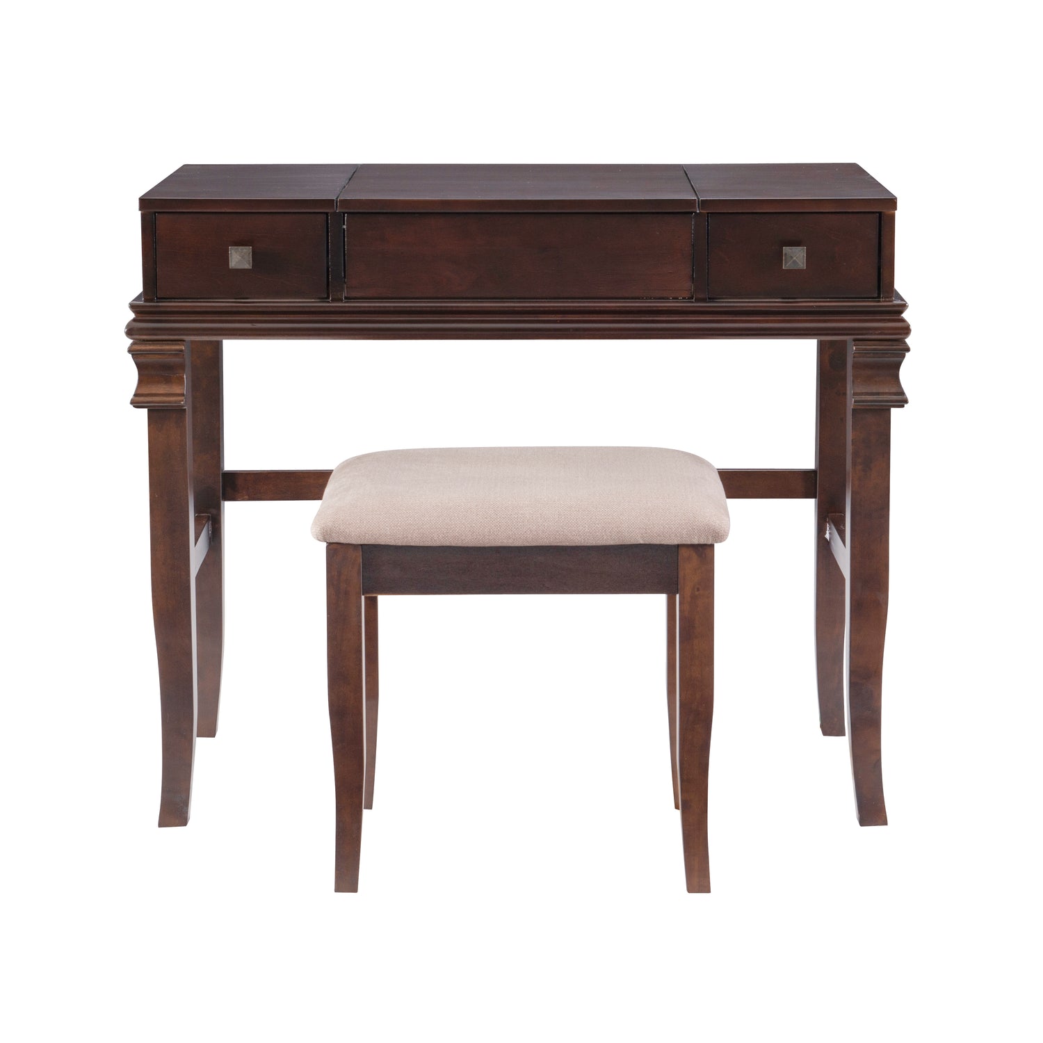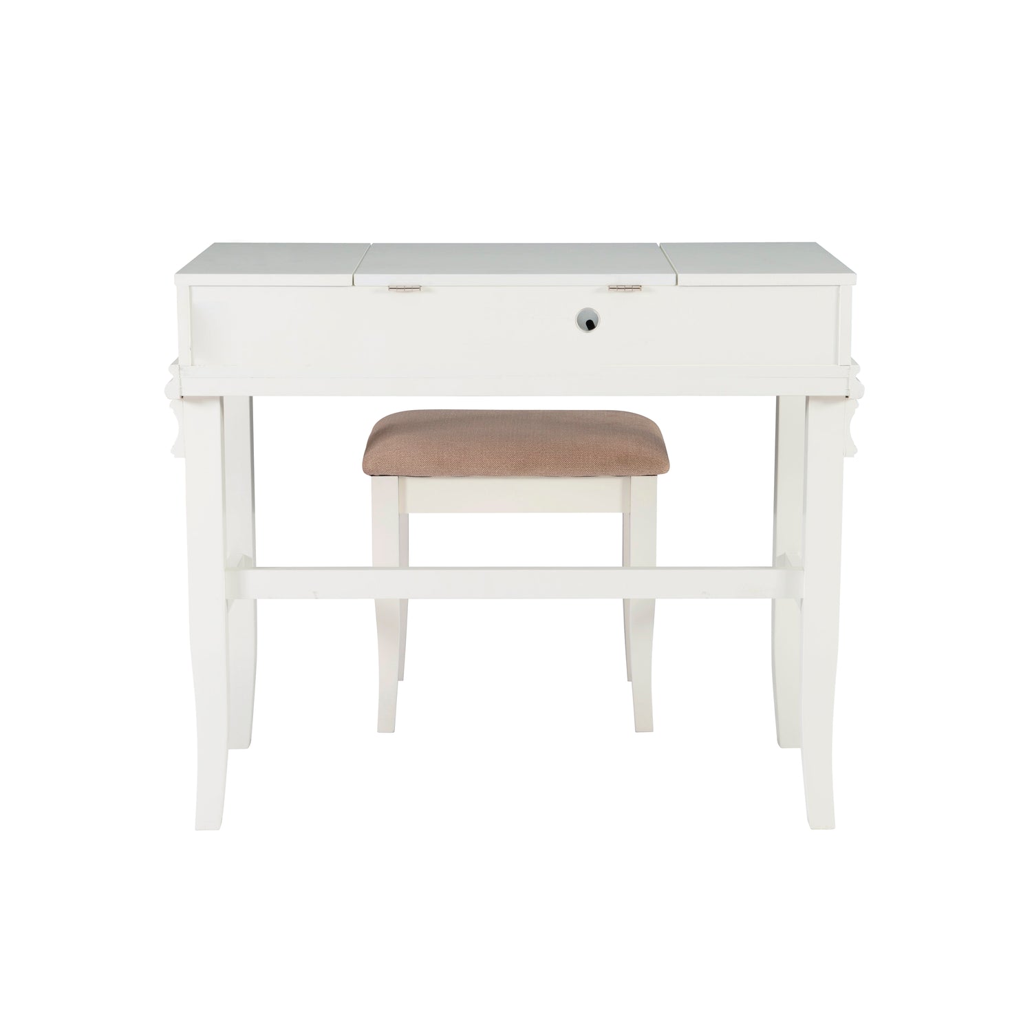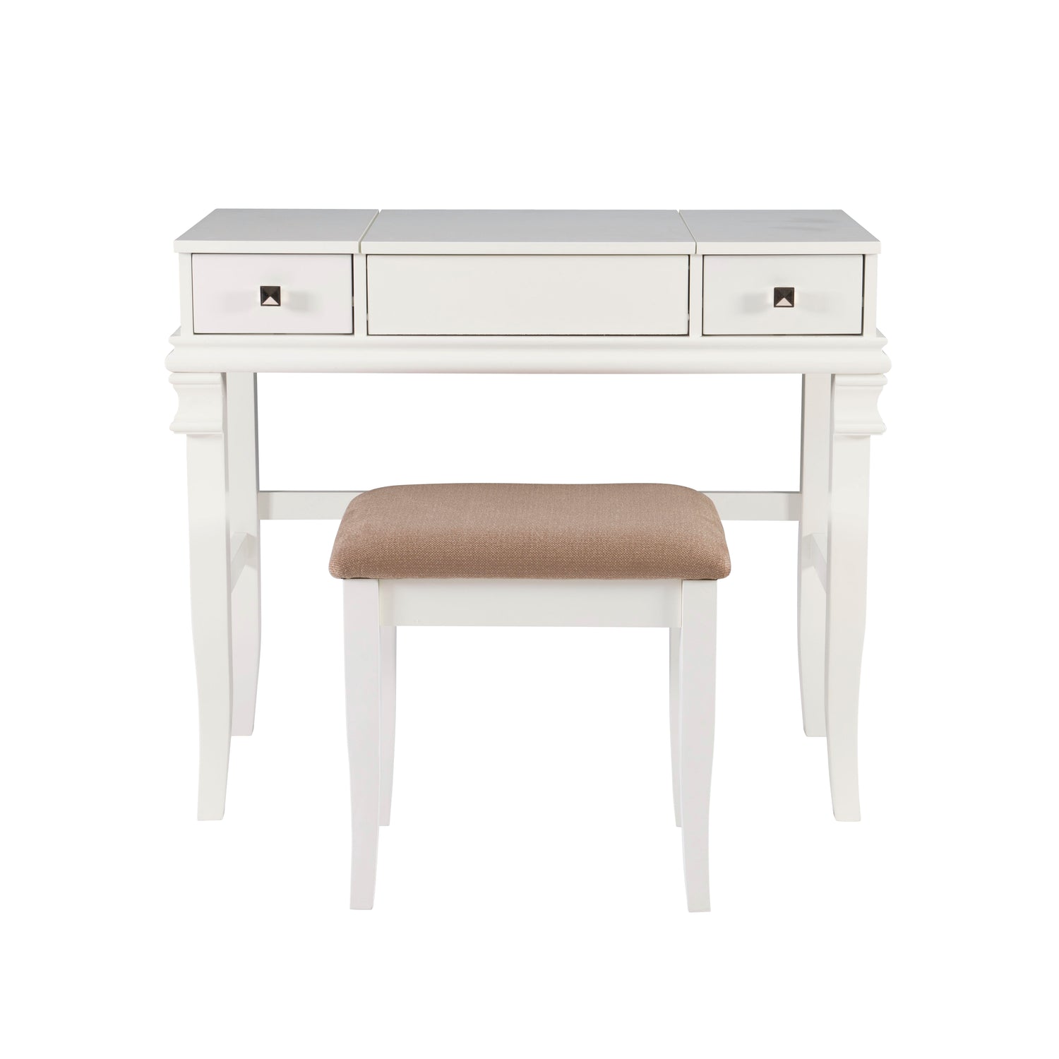 Bring timeless sophistication and practical functionality to your bedroom or dressing area with this elegant vanity set. Designed with a beautifully crafted table, a convenient flip-up mirror, spacious drawers, and a matching upholstered bench, this set is the perfect blend of style and utility. The classic design elements and neutral finishes make it easy to complement both traditional and transitional décor. With ample storage space for cosmetics, accessories, and essentials, this vanity set helps you stay organized while adding a refined touch to your home.