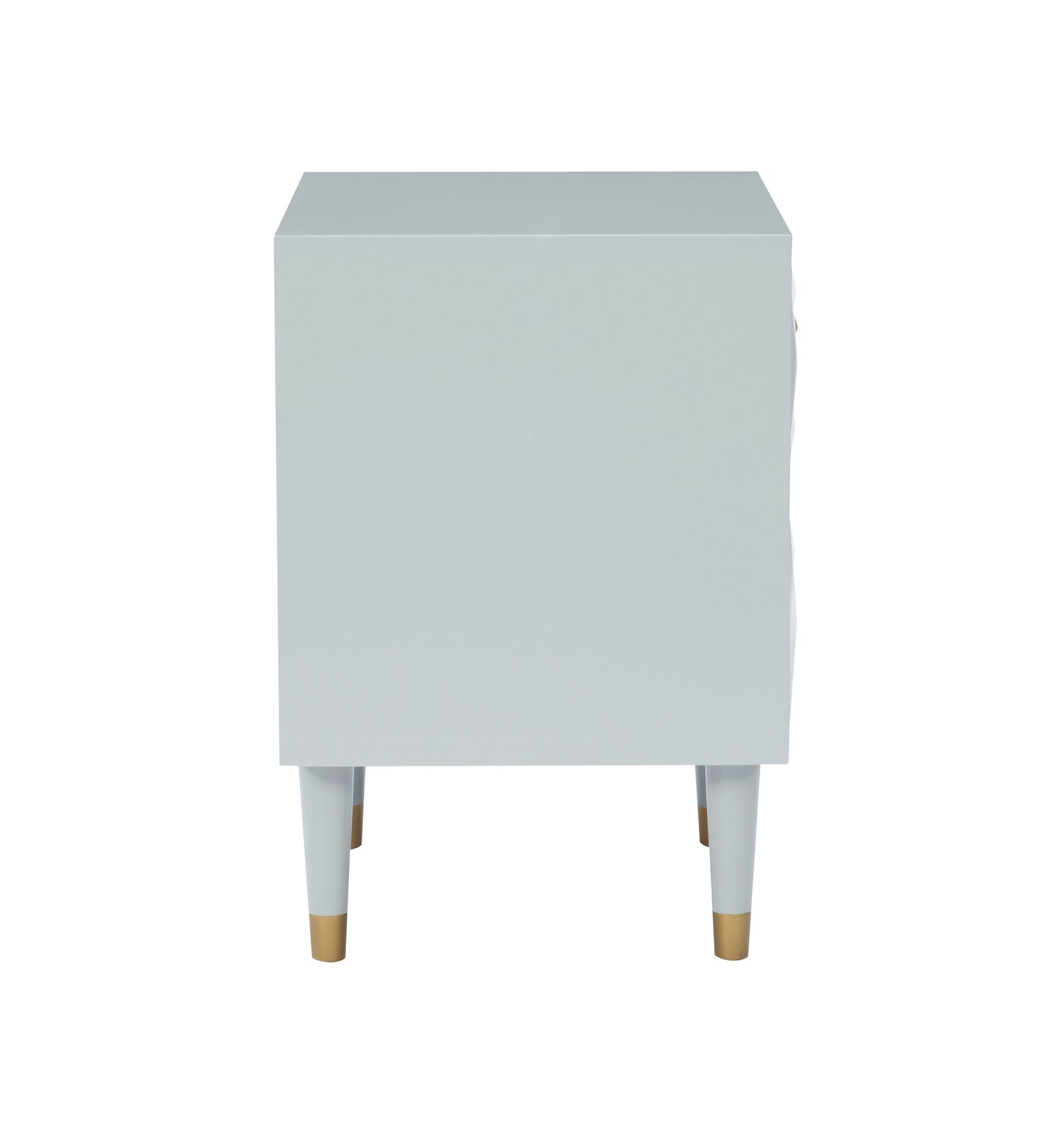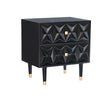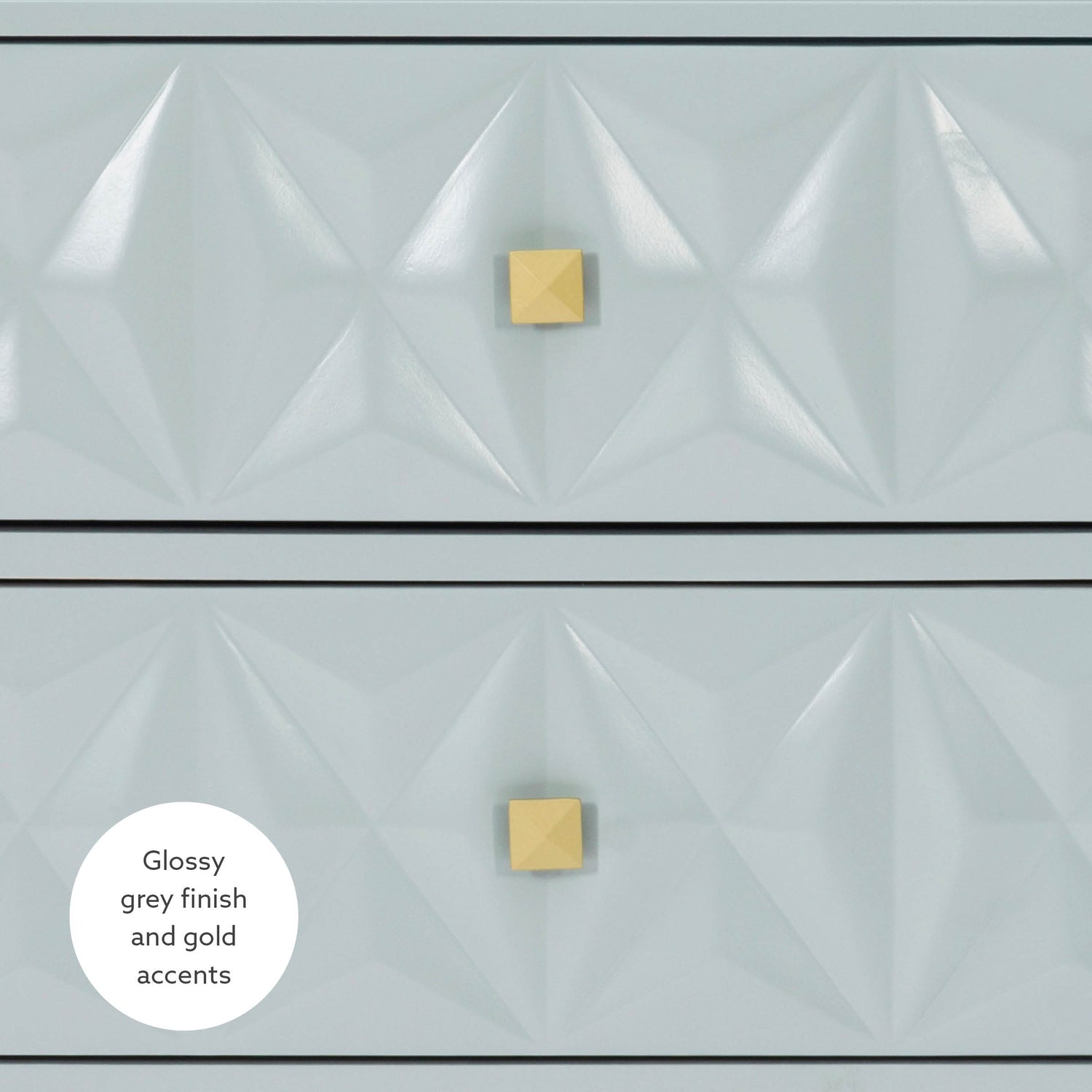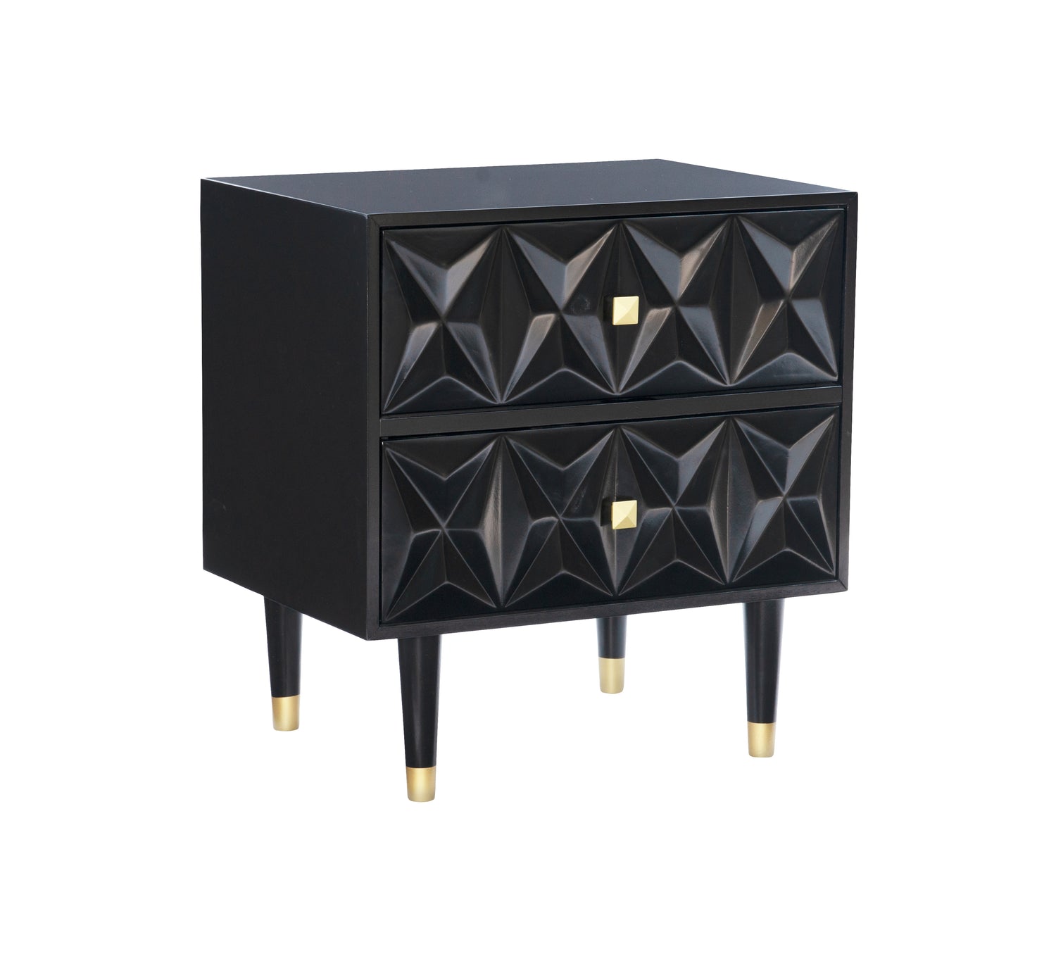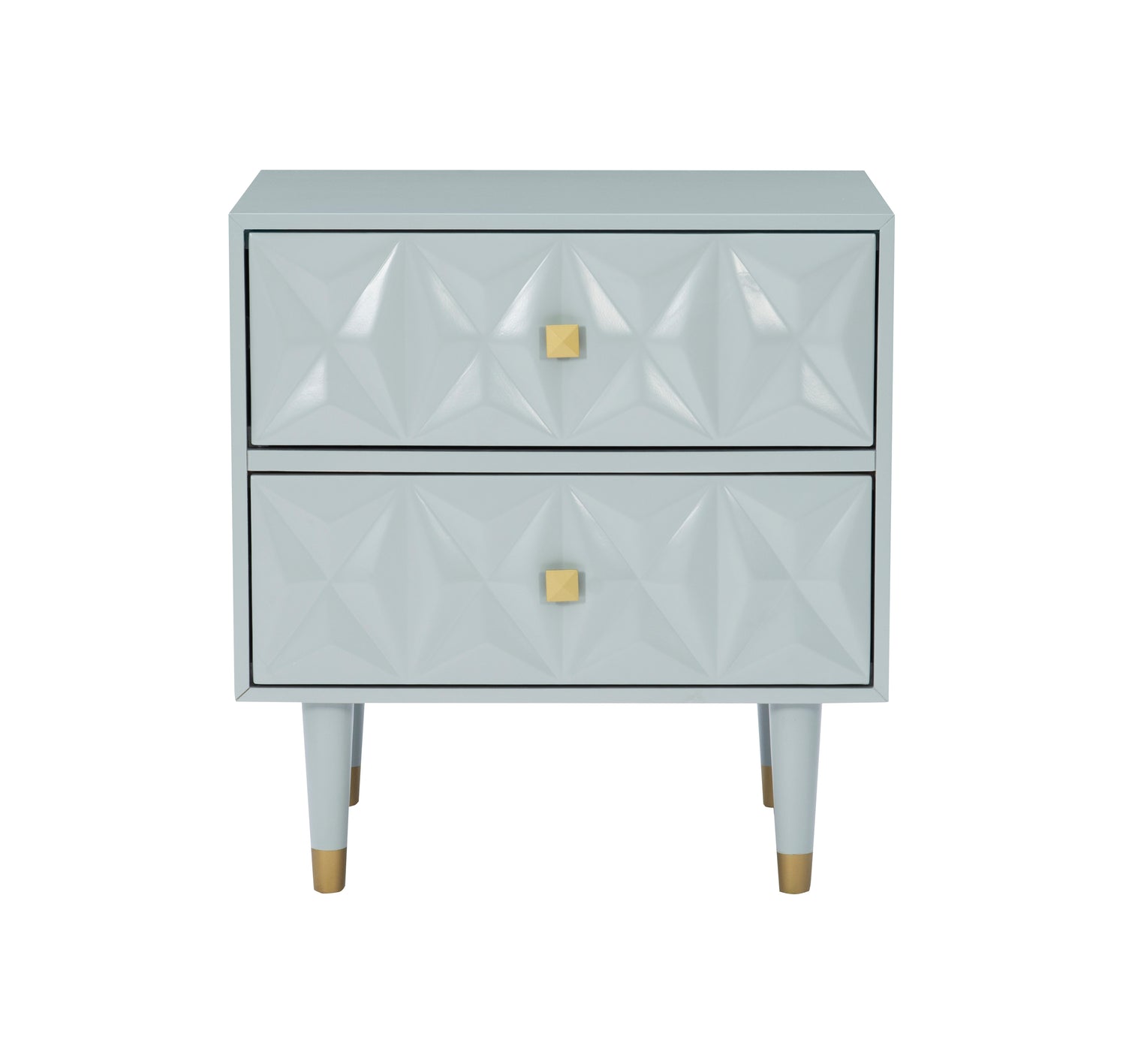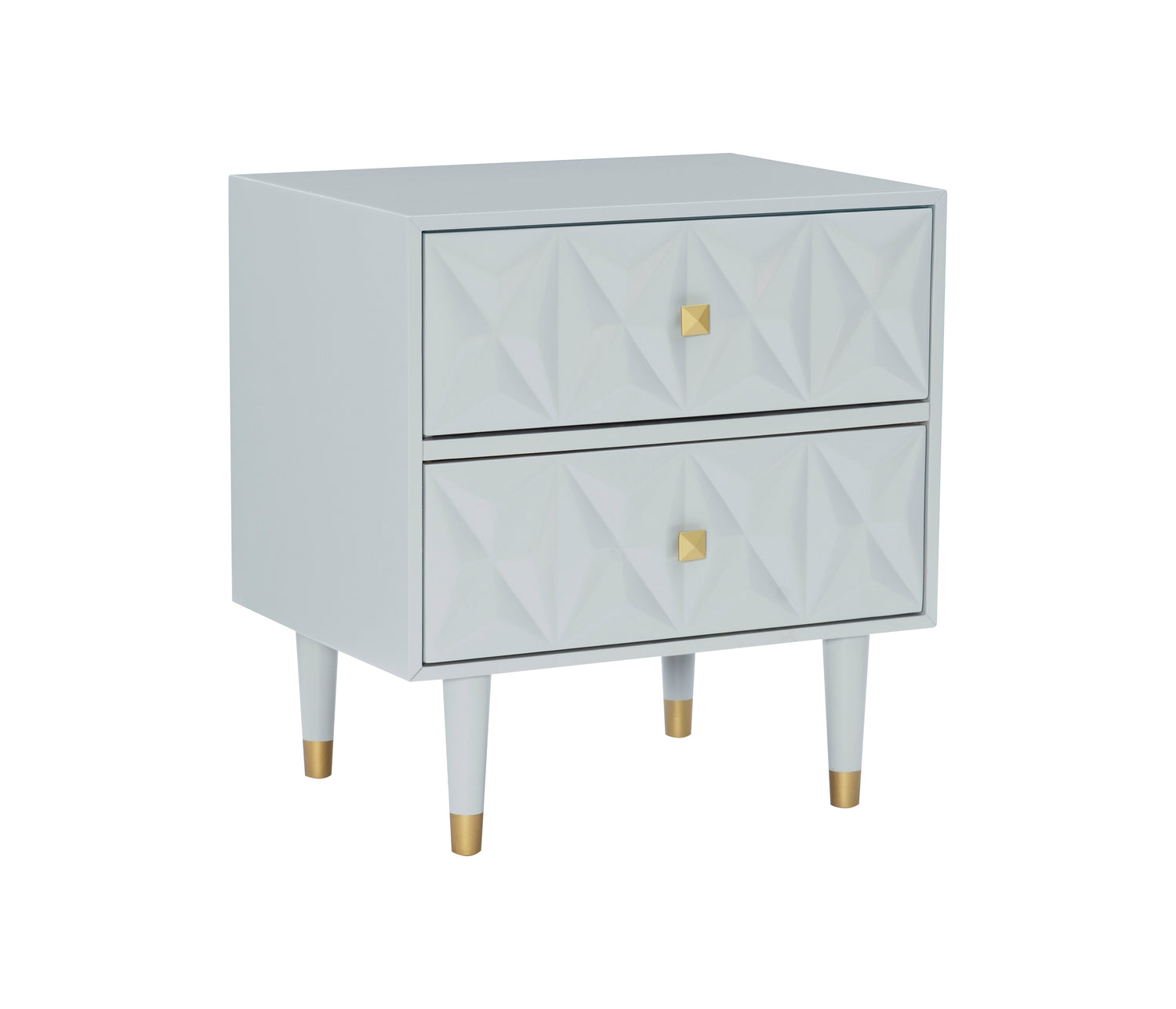With its geometric patterned front, this geometric nightstand will add texture and depth to your space. The nightstand has a full textured geometric front accented with square gold hardware and round, gold dipped legs. It is truly dressed to impress! Two deep drawers provide ample storage space for books, electronics and more. The finish allows the piece to easily be incorporated into any existing decor.