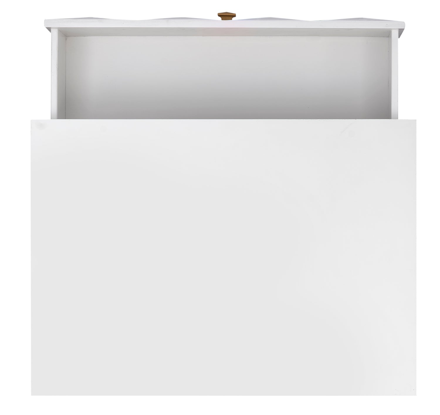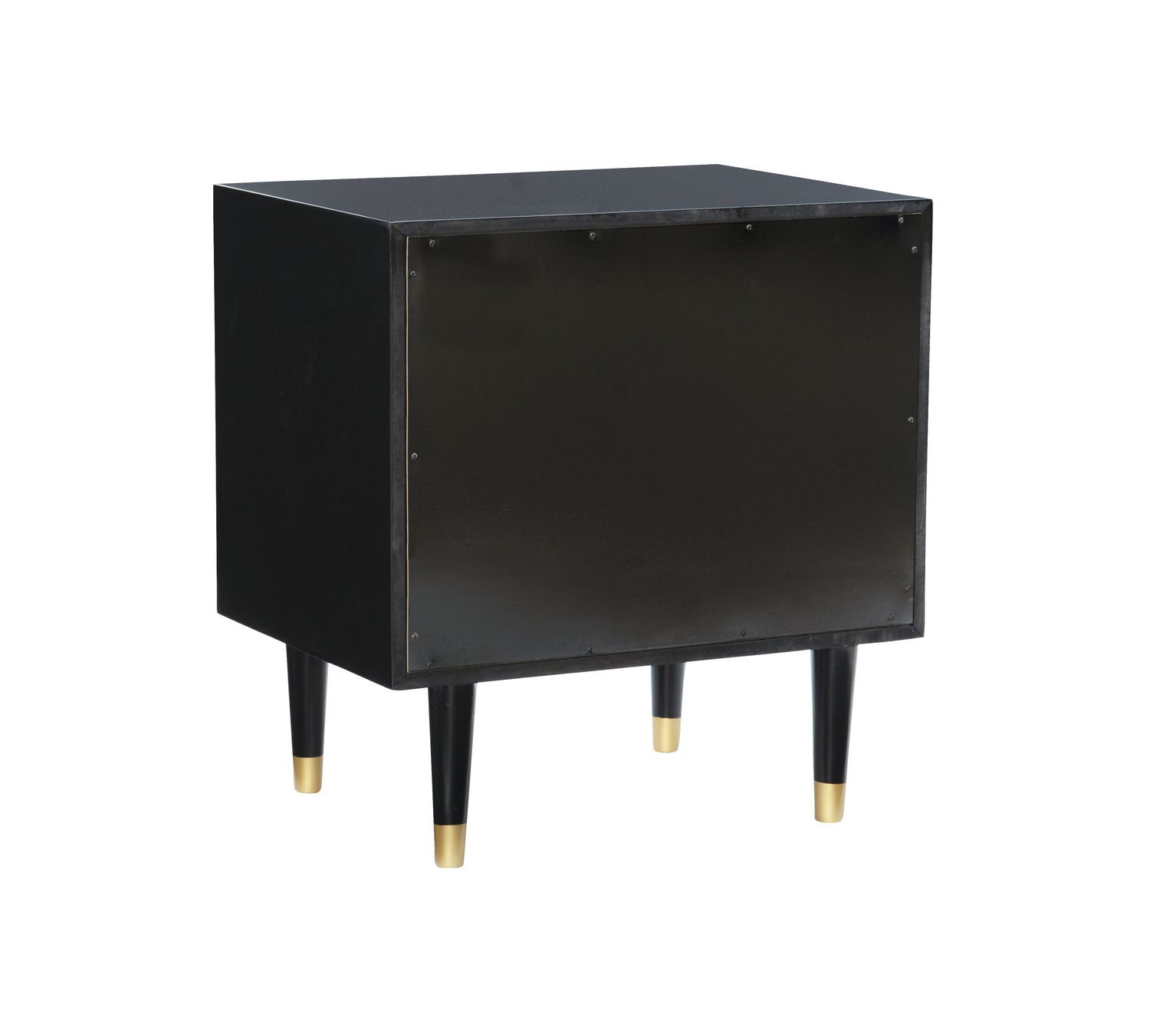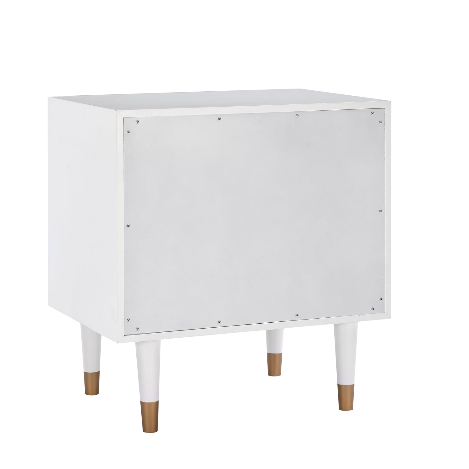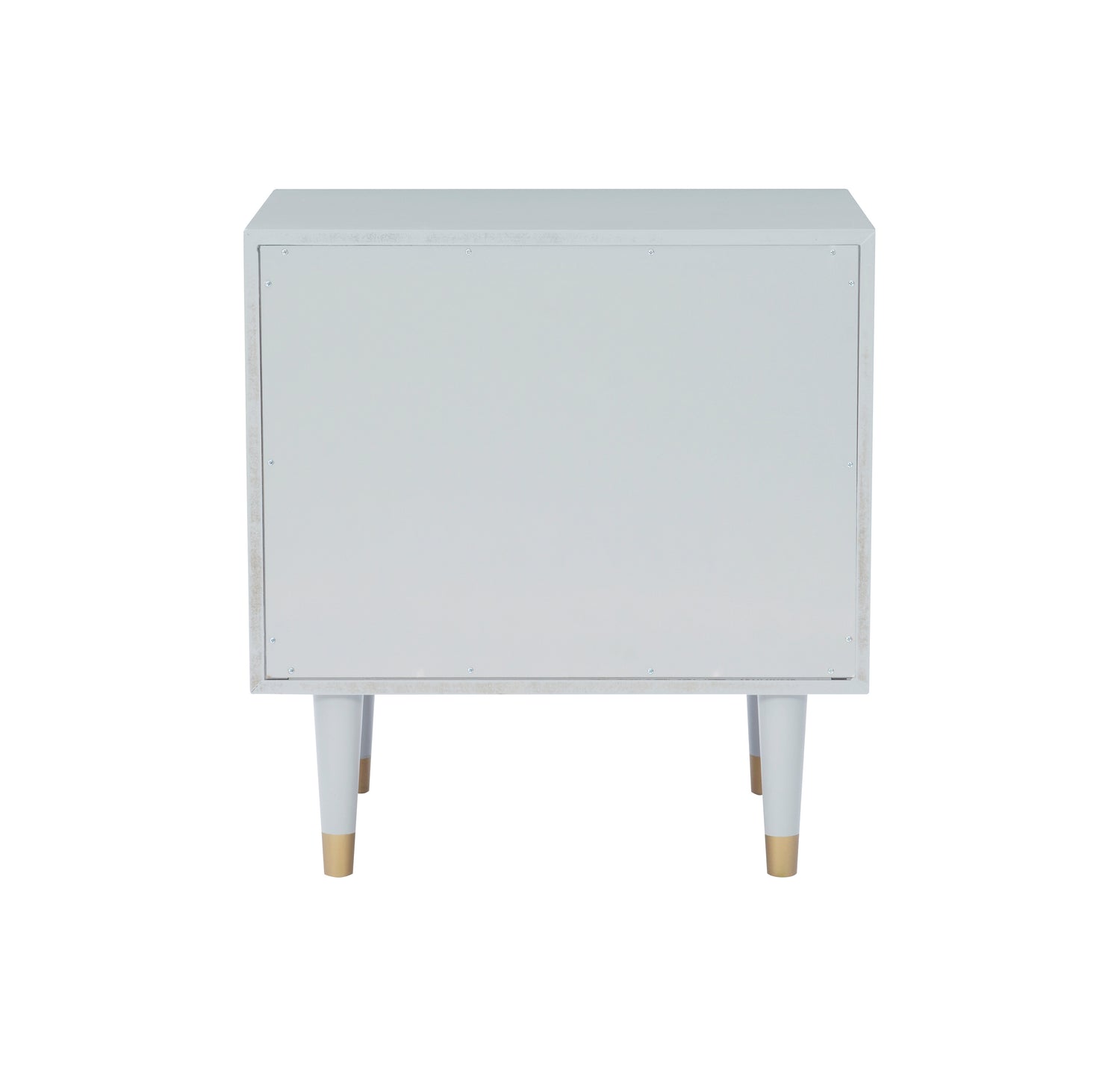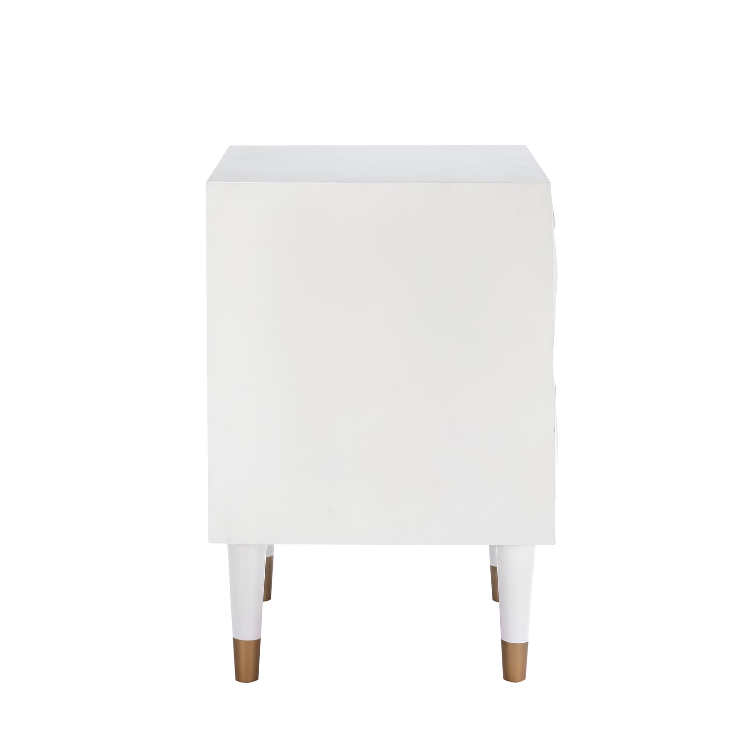 With its geometric patterned front, this geometric nightstand will add texture and depth to your space. The nightstand has a full textured geometric front accented with square gold hardware and round, gold dipped legs. It is truly dressed to impress! Two deep drawers provide ample storage space for books, electronics and more. The finish allows the piece to easily be incorporated into any existing decor.