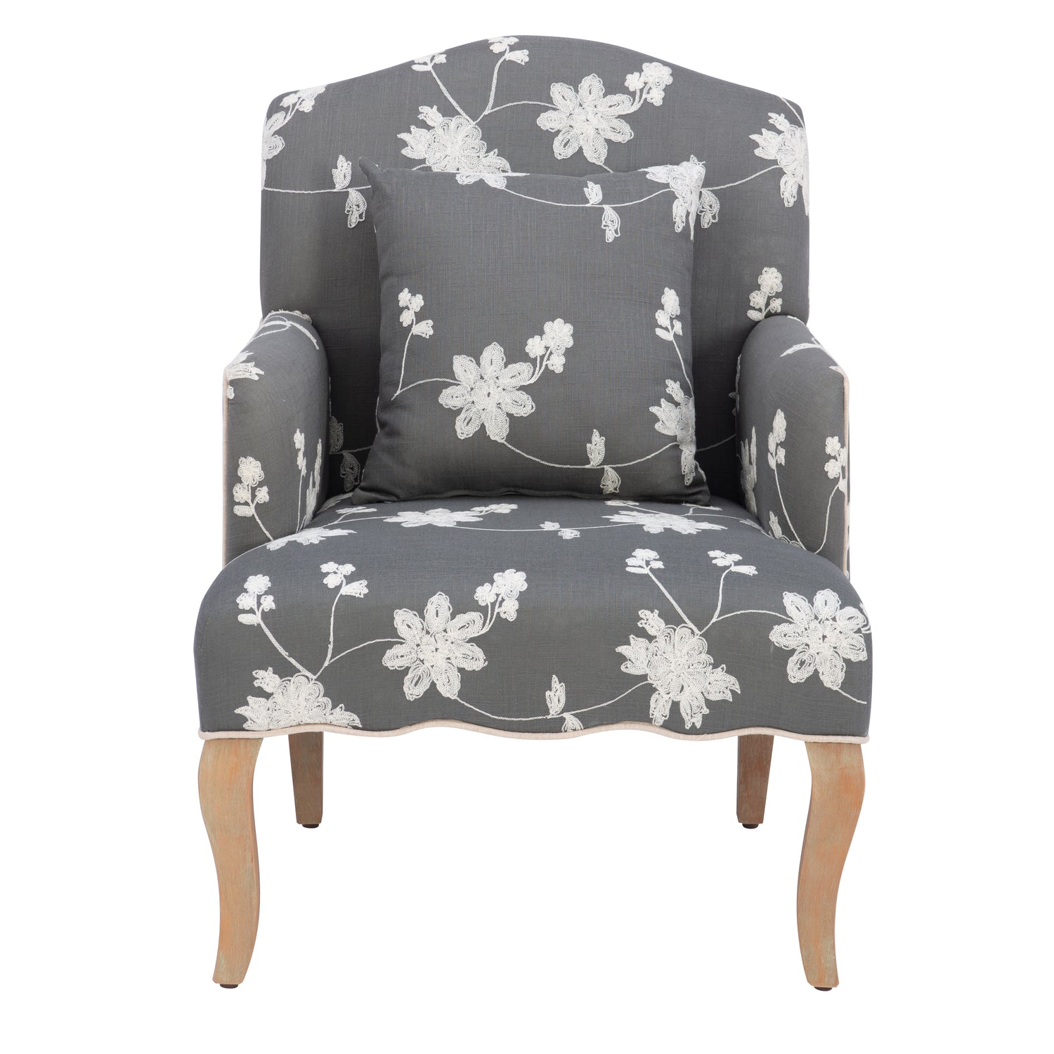 A serene retreat in any space, this accent chair was built for quiet moments of relaxation. Wrapped in a soft, floral-patterned fabric, its delicate embroidery stands out against the grey background, lending a warm, rustic character. The gently curved backrest, plush seat, and padded arms create a cozy embrace, making it the perfect spot to unwind with a book or cup of tea. Contrast piping outlines the classic silhouette, while gracefully curved cabriole legs in a lightly weathered finish add to its farmhouse charm. Complete with a matching accent pillow, this chair brings a soothing presence to any bedroom, reading nook, or living room, presenting beauty and calm in equal measure.
