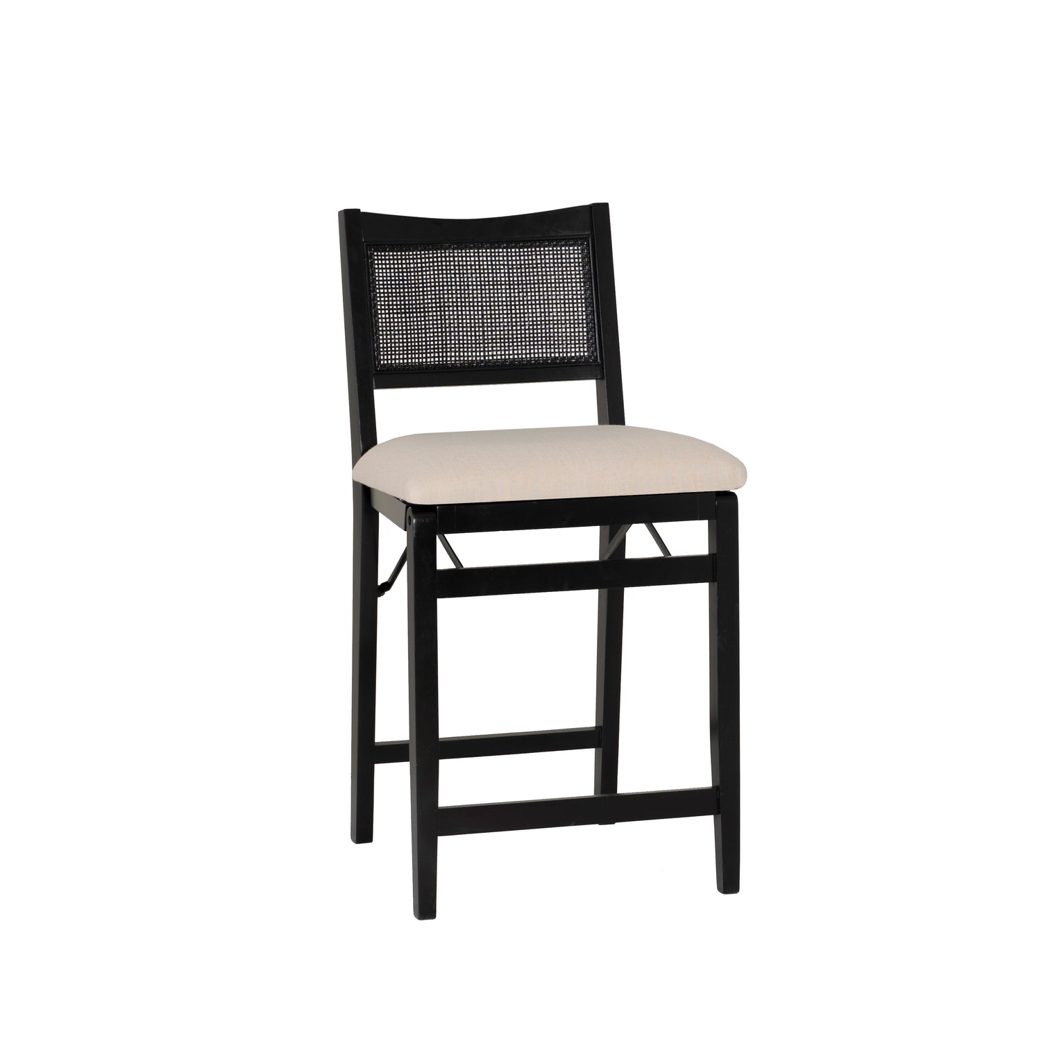 Bring sleek sophistication to your space with our Folding Counter Stool. Finished in a smooth black lacquer or natural stain, this stool features a chic cane/rattan back that adds texture and style. The comfortable cream upholstered seat, made from 100% woven polyester, offers a soft surface that's easy to clean. Perfectly sized at 20"L x 21"D x 38"H, this stool is both functional and space-saving with its folding design, making it an excellent choice for any modern kitchen or bar area.