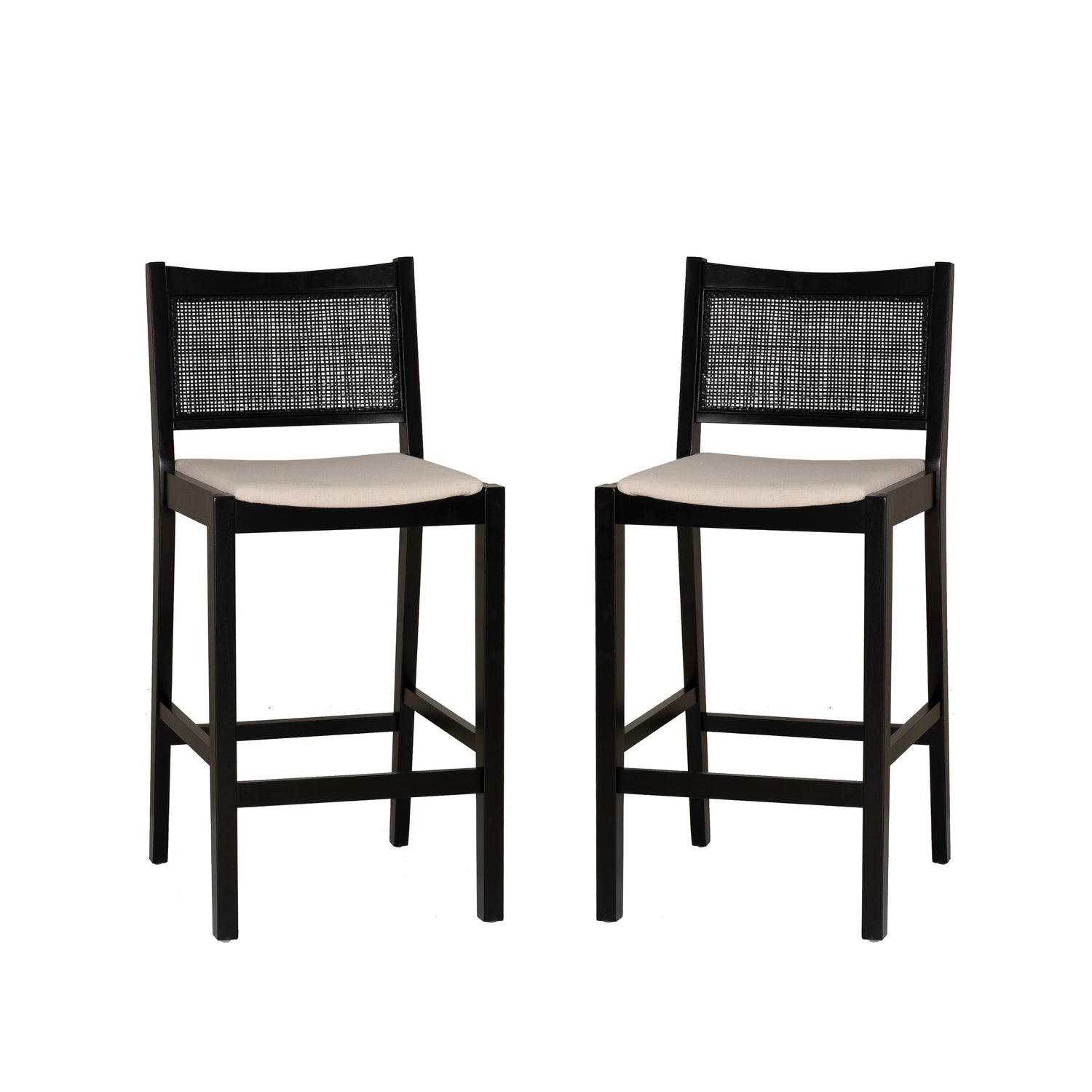 Modern comfort and style for two, please! Featuring streamlined frames in a wire-brushed finish, this pair of barstools is sure to make a sophisticated splash in your kitchen or home bar. The cane backrests introduce a unique texture and an airy feel, while the cushioned seats, upholstered in beige linen-look polyester fabric, ensure lasting comfort through long sittings. Sturdy construction and clean lines make these barstools a versatile choice, seamlessly fitting into contemporary, transitional, or even farmhouse decor. Perfect for casual meals, cocktail hour, or simply adding a touch of elegance to your home.