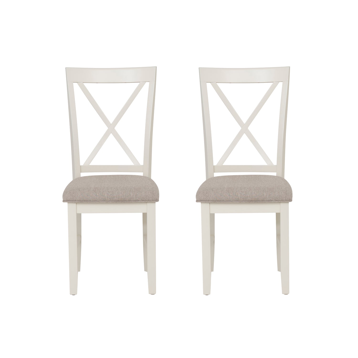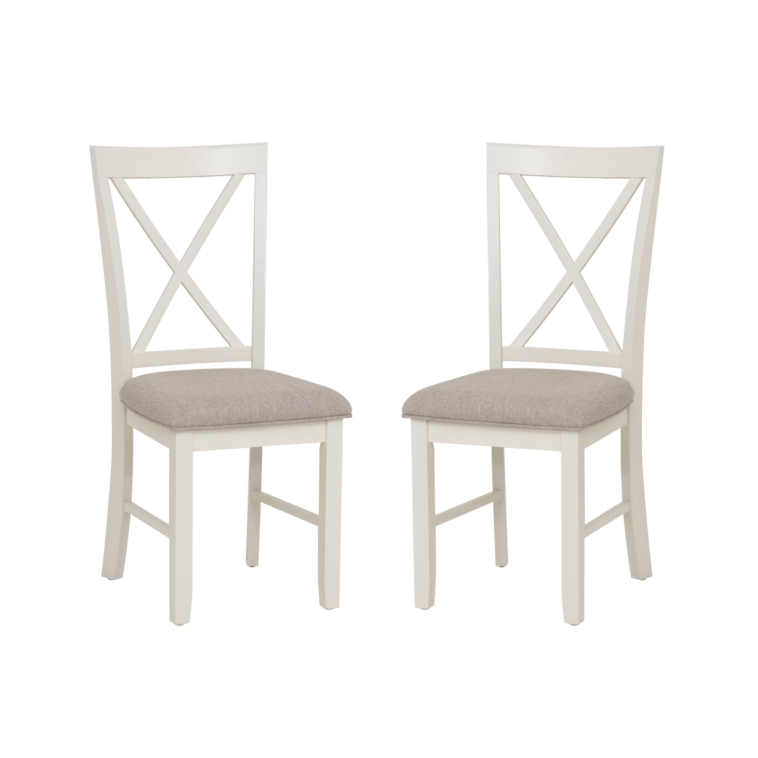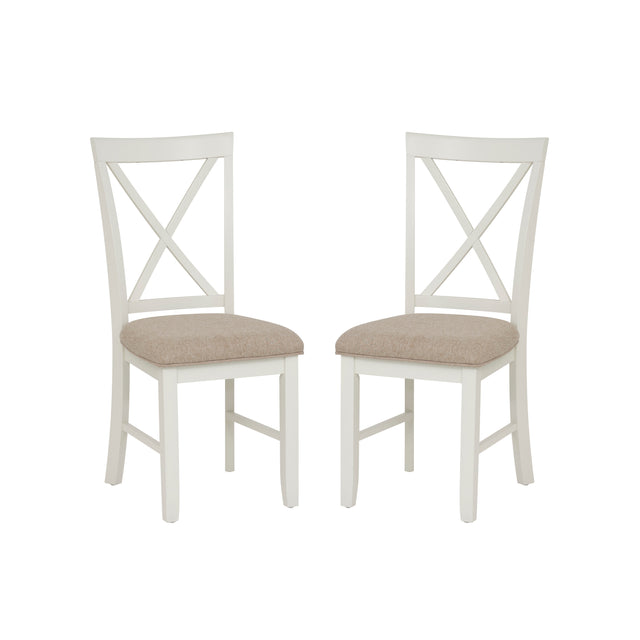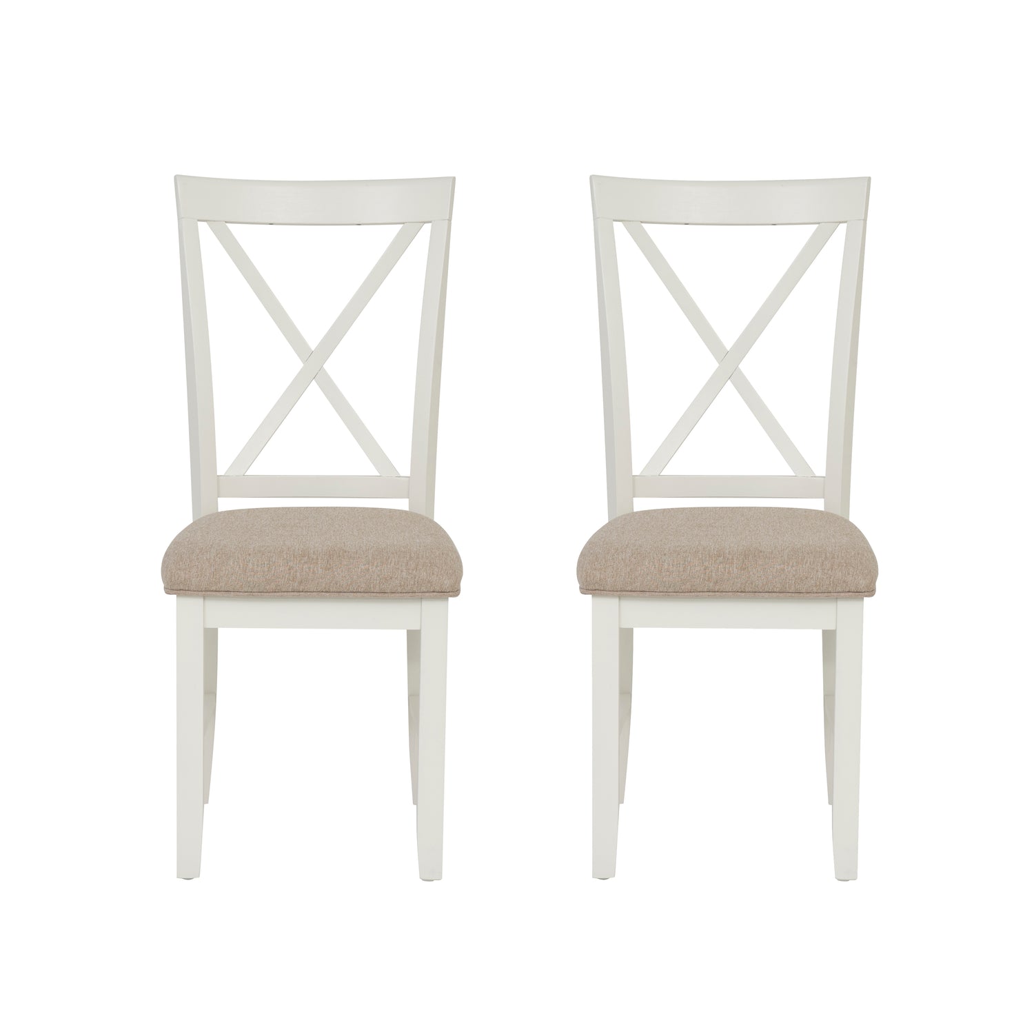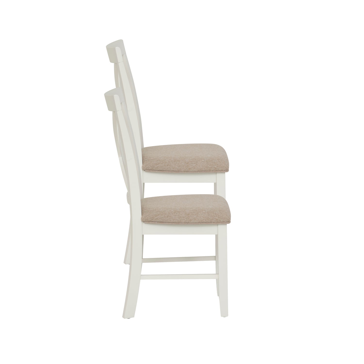 These side chairs are a beautiful complement to any room, not just around a dining table. The x-back chairs have a comfortable foam cushion and a look that can fit in with almost any style. The upholstered seats feature a solid light tan fabric made from a crosshatching construction giving it a heathered effect. As an added bonus, this fabric is performance grade meaning it is made to resist and release stains, moisture and odors. The chair frame is a gorgeous vanilla white painted finish that fits perfectly with the matching dining table and bench. Some assembly required. Easy to maintain by simply spot cleaning with a damp or dry cloth. Priced separately. Two chairs in a carton.