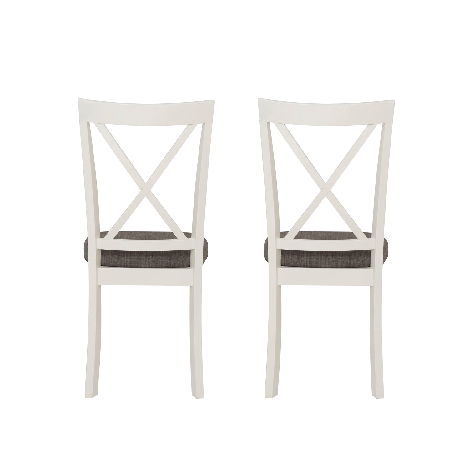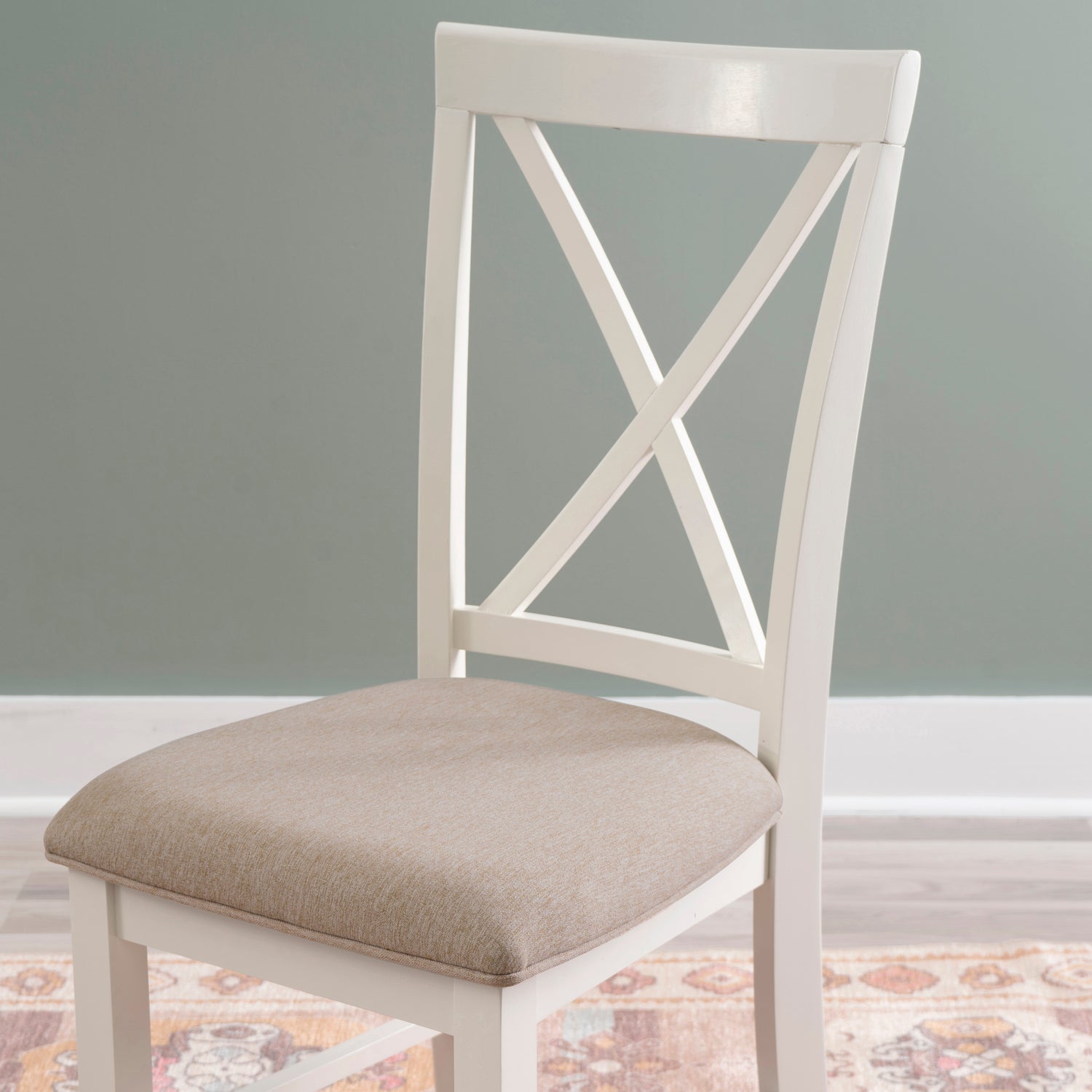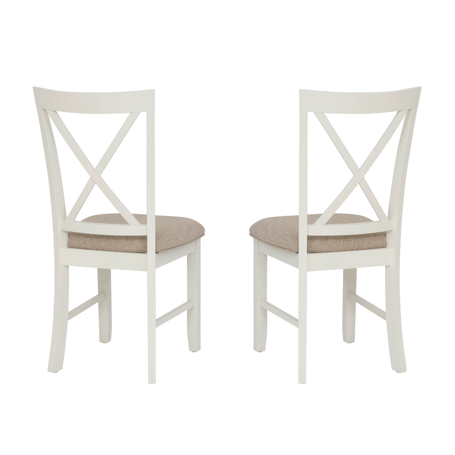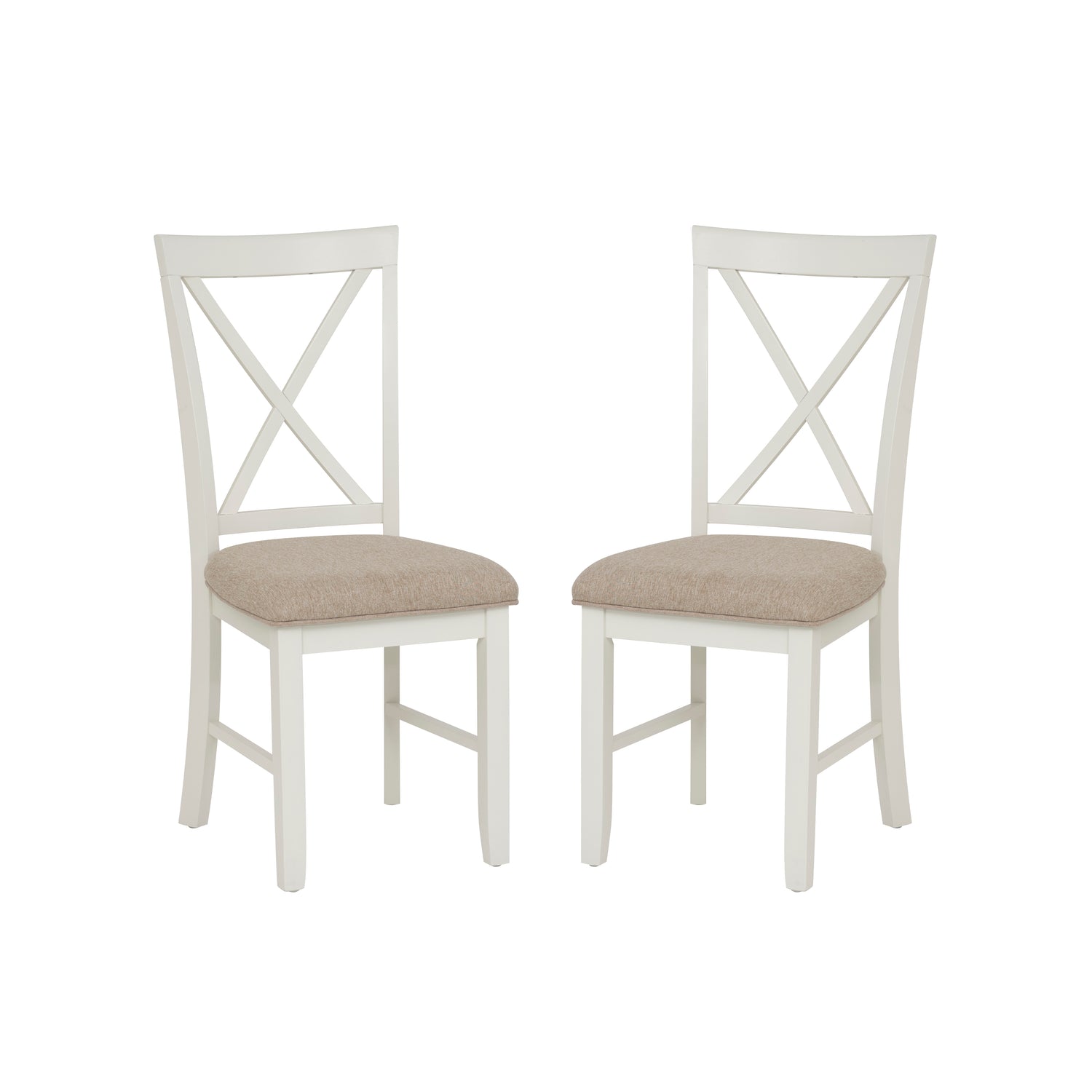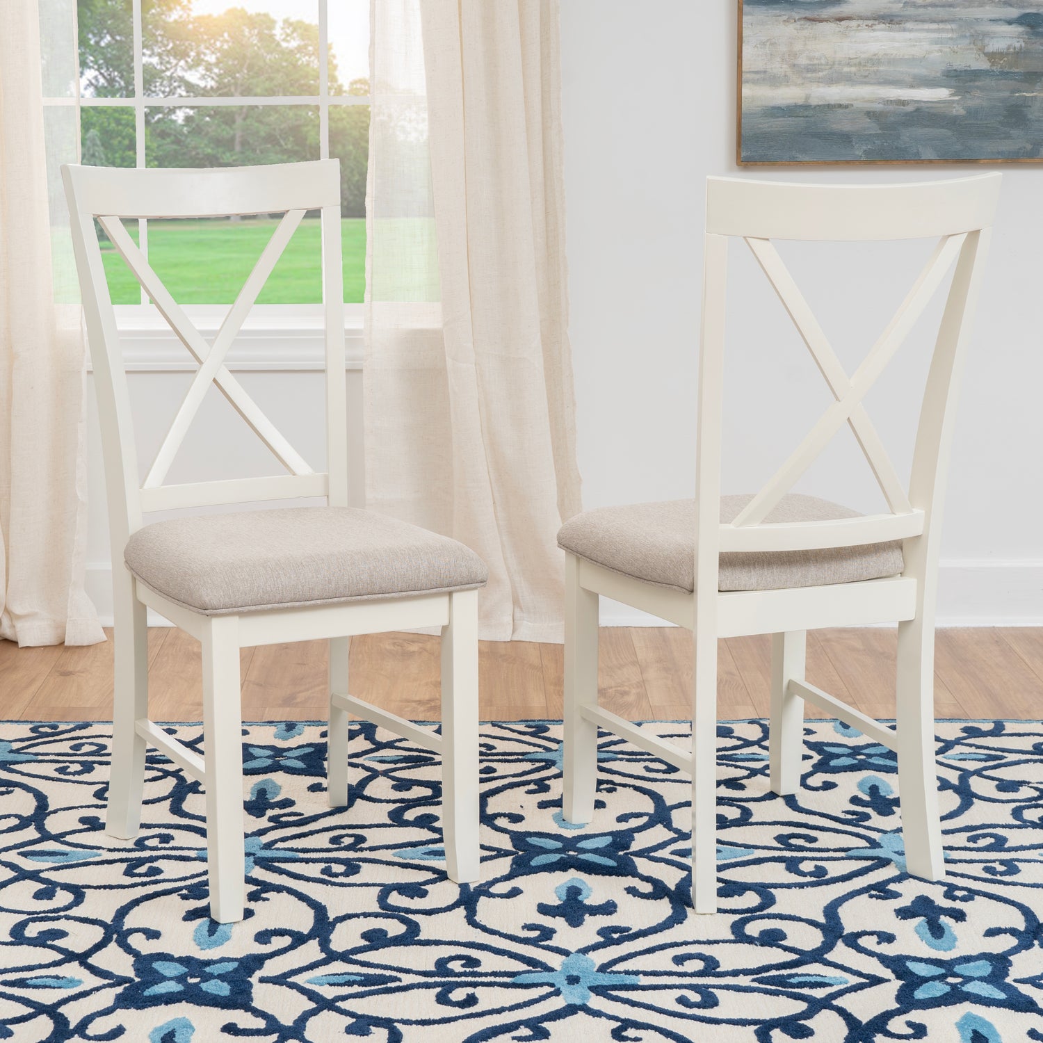 These side chairs are a beautiful complement to any room, not just around a dining table. The x-back chairs have a comfortable foam cushion and a look that can fit in with almost any style. The upholstered seats feature a solid light tan fabric made from a crosshatching construction giving it a heathered effect. As an added bonus, this fabric is performance grade meaning it is made to resist and release stains, moisture and odors. The chair frame is a gorgeous vanilla white painted finish that fits perfectly with the matching dining table and bench. Some assembly required. Easy to maintain by simply spot cleaning with a damp or dry cloth. Priced separately. Two chairs in a carton.