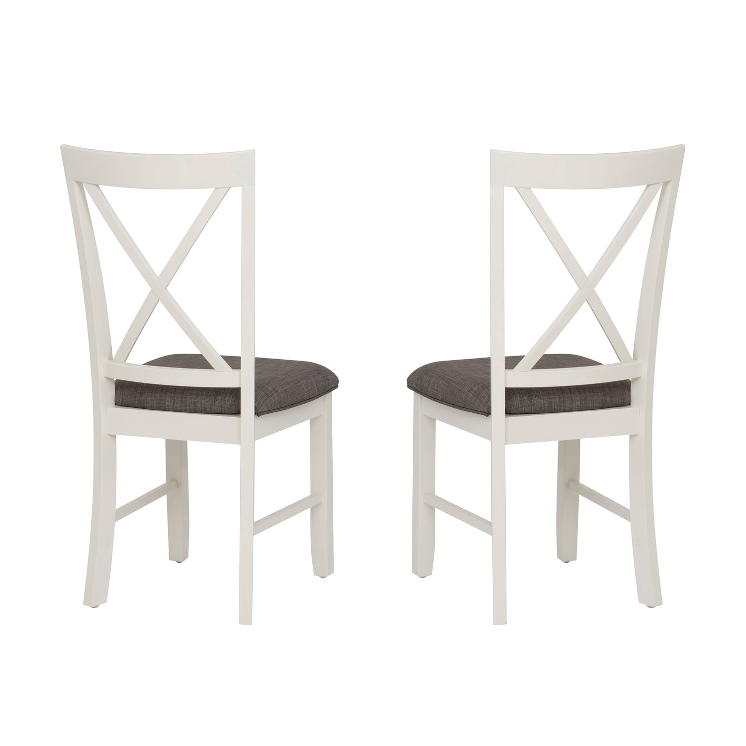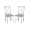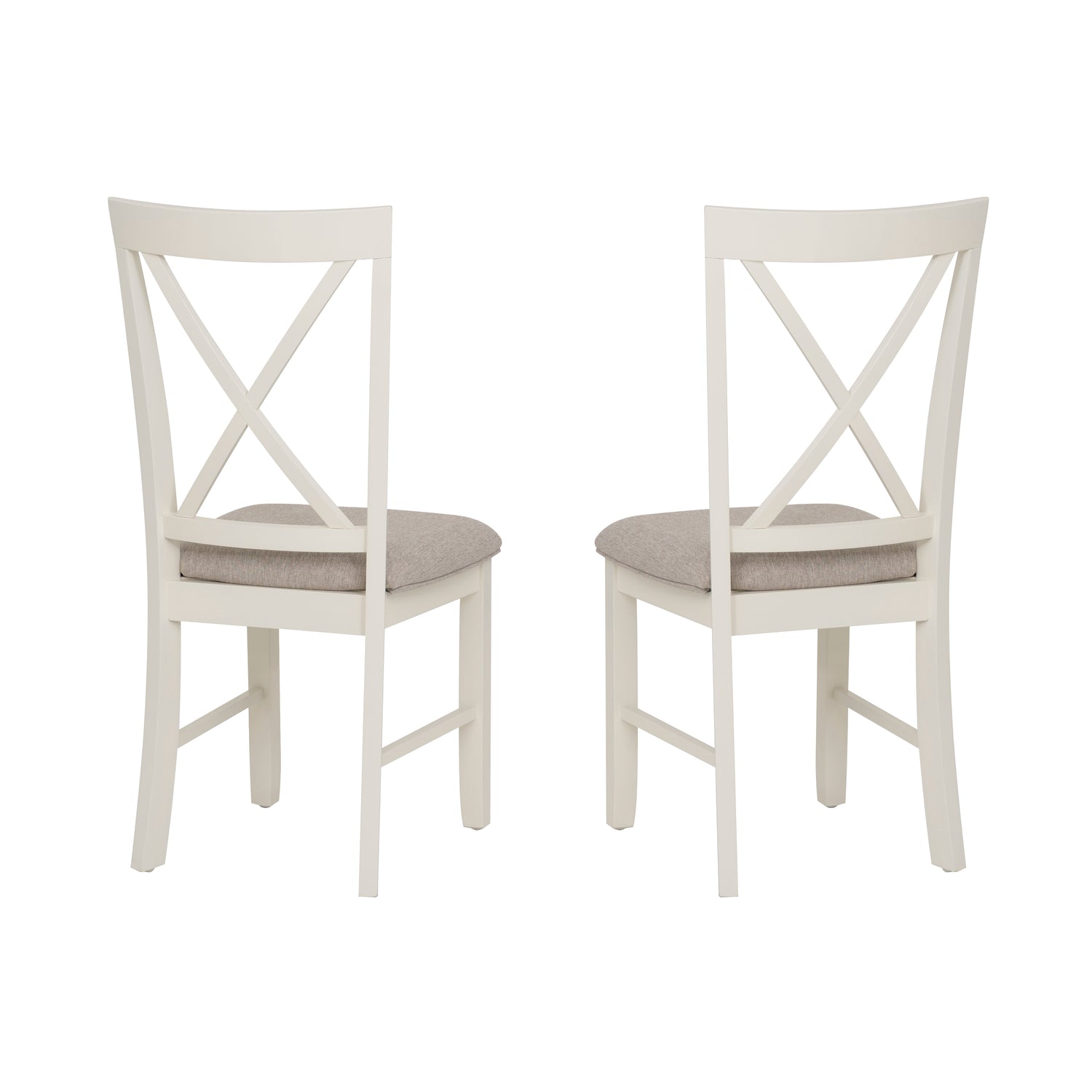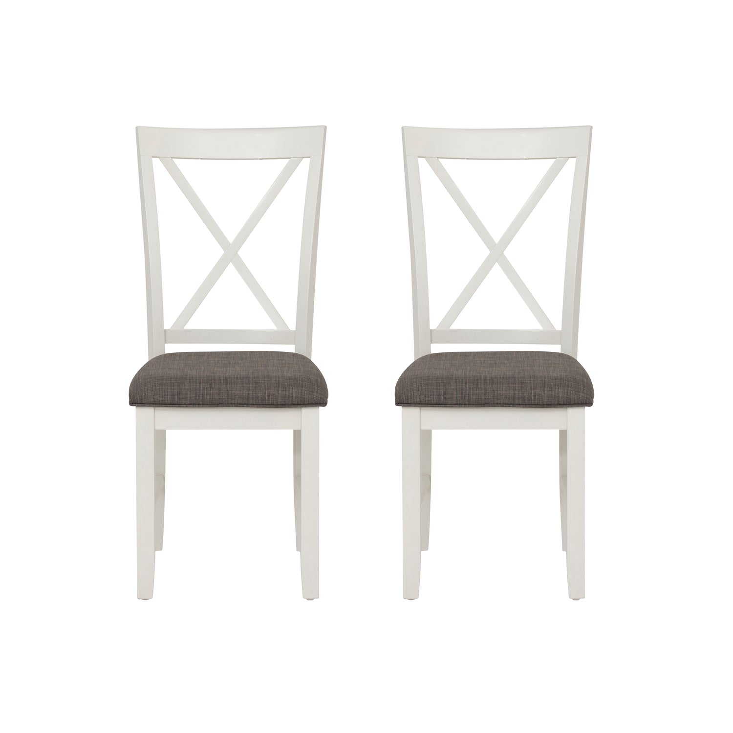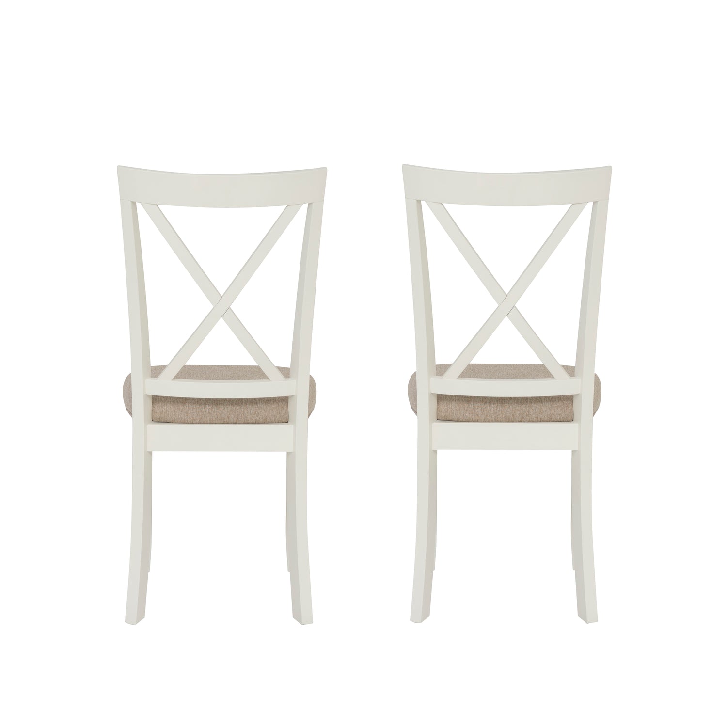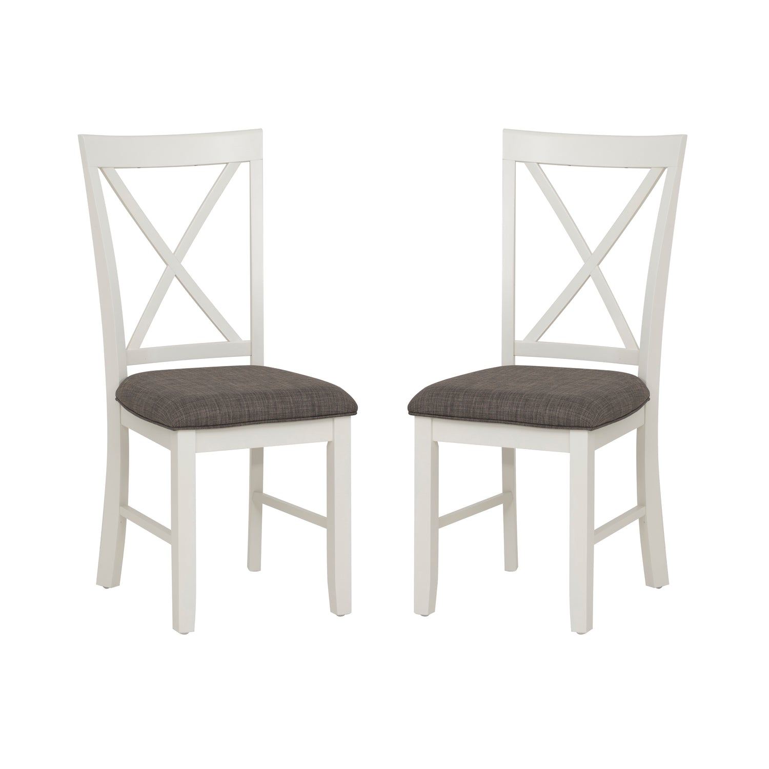 These side chairs are a beautiful complement to any room, not just around a dining table. The x-back chairs have a comfortable foam cushion and a look that can fit in with almost any style. The upholstered seats feature a solid light tan fabric made from a crosshatching construction giving it a heathered effect. As an added bonus, this fabric is performance grade meaning it is made to resist and release stains, moisture and odors. The chair frame is a gorgeous vanilla white painted finish that fits perfectly with the matching dining table and bench. Some assembly required. Easy to maintain by simply spot cleaning with a damp or dry cloth. Priced separately. Two chairs in a carton.