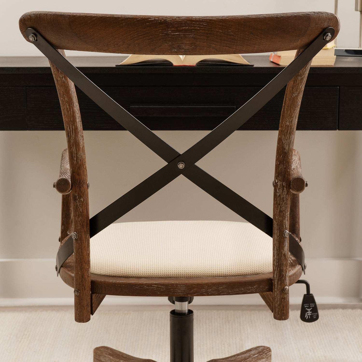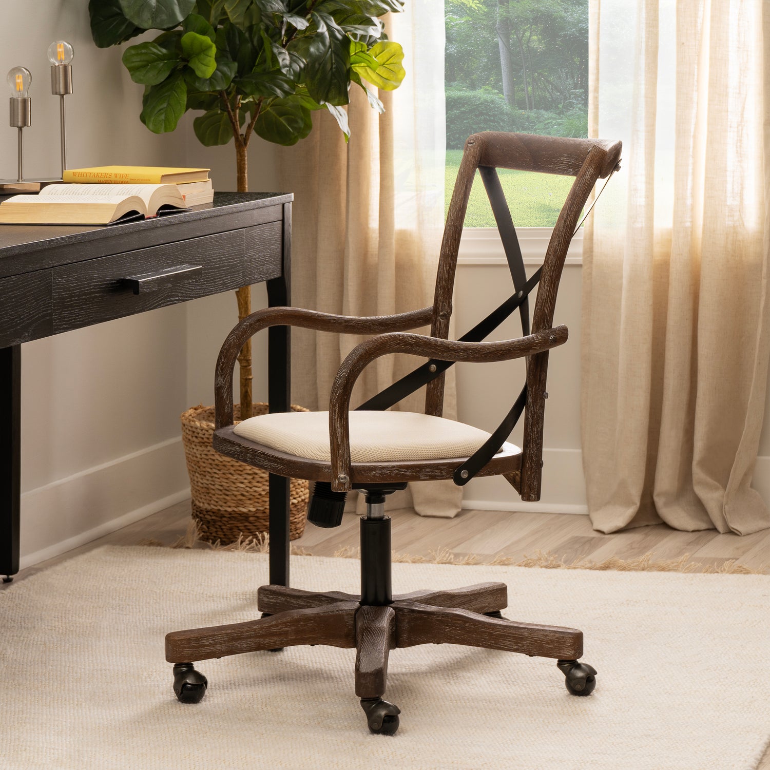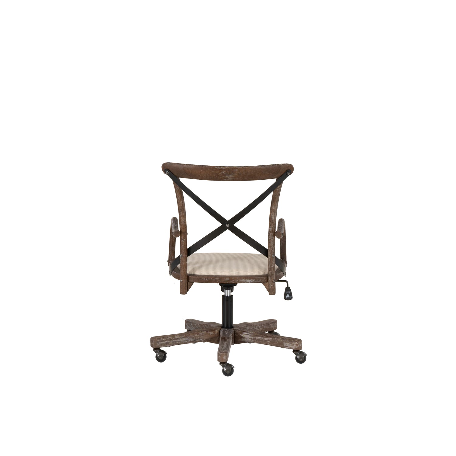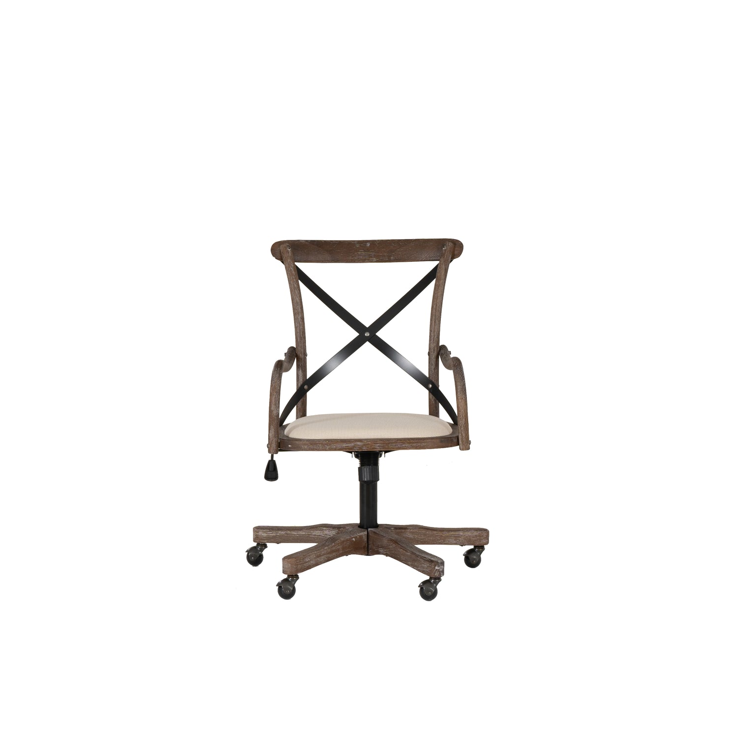 Add stylish seating to your workspace with this bentwood office chair. The gray-washed wood finish is accented by a black metal x back and neutral fabric seat. Antique brass casters make for easy mobility around your office. The adjustable seat height allows the chair to easily work with a variety of desk and table heights. Perfect for any home workspace or office.