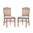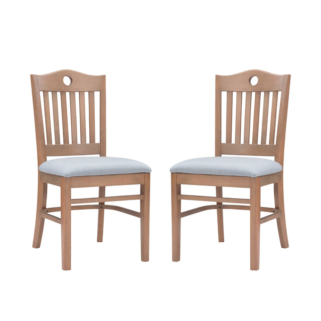 This dining chair's simple lines and soft silhouette recreate a farmhouse classic, updated for modern living. Constructed of solid beechwood for long term strength and stability, the frame style features a slat back design that pays homage to tradition and provides ample support. A dark natural finish highlights the knots and patterns in the wood grain while also ensuring resistance to liquid, chipping and flaking. This American made set of 2 arrives fully assembled, ready to make a difference in your home right out of the box. Commercial grade