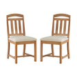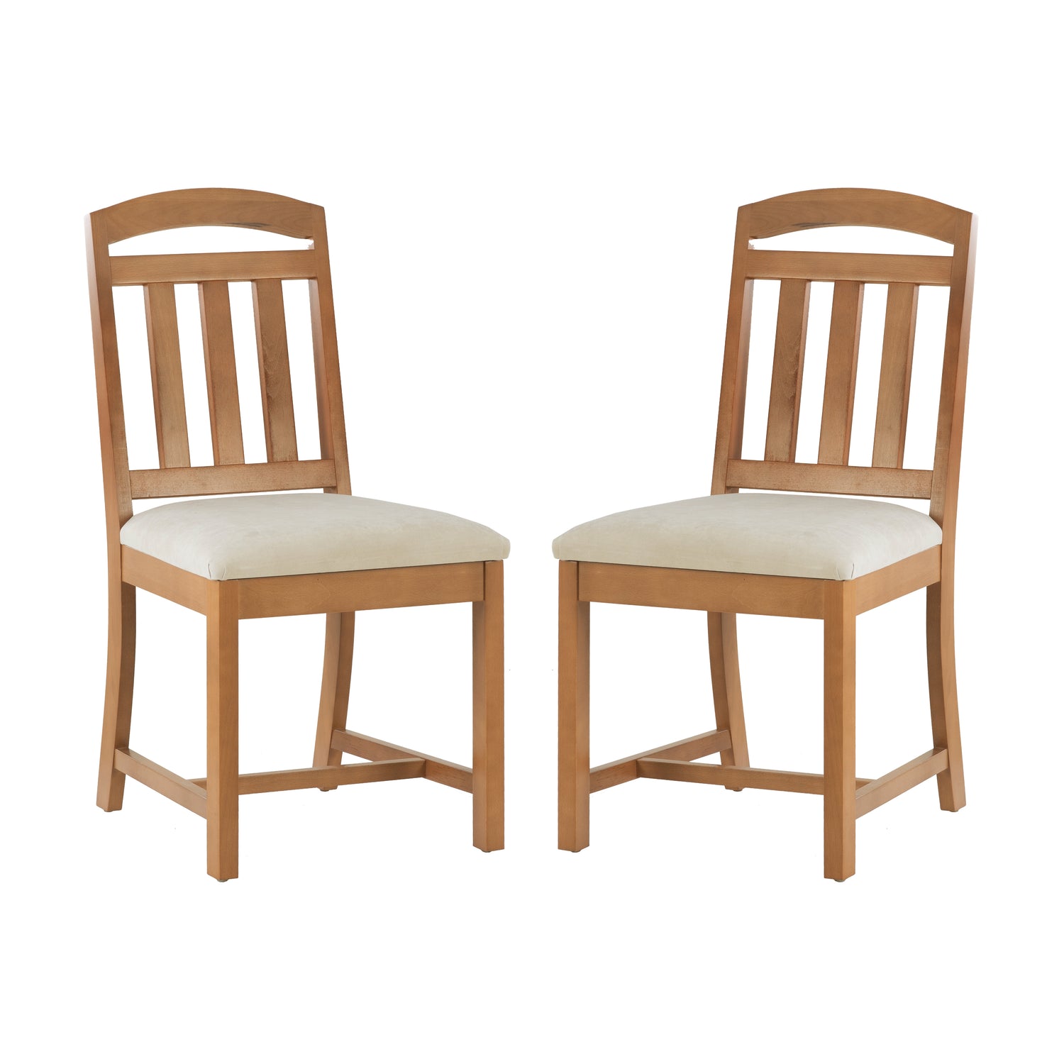 Charming and dependable, this American made dining chair offers comfort and traditional style to settings new and old. The sturdy beechwood frame features a slatted backrest with an arched top that makes for a modest yet eye catching silhouette. Suede style upholstery in a cream tone is wrapped over the padded seat, creating a muted colorway with the brown paint on the wood. Arriving fully assembled in a set of 2, this modern farmhouse pair will set the stage for an inviting kitchen or dining area. Commercial grade.