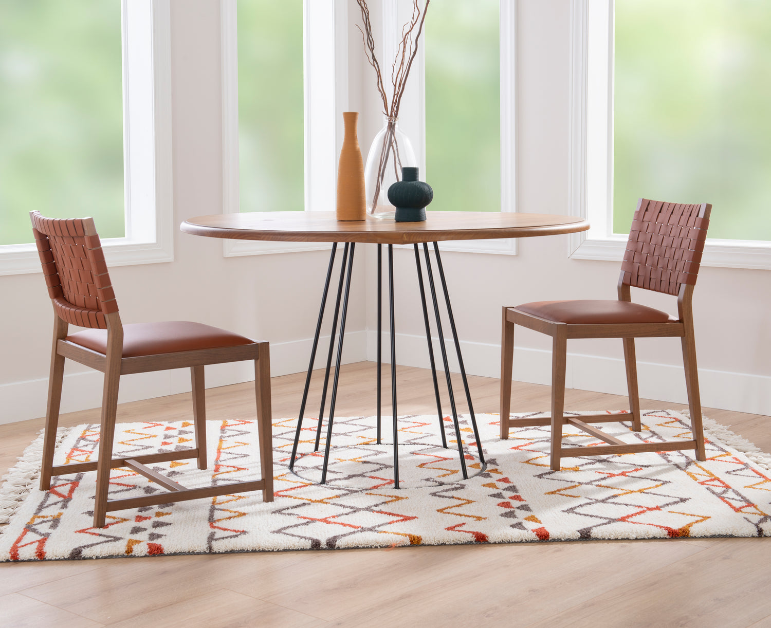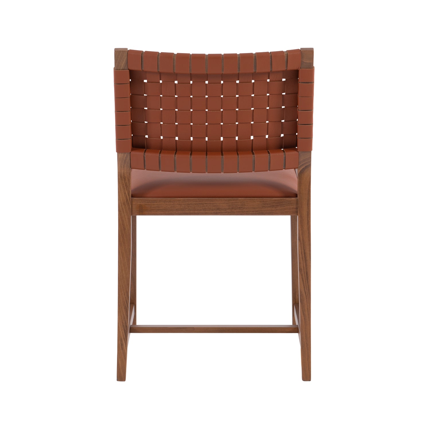 In homage to midcentury sentiments, this dining chair leans into minimalism with its clean lined silhouette and ergonomic support in the slightly angled backrest. Brown leather found in the upholstered cushion and interwoven back provides a rustic flair that blends beautifully with the warmth of the light brown stained and lacquered finish of the beechwood frame. This Italian made piece was built to last and supports up to 300 lbs, arriving fully assembled and ready to add to the inviting atmosphere of your home.