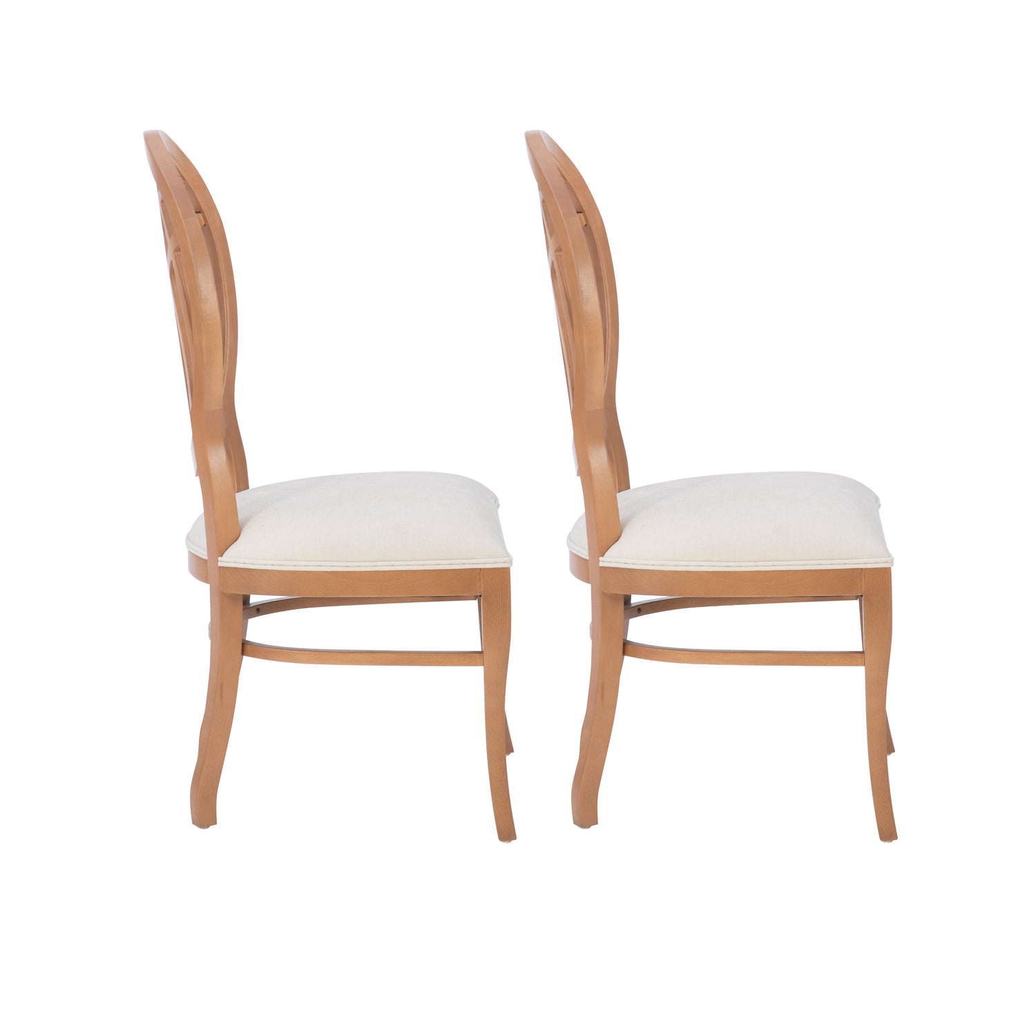 The breathtaking backrests of these dining chairs will leave an impression on guests long after they've forgotten what was served for dinner. The ornamental frames are made of solid beechwood for ensured strength and stability, and stained in a light brown finish that leaves traces of the woodgrain. A clear lacquer coating provides extra resistance against wear and tear, while foot glides protect your floors. Plush seat cushions are upholstered in neutral hues, creating an airy and elegant two toned colorway. The set of two arrives fully assembled.
