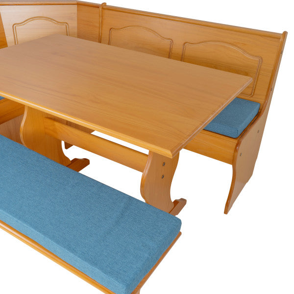 Create a cozy spot for meals and conversation in any corner of the kitchen. The rich honey pine finish on this corner nook provides a traditional look to this highly functional piece. The nook corner bench and nook free-standing bench seats five people comfortably. You can determine the direction of the corner unit during nook assembly. Comes complete with a 4 piece blue or beige fabric cushion set to make this into a great family gathering place in an kitchen, dining room or breakfast nook.