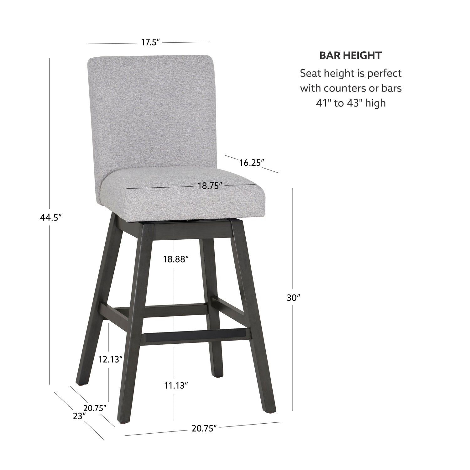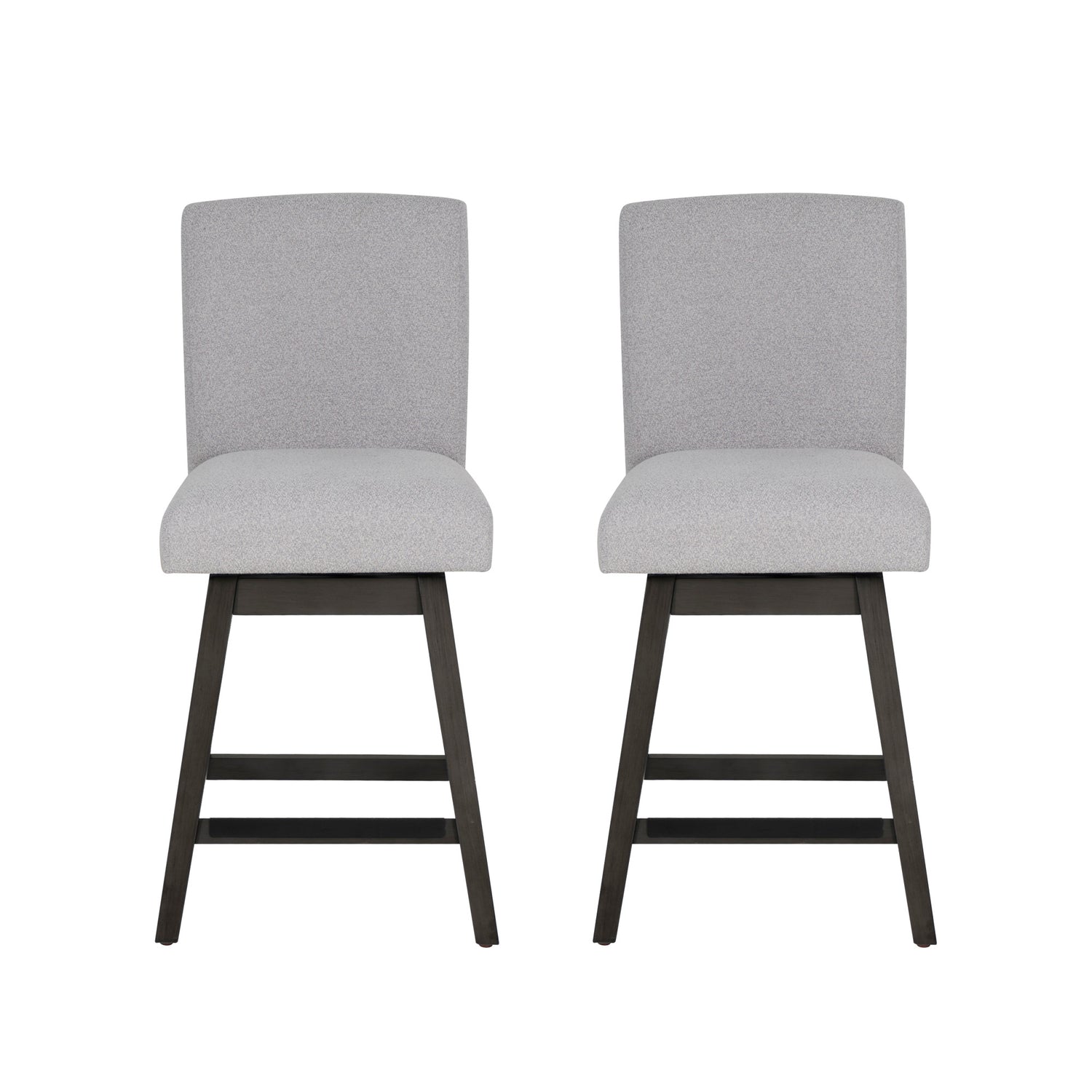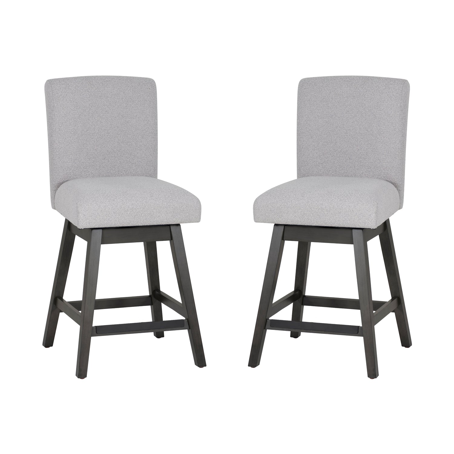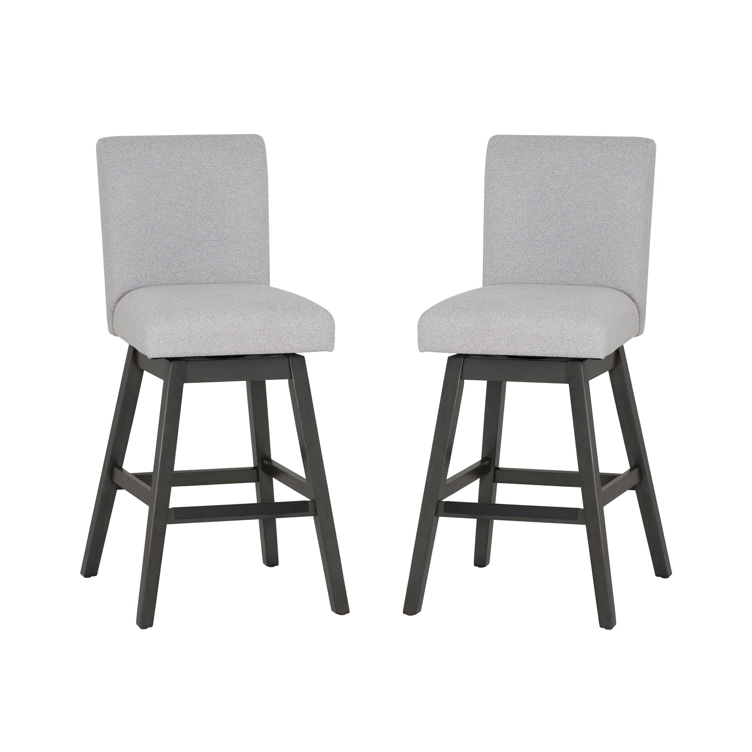 Elevate your dining or kitchen space with this set of two elegant stools. Crafted from durable rubberwood and finished with a rich brown lacquer, these stools offer both style and protection. They feature a solid backrest, built-in footrest, and gray woven polyester upholstery for lasting comfort. The 180-degree swivel provides effortless functionality, making them perfect for casual meals or entertaining. Designed for bars 40" to 44" high, each bar stool measures 20.75" L x 23" D x 44.5" H and assembles with ease, bringing timeless elegance and everyday practicality to your home. The counter stools are designed for bars 35" to 39" high, and measure 19.5" L x 22.5" D x 41" H.