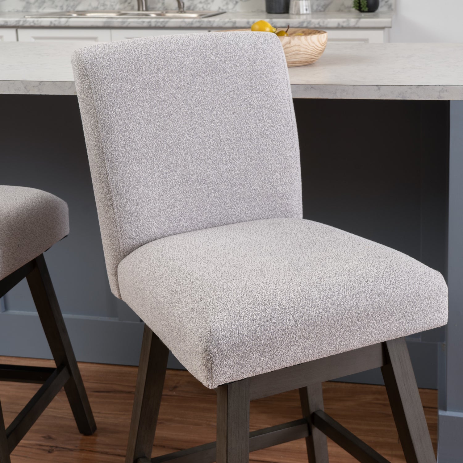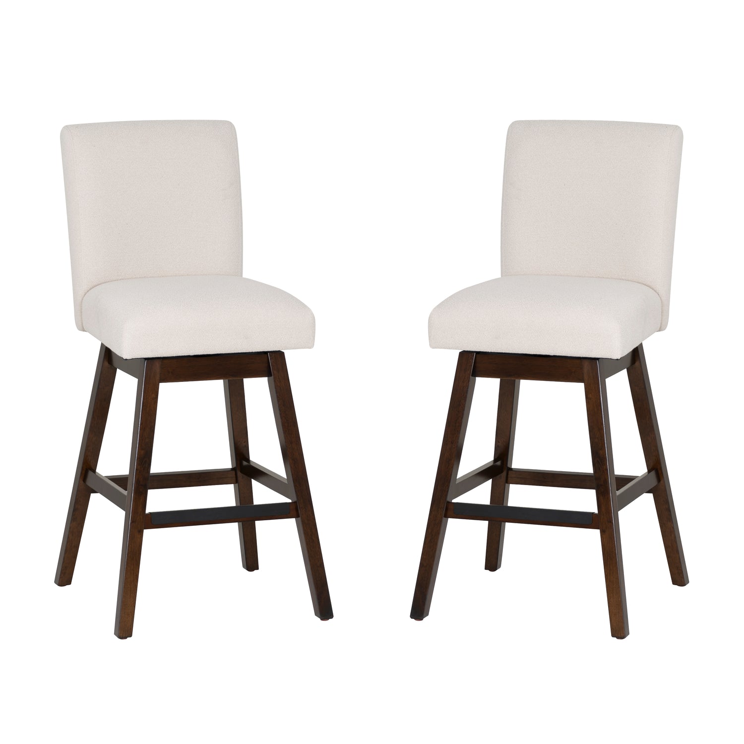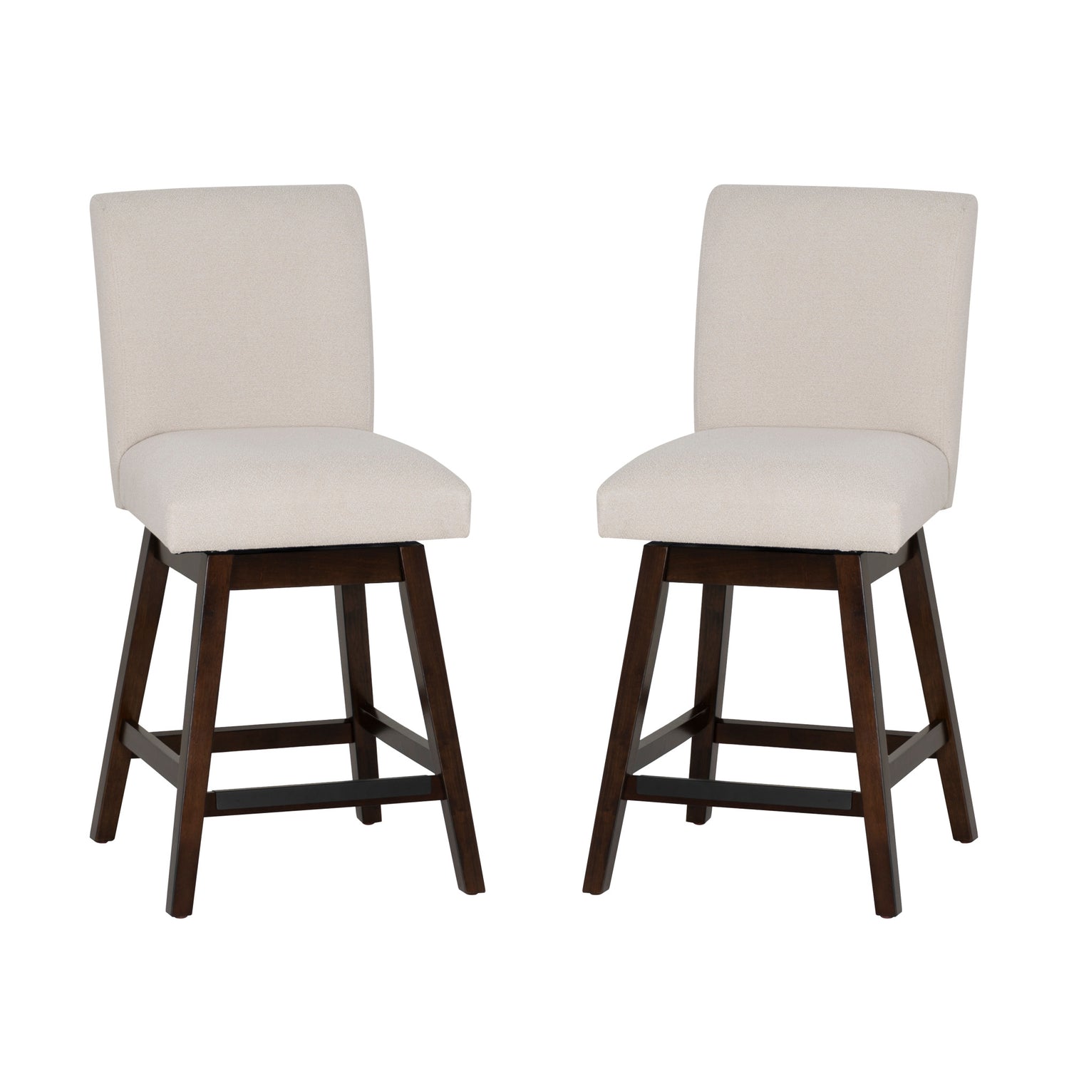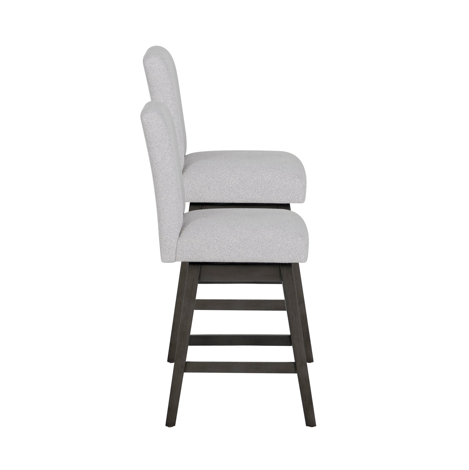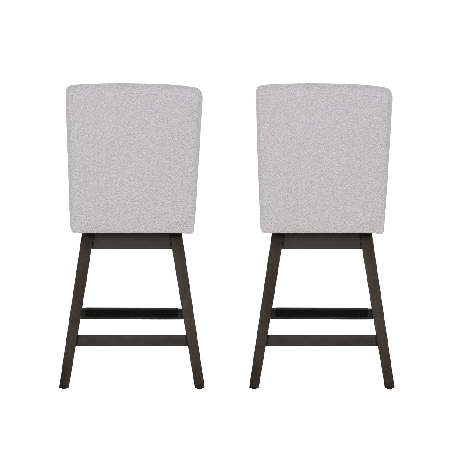 Elevate your dining or kitchen space with this set of two elegant stools. Crafted from durable rubberwood and finished with a rich brown lacquer, these stools offer both style and protection. They feature a solid backrest, built-in footrest, and gray woven polyester upholstery for lasting comfort. The 180-degree swivel provides effortless functionality, making them perfect for casual meals or entertaining. Designed for bars 40" to 44" high, each bar stool measures 20.75" L x 23" D x 44.5" H and assembles with ease, bringing timeless elegance and everyday practicality to your home. The counter stools are designed for bars 35" to 39" high, and measure 19.5" L x 22.5" D x 41" H.