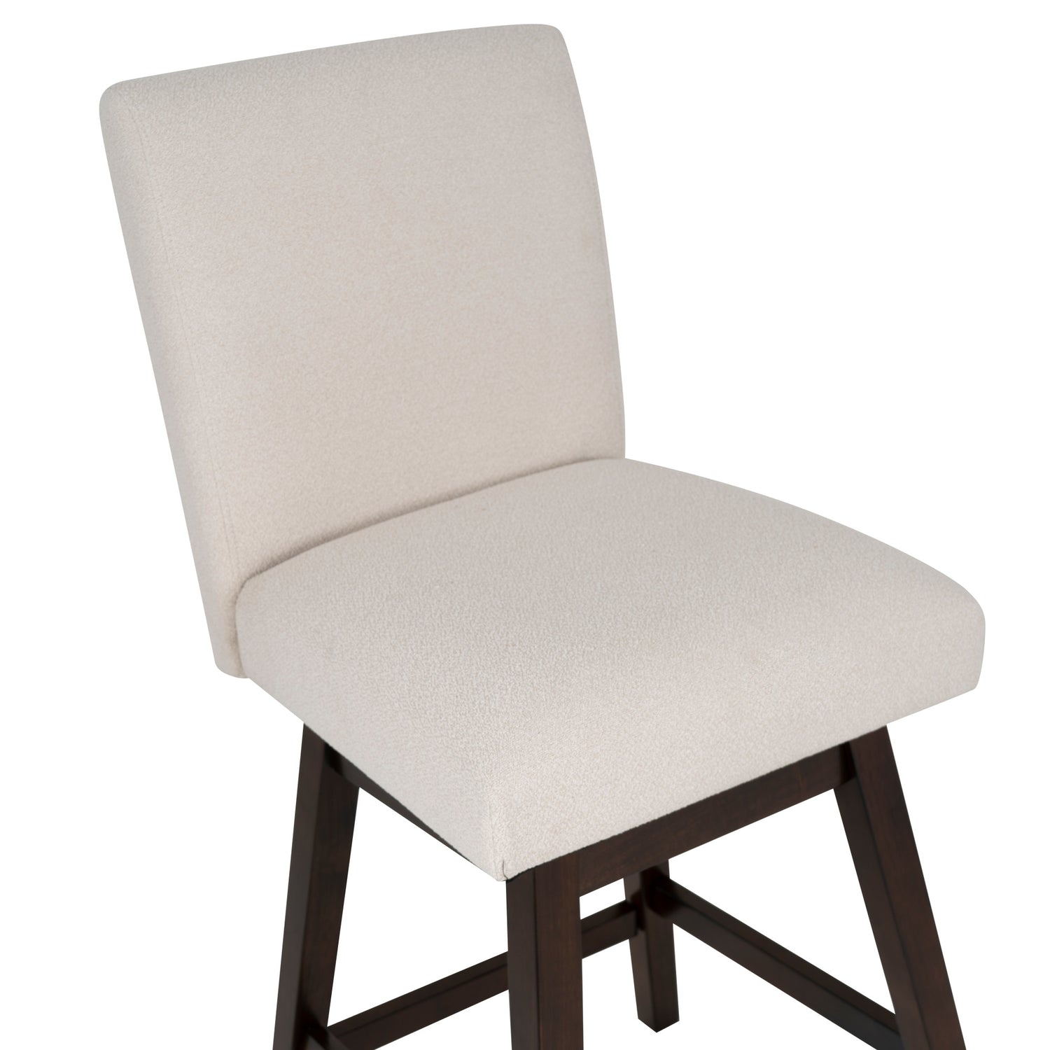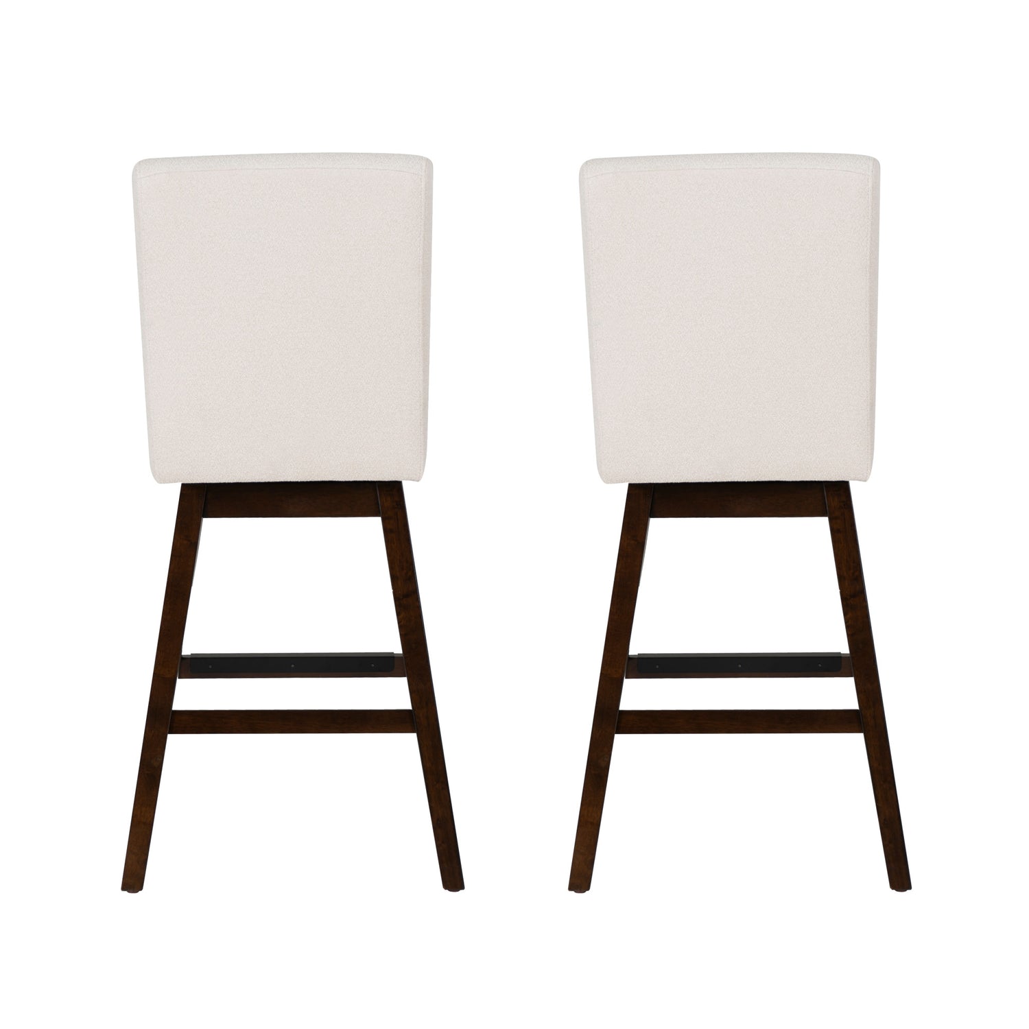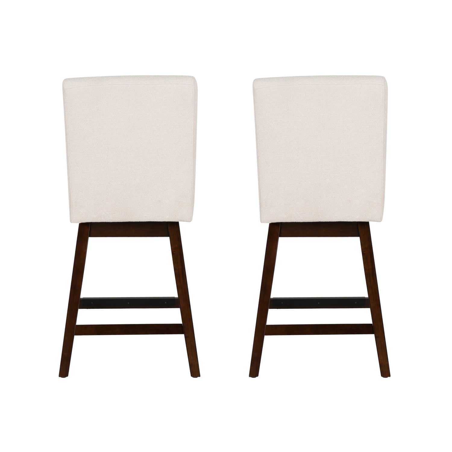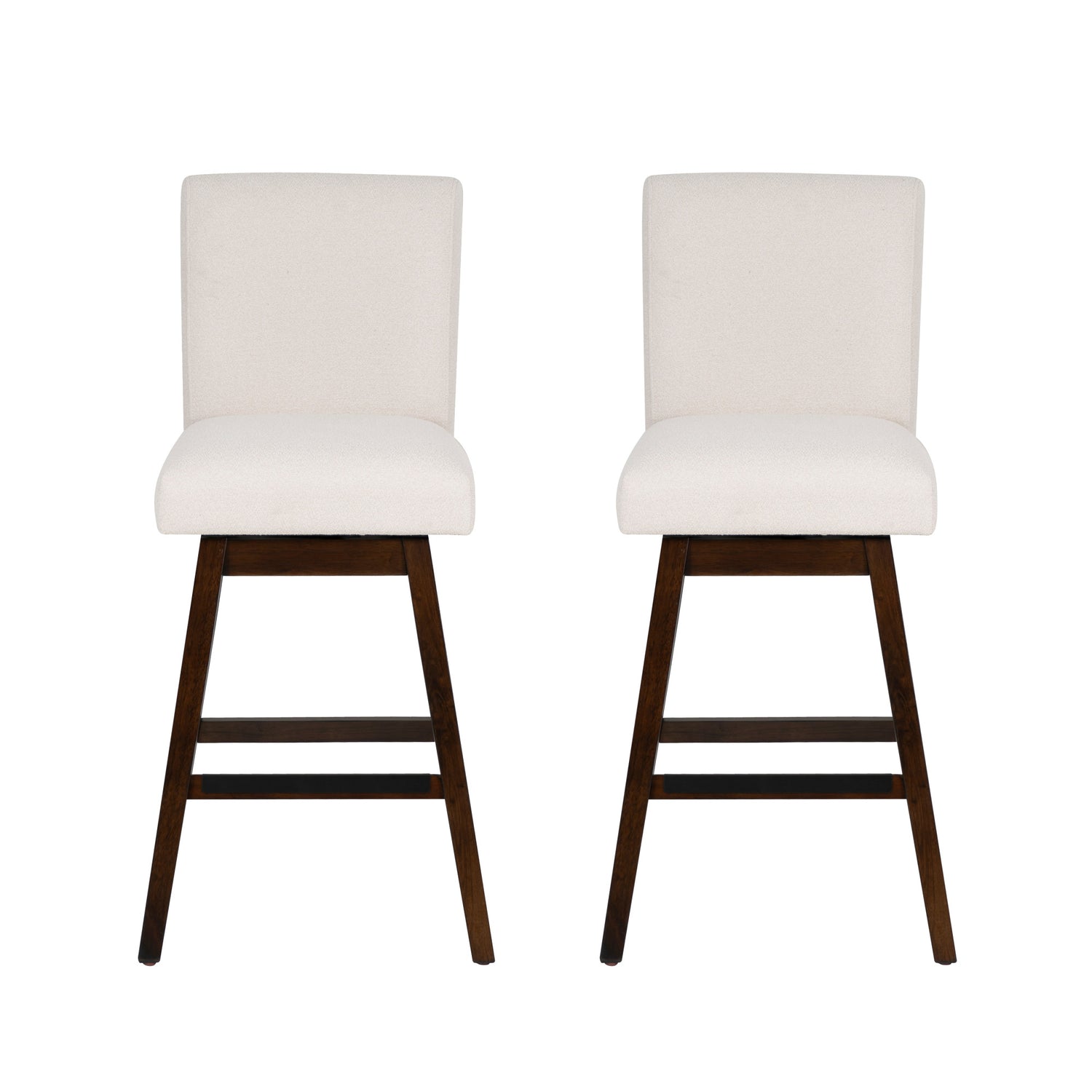 Elevate your dining or kitchen space with this set of two elegant stools. Crafted from durable rubberwood and finished with a rich brown lacquer, these stools offer both style and protection. They feature a solid backrest, built-in footrest, and gray woven polyester upholstery for lasting comfort. The 180-degree swivel provides effortless functionality, making them perfect for casual meals or entertaining. Designed for bars 40" to 44" high, each bar stool measures 20.75" L x 23" D x 44.5" H and assembles with ease, bringing timeless elegance and everyday practicality to your home. The counter stools are designed for bars 35" to 39" high, and measure 19.5" L x 22.5" D x 41" H.