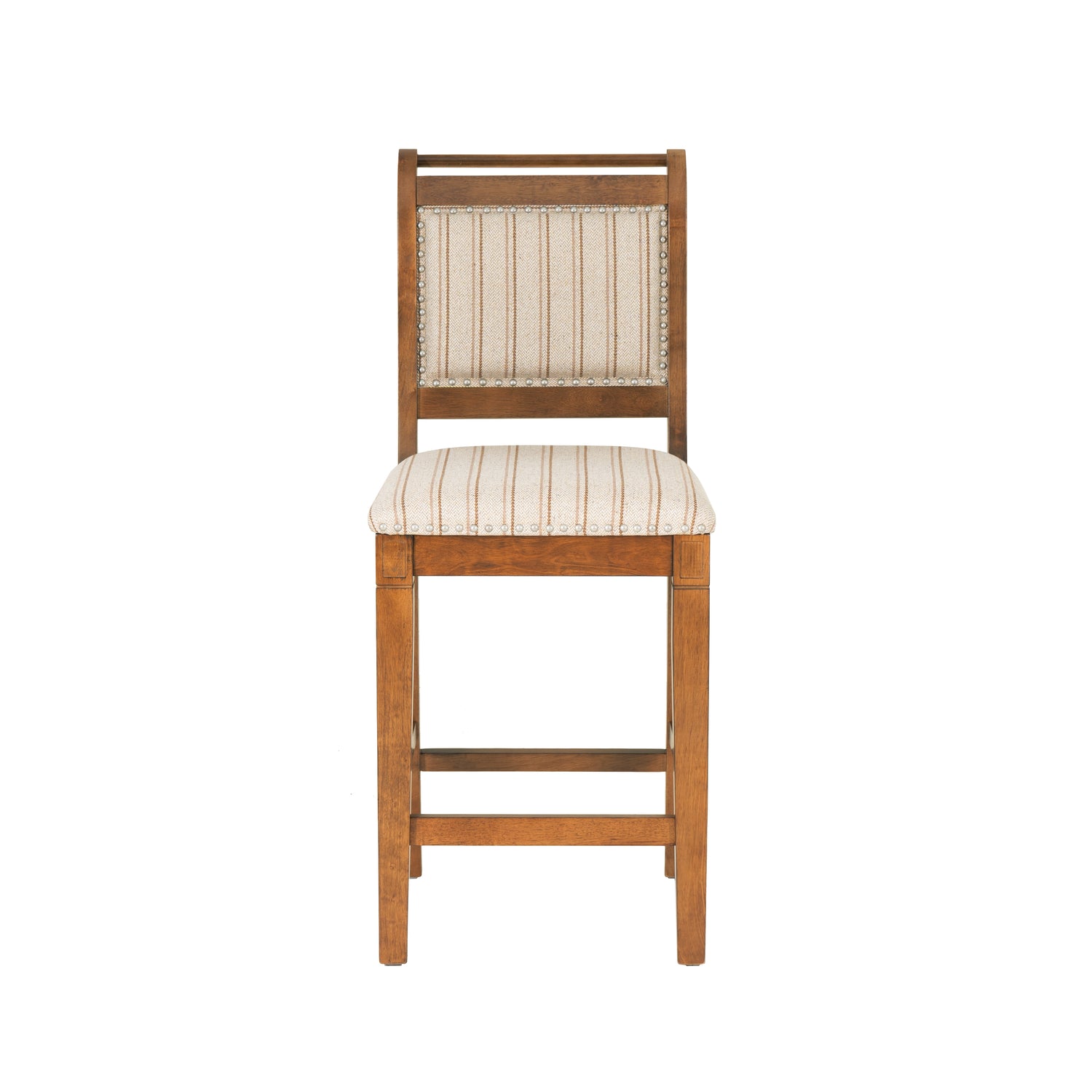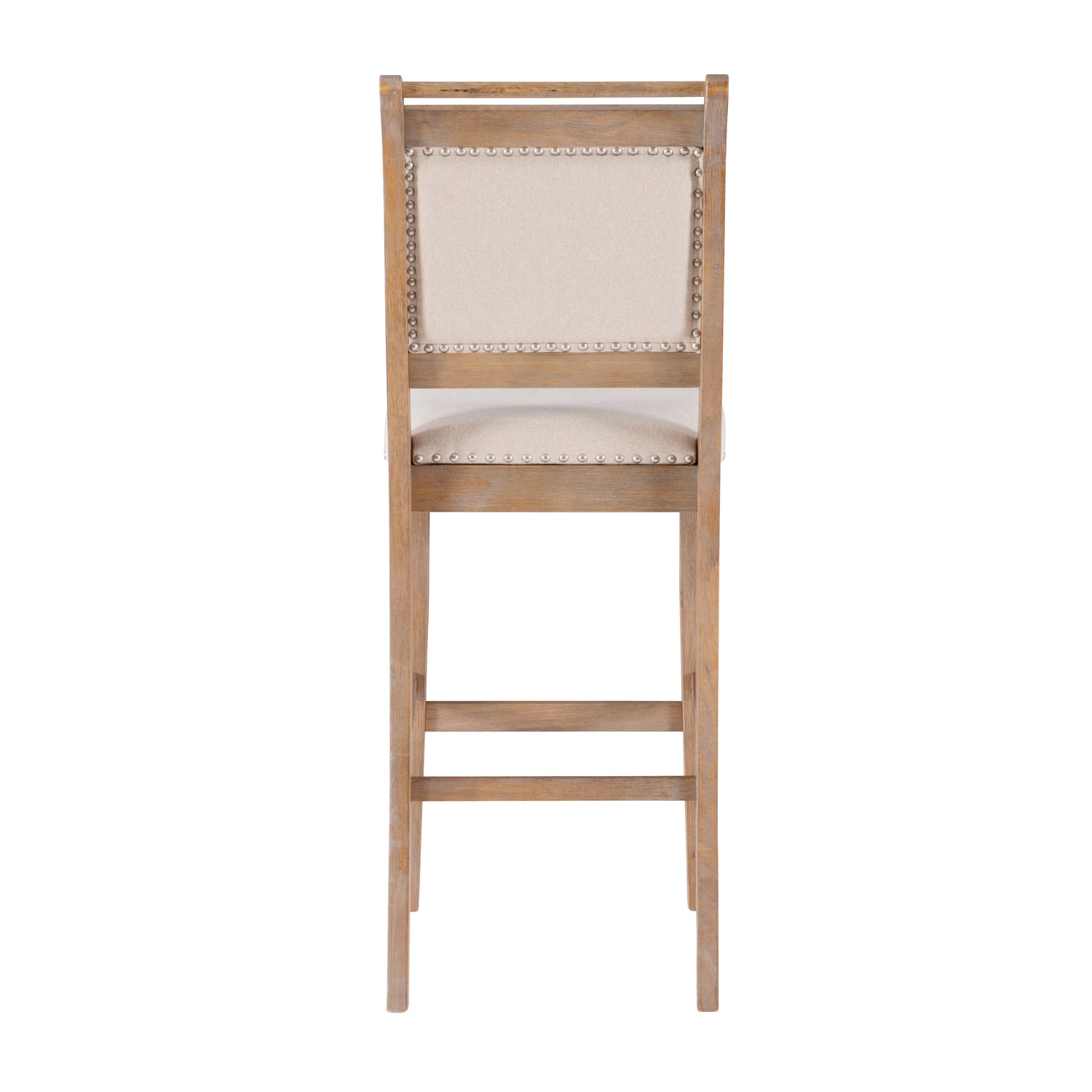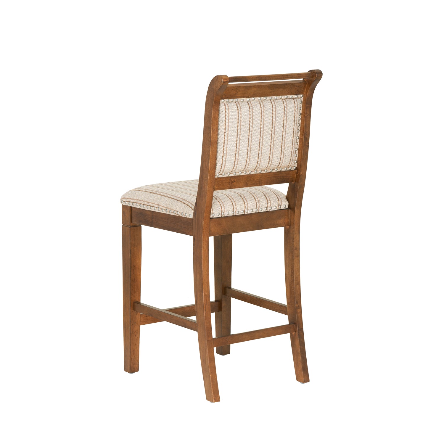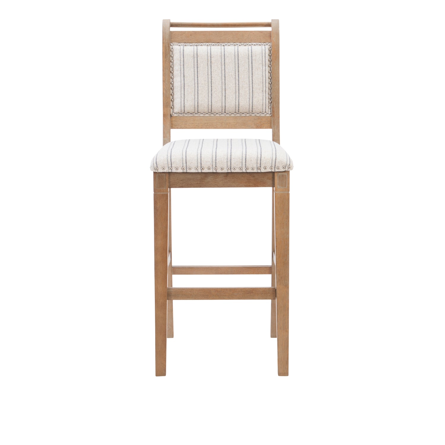 Blending the warmth of rural living with the elegance of classic French design, this stool brings storybook charm to any gathering space. The softly curved silhouette, slat back, and rounded top rail echo traditional European bistro seating with a relaxed, rustic twist. Padded and upholstered in beige linen-look fabric with grey ticking stripes, the seat promises plush comfort and easy maintenance without compromise to the light, airy aesthetic. A warm grey wash, cherry or natural finish adds a timeworn touch, while brushed silver nailhead trim doubles down on the antique-inspired character. The bar stool's 30" seat height is designed for and bars and high tops 40" to 43" high, and the counter stool's 26.5" height perfectly complements counters 35" to 39" hight. This stool brings a collected, lived-in look to kitchens, breakfast nooks, and beyond.