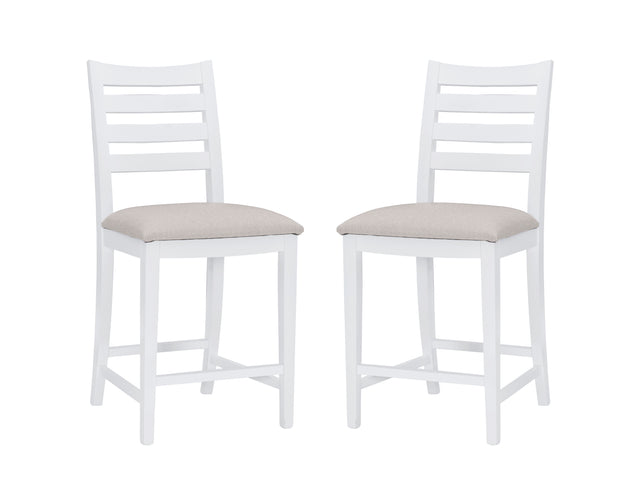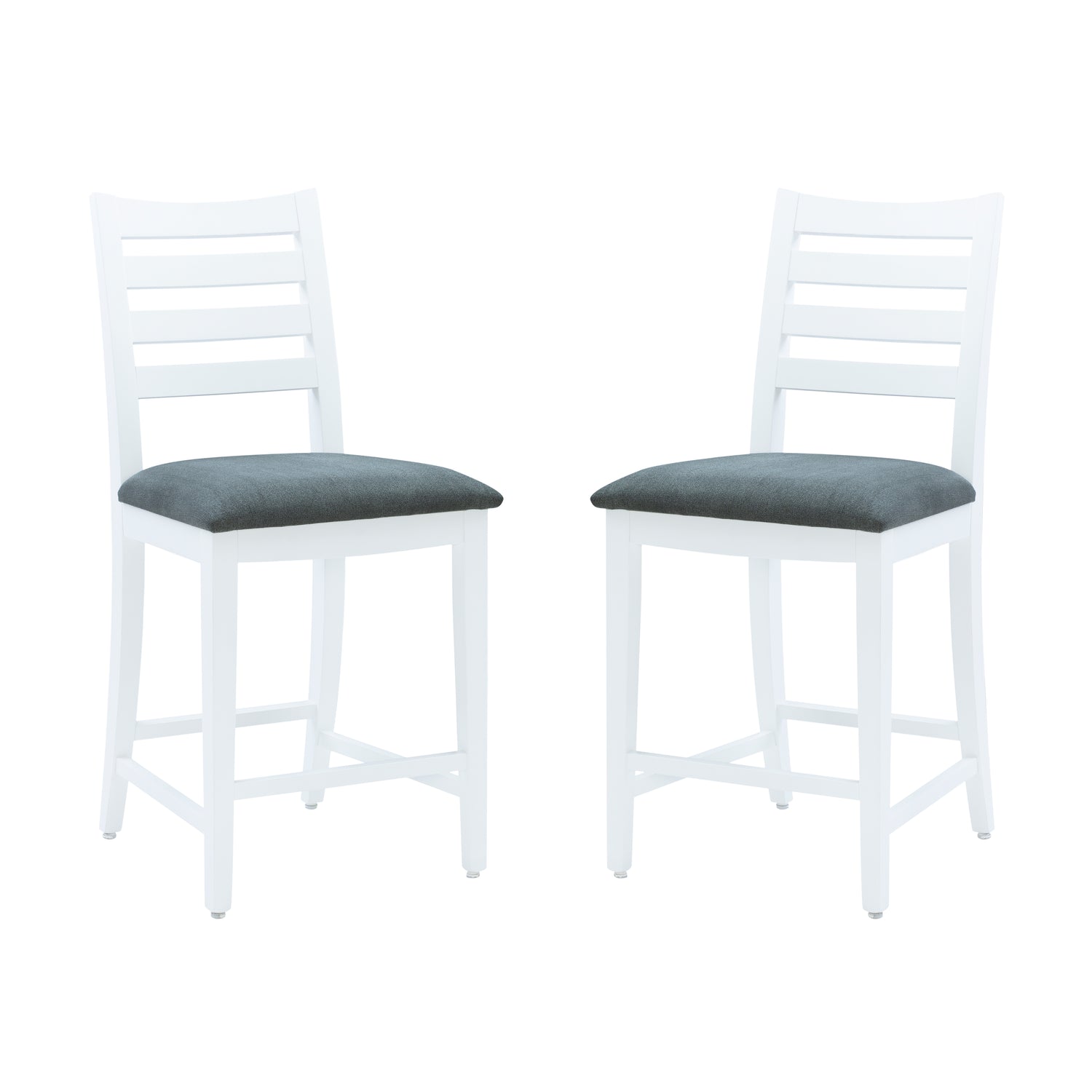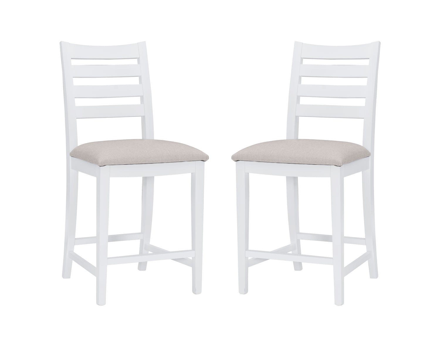Classy, chic, and effortlessly tiptoeing the line of traditional and modern, this ladderback counter stool is a showstopping addition to dining spaces of all kinds. Constructed of solid beechwood for ensured strength and stability, the frame is then painted white, sealed and sanded before receiving a glossy lacquer finish. The padded seat is upholstered with light polyester fabric for added comfort and easy cleaning. This counter stool set of two arrives fully assembled and ready to bring new excitement to your home. Commercial grade