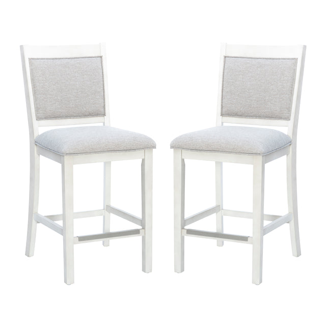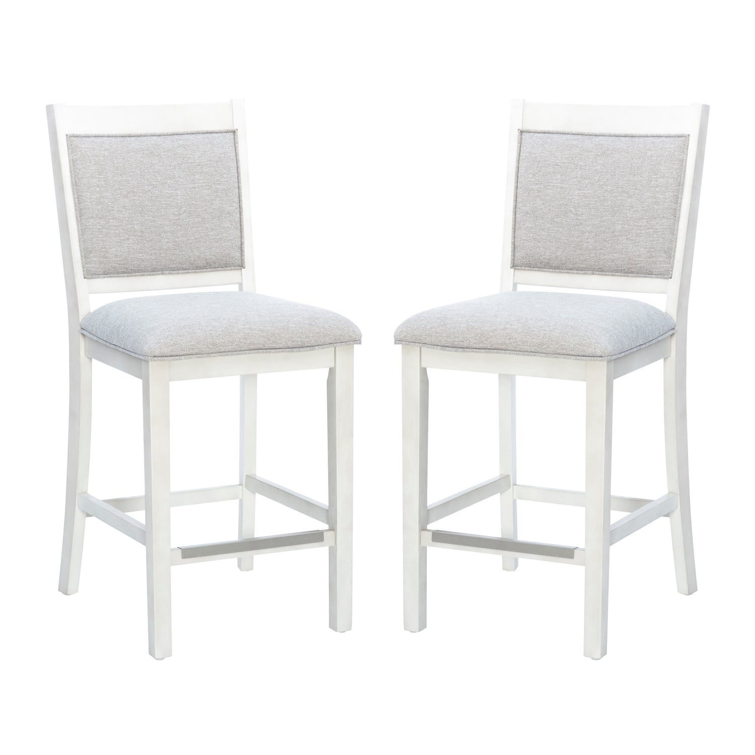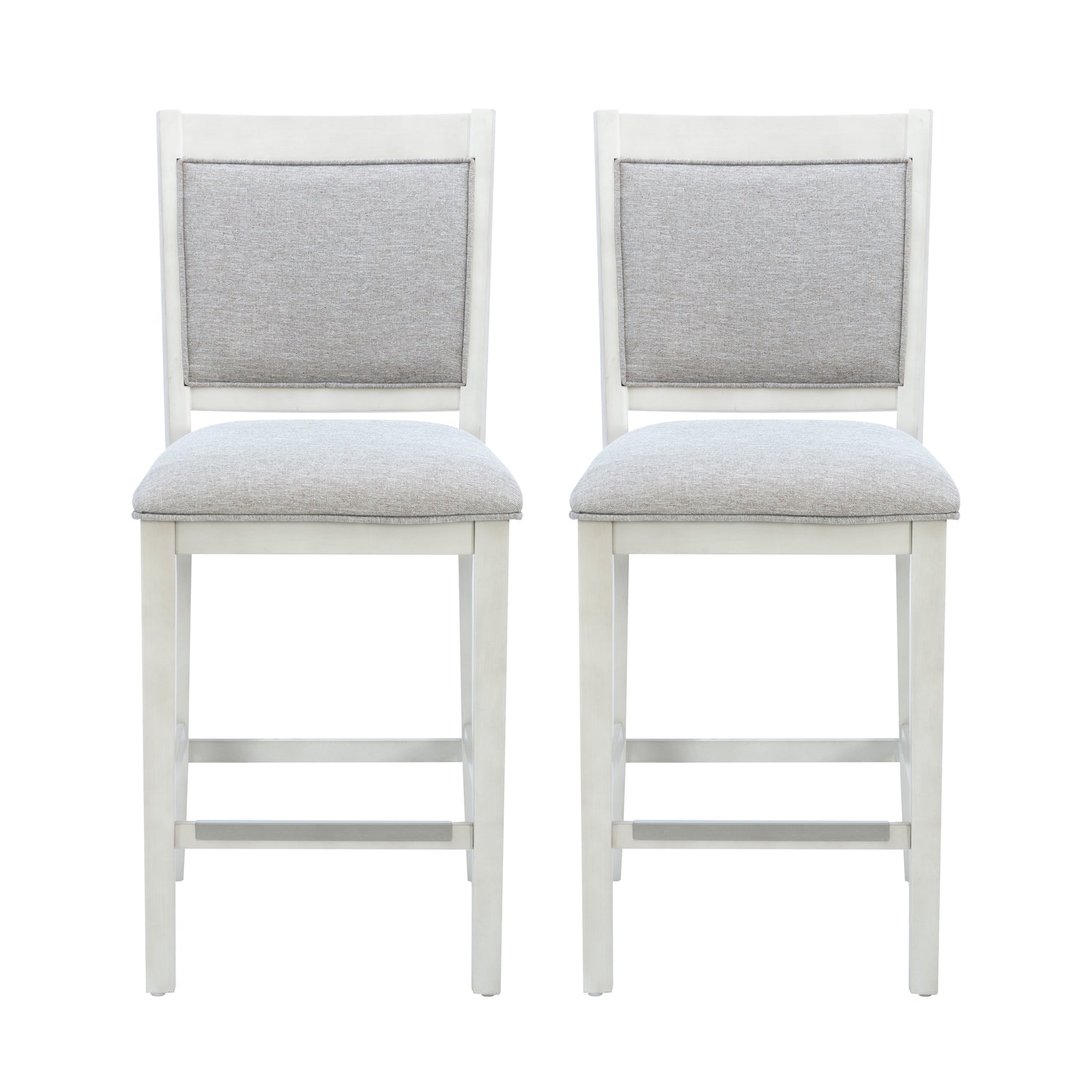 Bring timeless style and everyday comfort to your dining or kitchen space with this pair of elegant counter stools. Featuring solid rubberwood frames in a white dry-brushed finish that reveals traces of the woodgrain, these stools embody modern farmhouse charm. The seat and backrest are upholstered in speckled gray linen-look fabric, providing a plush, supportive feel that resists wear, fading, and stains for long-lasting quality. Built-in footrests are equipped with brass kickbacks in muted silver for extra protection and support, as well as a subtle flair. With their clean lines, neutral palette, and durable construction, these stools are ideal additions to modern and traditional settings alike.