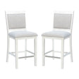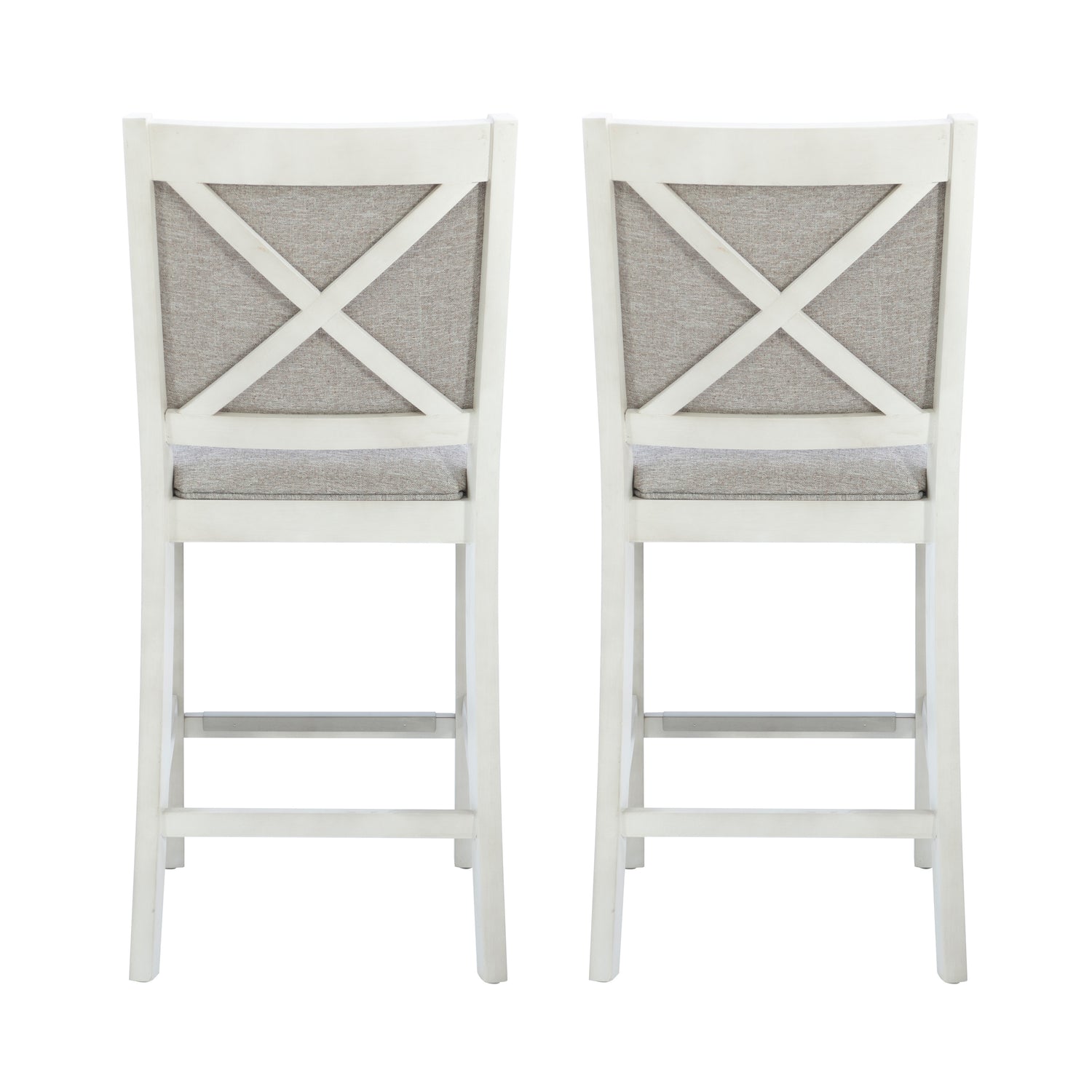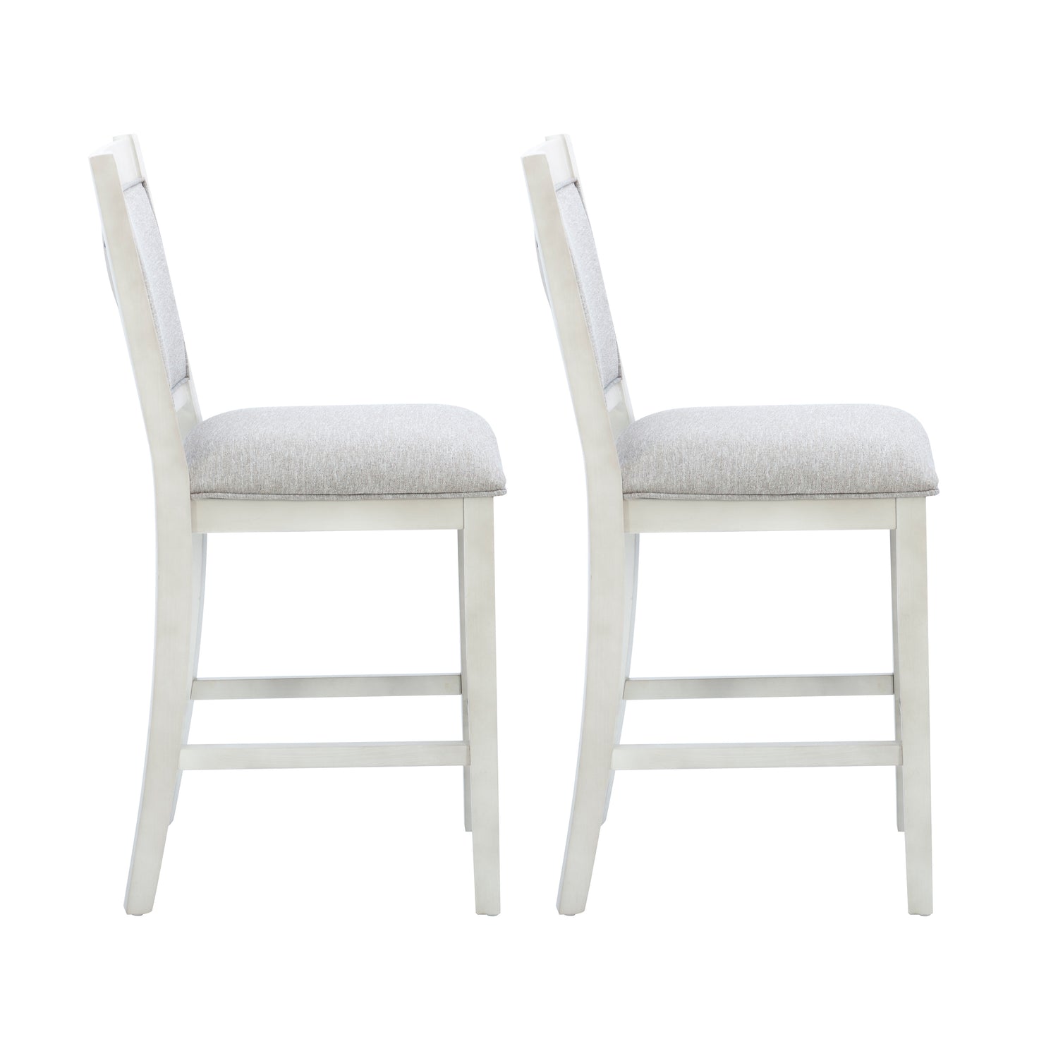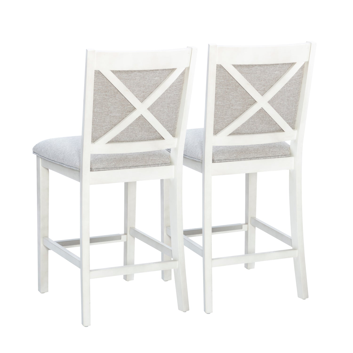 Bring timeless style and everyday comfort to your dining or kitchen space with this pair of elegant counter stools. Featuring solid rubberwood frames in a white dry-brushed finish that reveals traces of the woodgrain, these stools embody modern farmhouse charm. The seat and backrest are upholstered in speckled gray linen-look fabric, providing a plush, supportive feel that resists wear, fading, and stains for long-lasting quality. Built-in footrests are equipped with brass kickbacks in muted silver for extra protection and support, as well as a subtle flair. With their clean lines, neutral palette, and durable construction, these stools are ideal additions to modern and traditional settings alike.