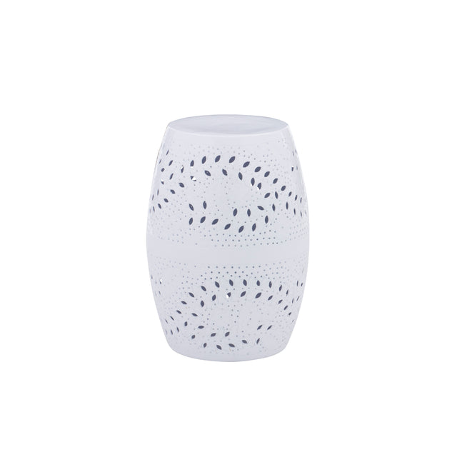The perfect perch for drinks and hors d'oeuvres at dinner parties, this aluminum side table will bring new life to a variety of settings. Measuring at just 13.5" W x 13.5" D x 19" h, it fits seamlessly next to a couch or in between a set of chairs and is lightweight for easy transport. The drum shaped frame is adorned with intricate lace cuts that allow light to shine through the leaves and further accentuate the beautiful finish.