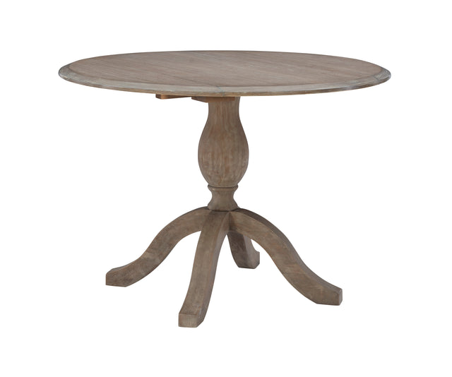 Go classy or casual with this dual, drop leaf dining table. With a solid wood pedestal, this chunky, rustic piece features a textured Gray wash that blends well with mix and match chairs or holds its own with a streamlined style. It's a space saver when collapsed and looks great with a few decorative items on top. Then, it extends to a full 42 inches to comfortably seat up to four. The curved lines of the base and feet look pleasing, and the durable design adapts especially well to a small kitchen or dining room.