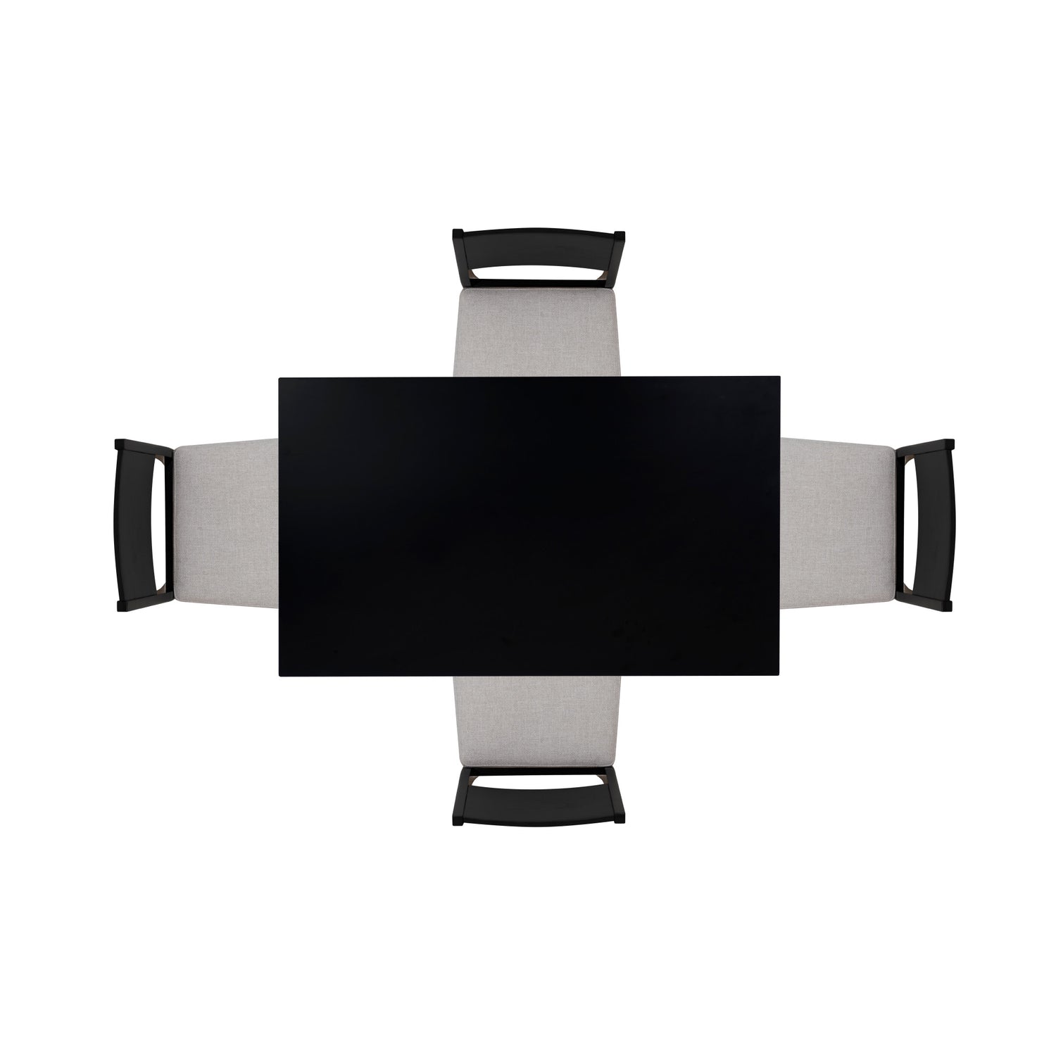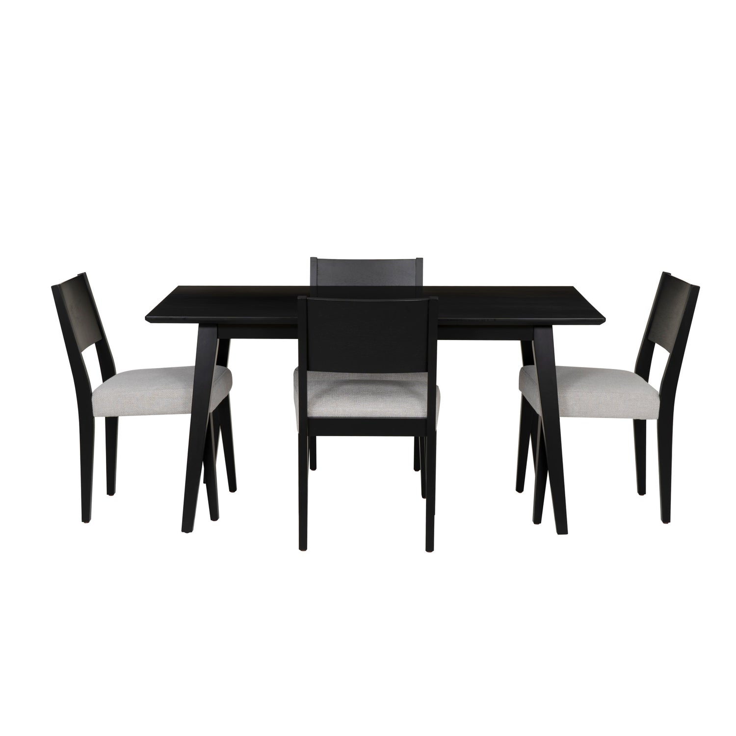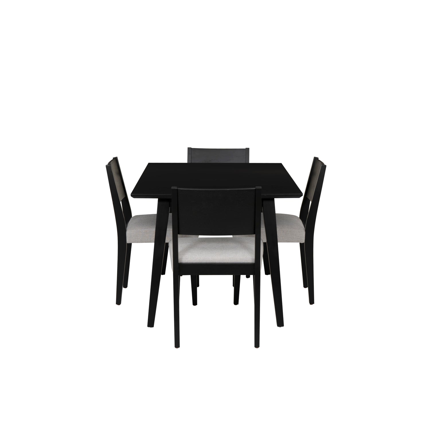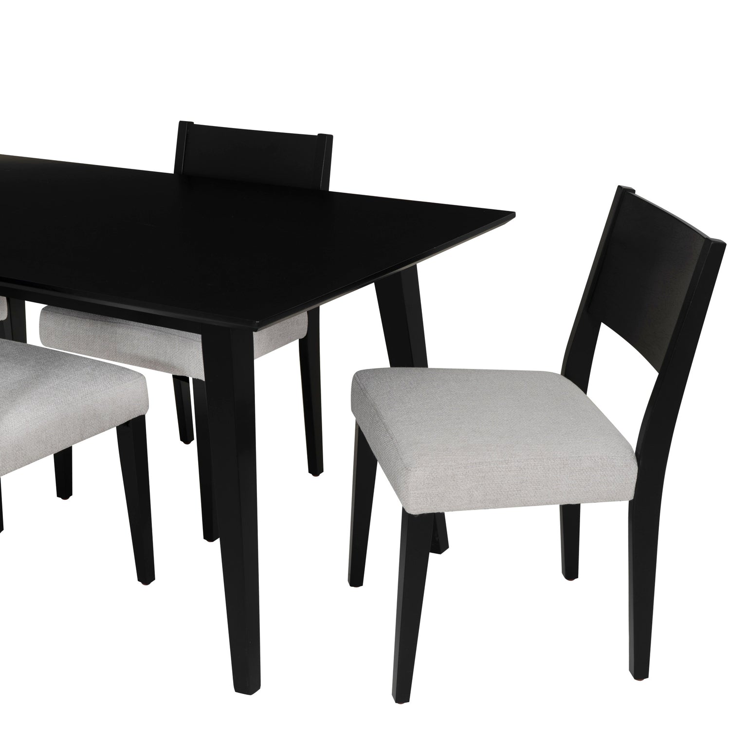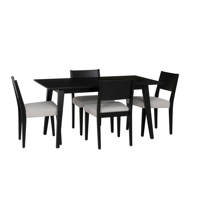 Bring balance and sophistication to your dining space with this 5-Piece Dining Set, a clean blend of modern elegance and everyday comfort. The rectangular dining table features a sleek black finish with a subtle sheen and a spacious top crafted with durable rubberwood. Four matching side chairs cradle you in comfort with foam-padded seats, webbing support, and soft light grey polyester upholstery that pops beautifully against the black frame. Whether you're gathering with friends or enjoying a quiet meal at home, this set anchors your space with understated elegance and everyday ease.