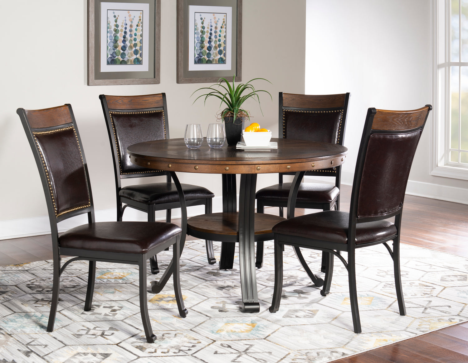 Bring a grounded, sophisticated presence to your dining space with this 5-piece round dining set, where timeless charm meets everyday durability. The 45” round table is finished in a rich umber brown or gray wash stain over real ash veneer, accented with antique brass nailheads and a built-in lower shelf for storage or display. Four matching armless chairs echo the table’s bold character, featuring warm faux leather or beige fabric upholstery, gently curved bentwood top rails in oak veneer, and sturdy black or pewter powder-coated steel legs. Whether hosting guests or enjoying quiet meals at home, this set makes a strong yet elegant statement that fits seamlessly in classic, industrial, or transitional interiors.
