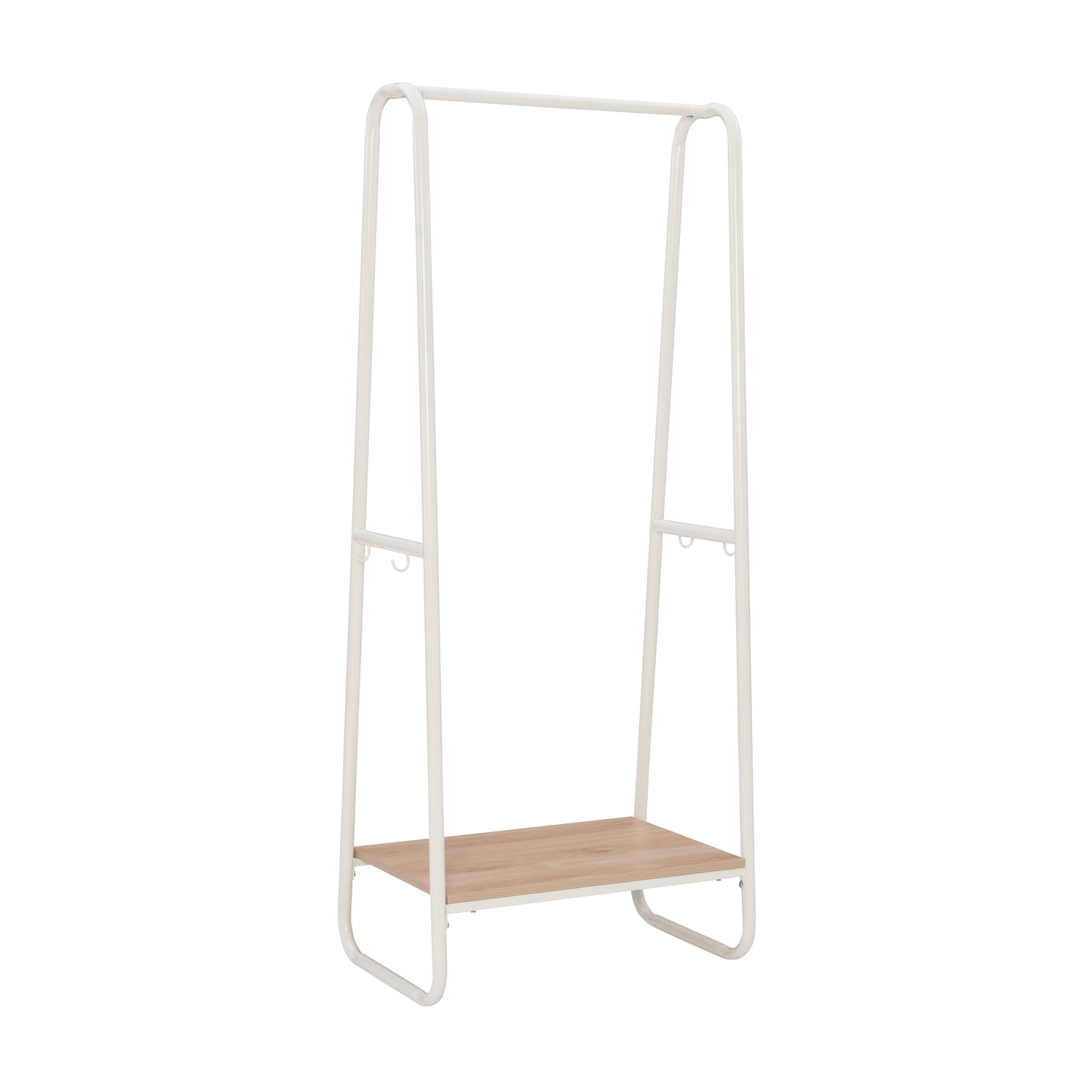 It’s time to do away with clutter and clothes draped over chairs and odd places! This minimal clothing rack provides an open canvas for your jackets, shirts, scarves and bags to hang front and center. Measuring at 27.25” L x 15.75” D x 60” h, this piece can make a big difference while taking up little floor space. The wooden bottom shelf in a distressed finish is perfect for storing folded laundry, shoes or bags, while 4 small hooks on both sides of the pewter metal frame offer extra hanging solutions. Easy assembly and confident style guaranteed.