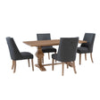 Elevate your dining space with our elegant 5-piece dining set. The table, crafted from solid pine wood in a rustic honey finish with a double pedestal design, exudes timeless charm. Each of the four solid wood chairs features a gray or natural finish and is upholstered in luxurious linen weave fabric, woven from durable polyester for easy upkeep. With arc-shaped backrests for added comfort and a straightforward assembly process, this set seamlessly blends durability, style, and comfort, perfect for creating memorable dining experiences with family and friends.