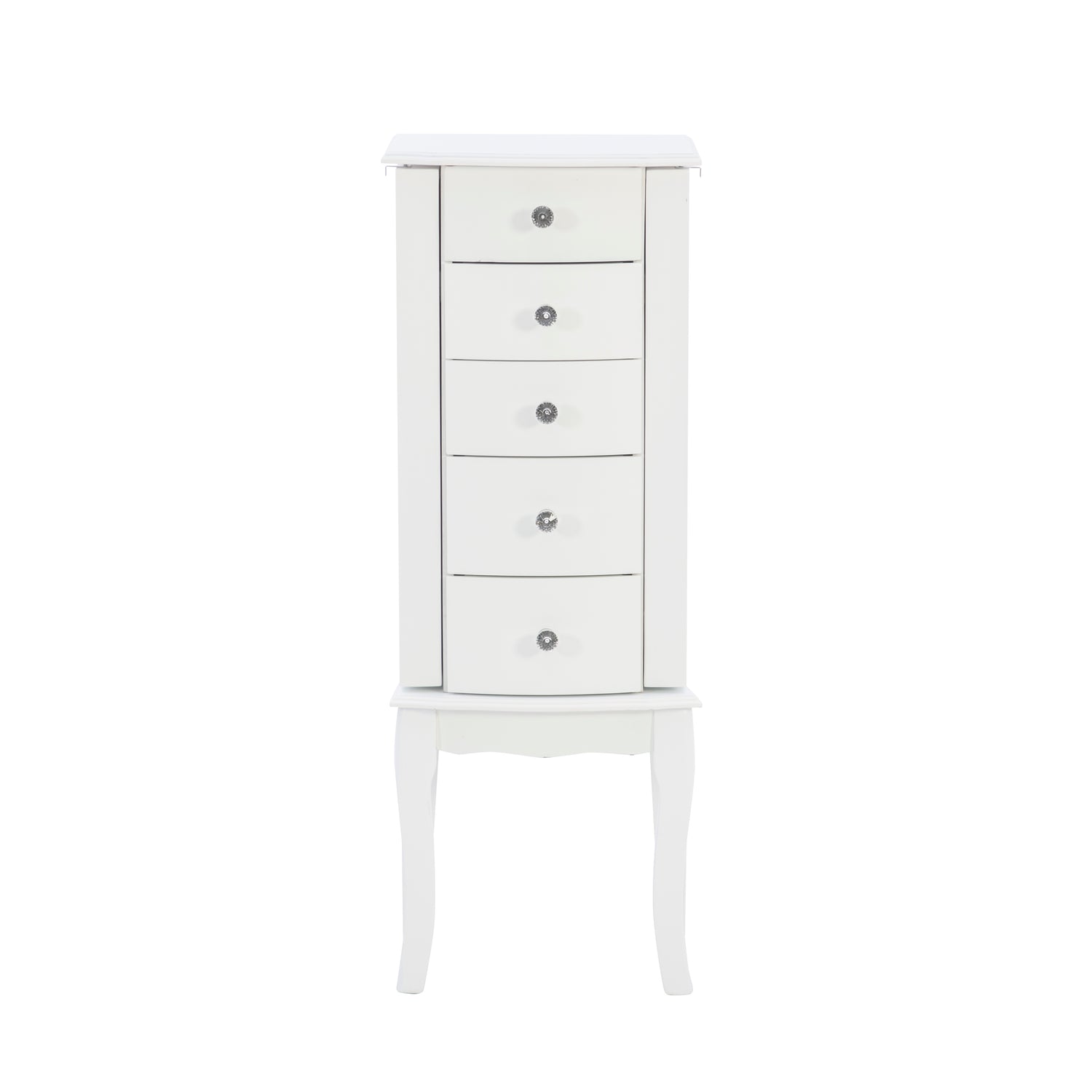 Petite in size but big on charm, this white jewelry armoire combines elegance with everyday function. Accented with crystal-inspired drawer Faux Leatherlls, parsons-style curved legs, and a scalloped apron, it adds a refined touch to any room. Perfect for compact spaces, the armoire offers a flip-top with a lined compartment, side doors with necklace storage, and deep drawers that glide open to organize your treasures. Inside, a soft pink lining provides both protection and a subtle pop of color. Designed for convenience and style, this transitional piece keeps your cherished jewelry safe, accessible, and beautifully displayed.