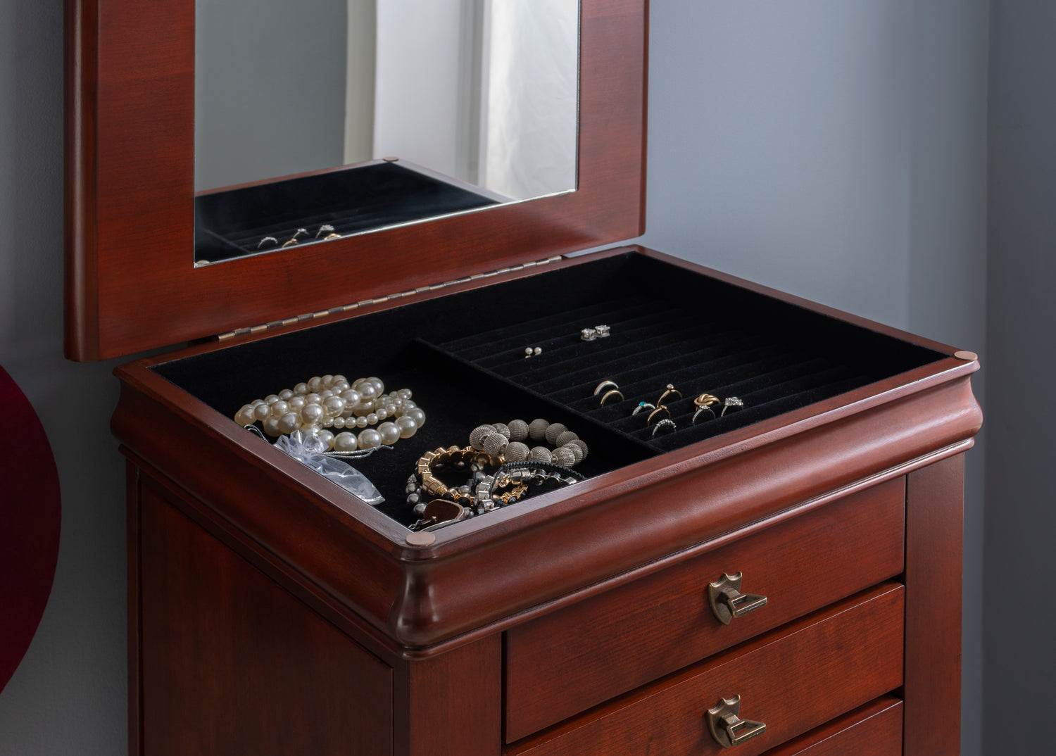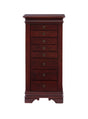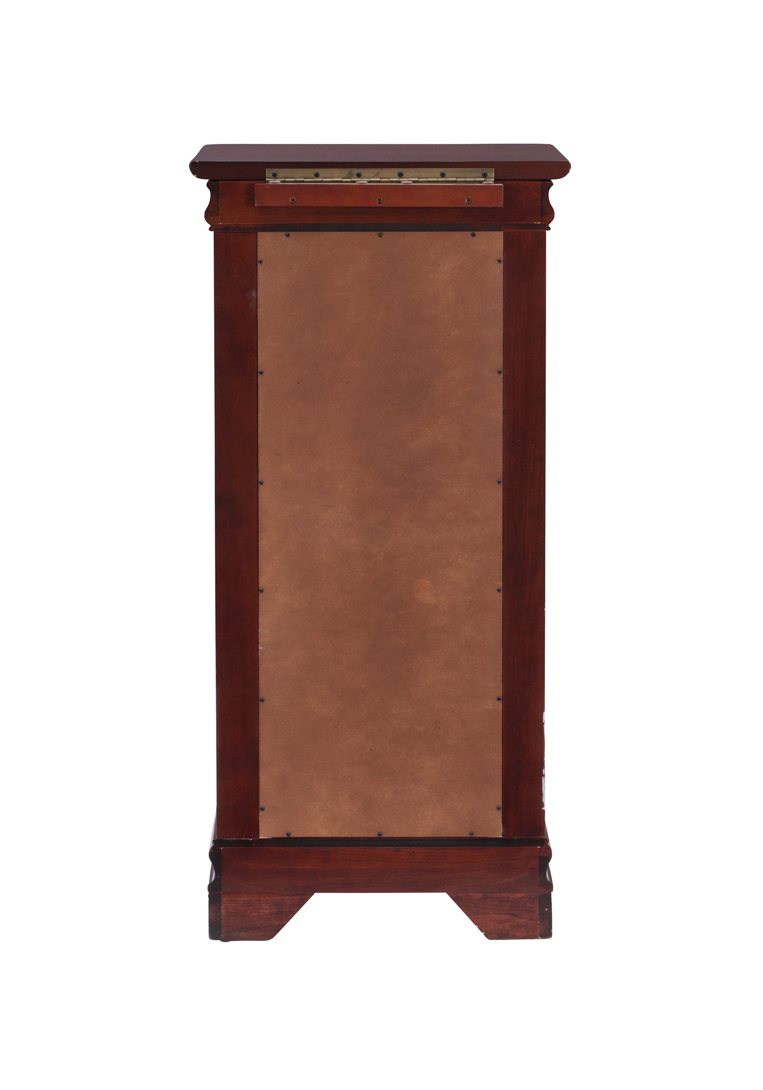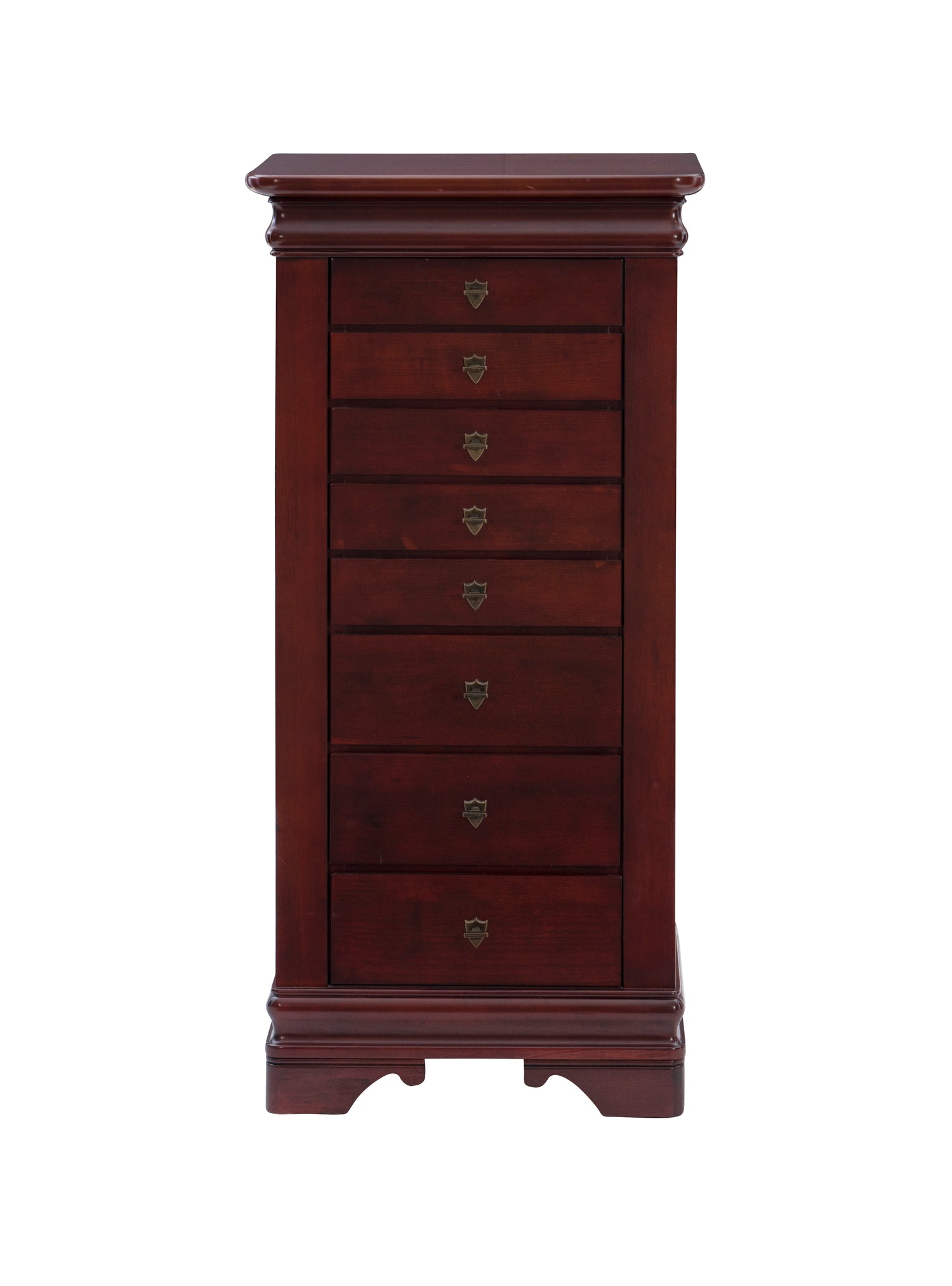 Graceful and timeless, this free-standing jewelry armoire in a Marquis Cherry finish blends traditional elegance with everyday function. Accented with classic Louis Philippe details and antique brass hardware shaped like shields of honor, it makes a stunning addition to any bedroom. The flip-top opens to reveal a mirrored and divided jewelry compartment, while touch-latch side doors swing wide to display necklace hooks. Eight spacious drawers lined in plush black fabric provide secure and stylish storage for rings, bracelets, earrings, and keepsakes. Beautifully designed and thoughtfully detailed, this armoire offers both beauty and practicality for your most cherished treasures.