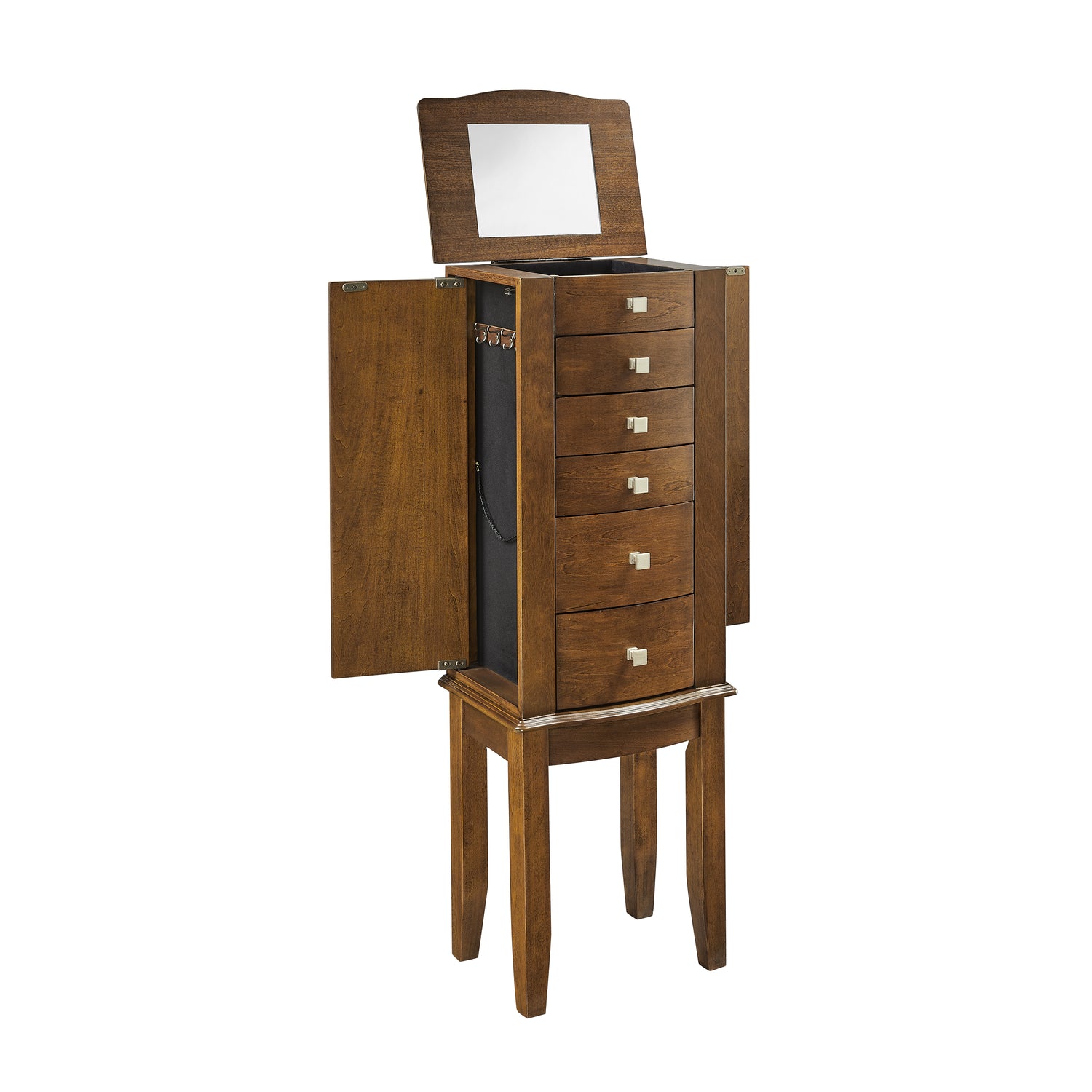 Timeless and practical, this jewelry armoire blends traditional elegance with modern function. Its warm walnut finish and metal hardware bring classic character to your space, while the thoughtfully designed interior keeps every piece of jewelry safe and organized. The flip-top reveals a vanity mirror and divided compartment, while side panels swing open to display hooks for necklaces and bracelets. Multiple felt-lined drawers offer both protection and refined presentation, ensuring your cherished pieces remain tangle-free and beautifully stored.