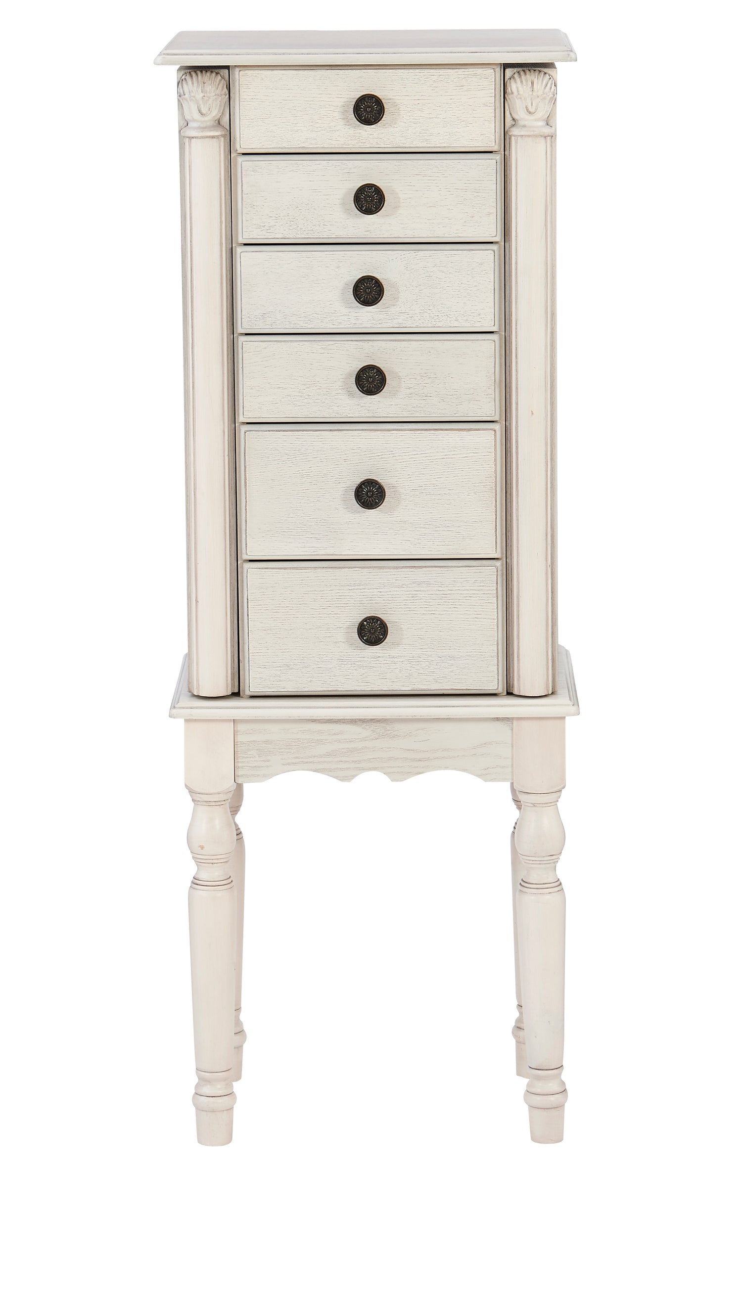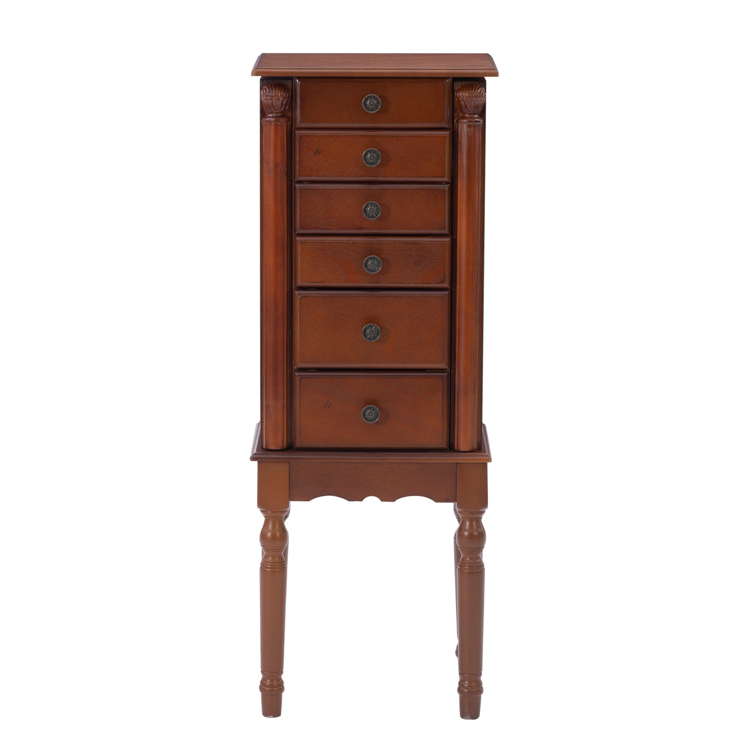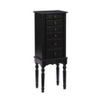 Designed with both elegance and practicality in mind, this petite jewelry armoire offers timeless style and smart storage. Available in your choice of ebony black, rich cherry, or creamy white finish, it features a flip-top lid with an inset mirror, a scalloped skirt, and classic spindle-turned legs. The top compartment is thoughtfully divided with ring pads and two square sections for organizing small treasures. Side swing doors open to reveal a fully lined interior with necklace hooks and matching rayon cords to keep chains tangle-free. Below, three small and two large drawers provide versatile storage—one with six divided squares, another with four, and the remaining fully lined for larger pieces. Every drawer and compartment is finished with 100% rayon lining to protect your jewelry with soft sophistication.