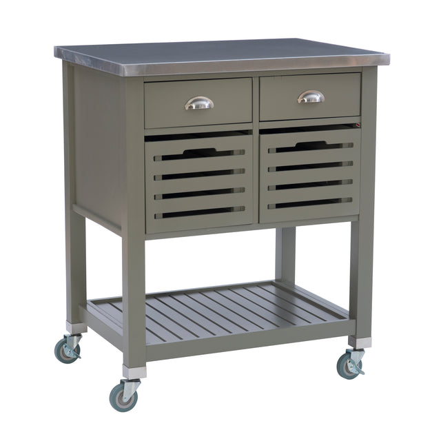 Imagine all you can do with this kitchen cart! Prepare a meal using the food safe, stainless steel top, set up a breakfast bar, or serve after dinner drinks practically anywhere thanks to easy rolling casters. Storage is no problem, with two drawers and a bottom shelf sized for a compact microwave oven. Plus, you can keep produce fresh in two Faux Leatherll out bins with slats for air circulation. This charming cart, finished in warm gray or white with stainless steel drawer pulls, will complement any interior.