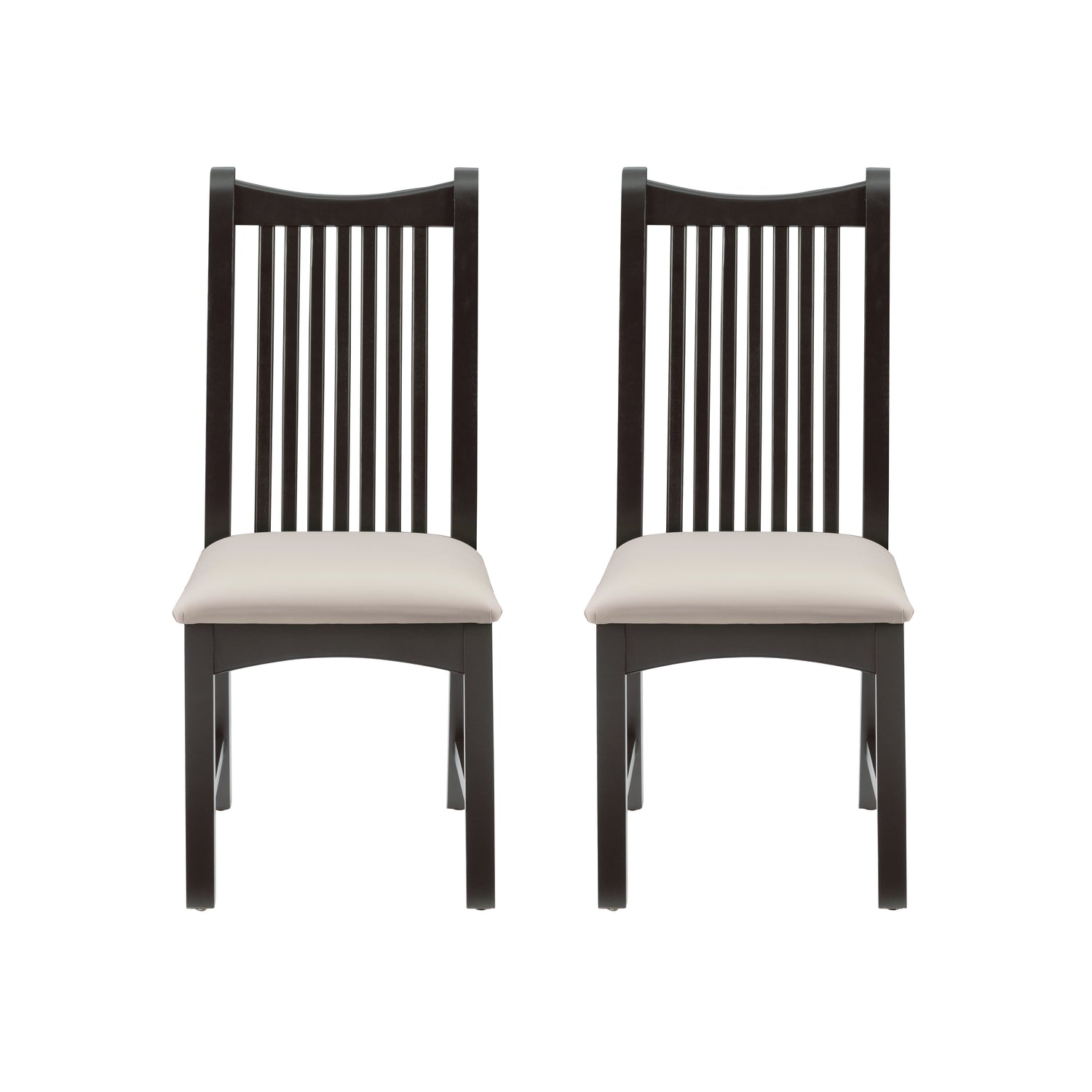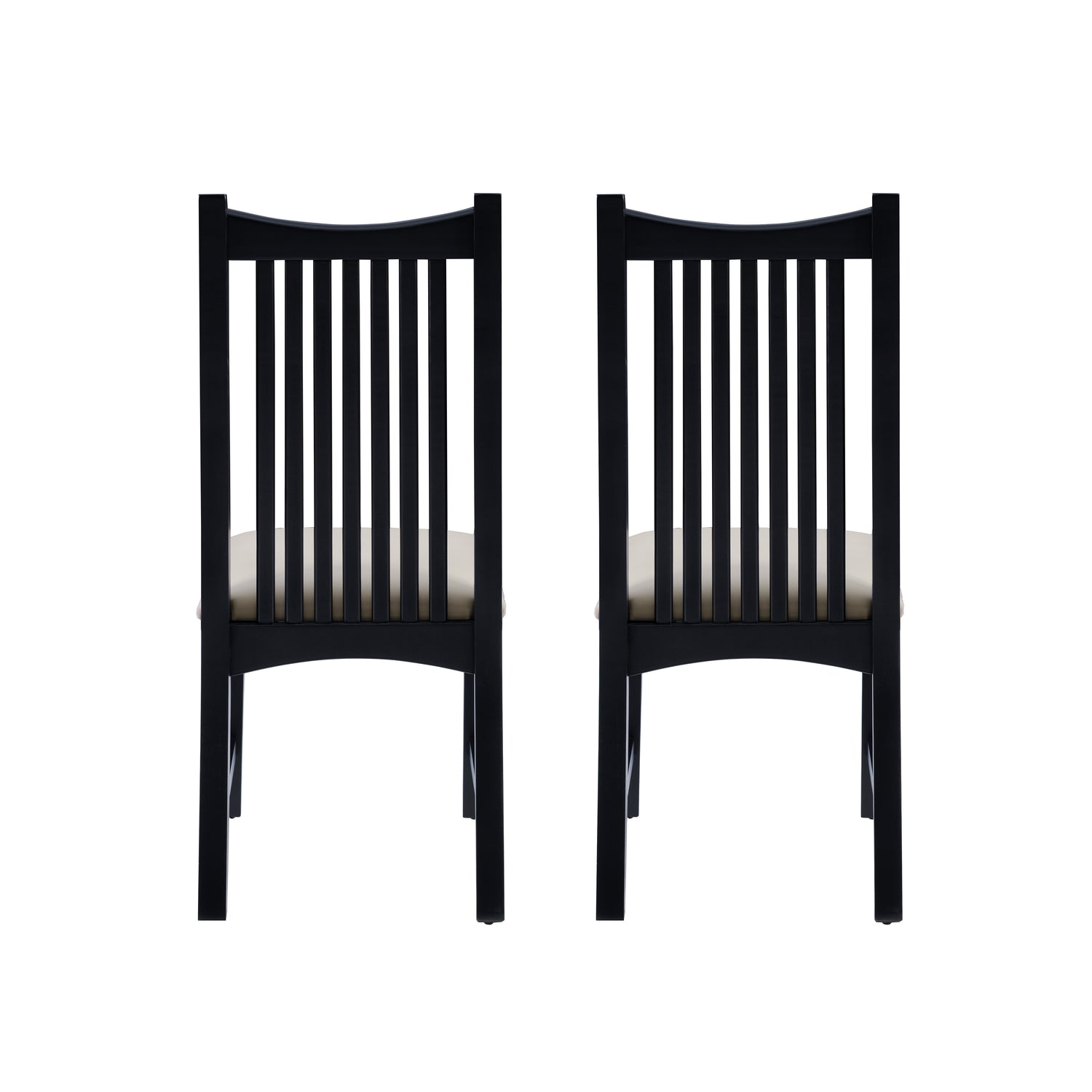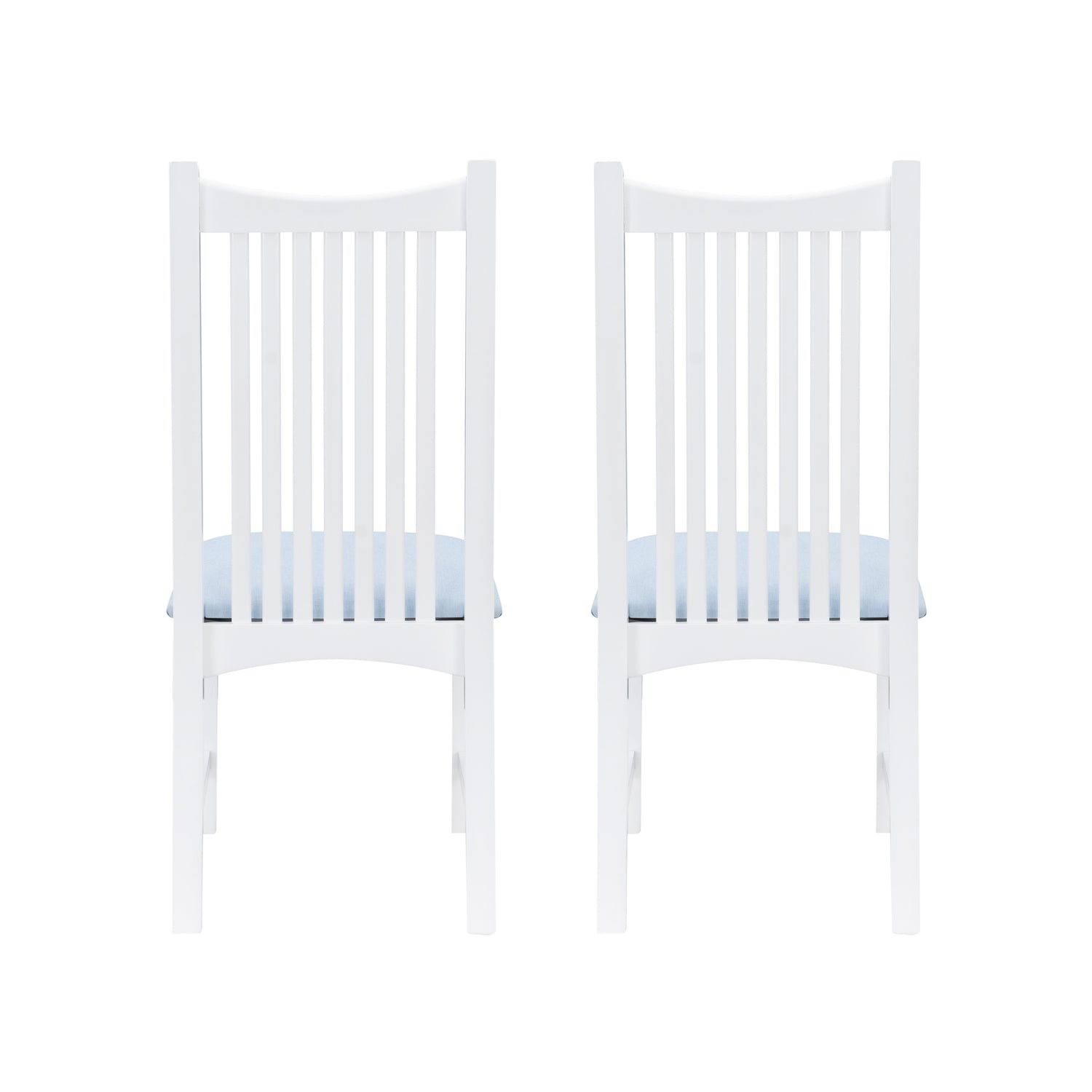 This set of two traditional dining chairs brings an understated and low key touch to your dining room or eat in kitchen. These chairs are made from solid beechwood and feature an extra tall openwork slatted back for just the right amount of classic appeal. Four sturdy square legs help these chairs support up to 300 lbs., Each conforming to commercial grade standards. Available in a deep black finish and light grey faux leather upholstered seat, or white with light blue faux leather allow these chairs to blend in with neutral and earthy color palettes alike.