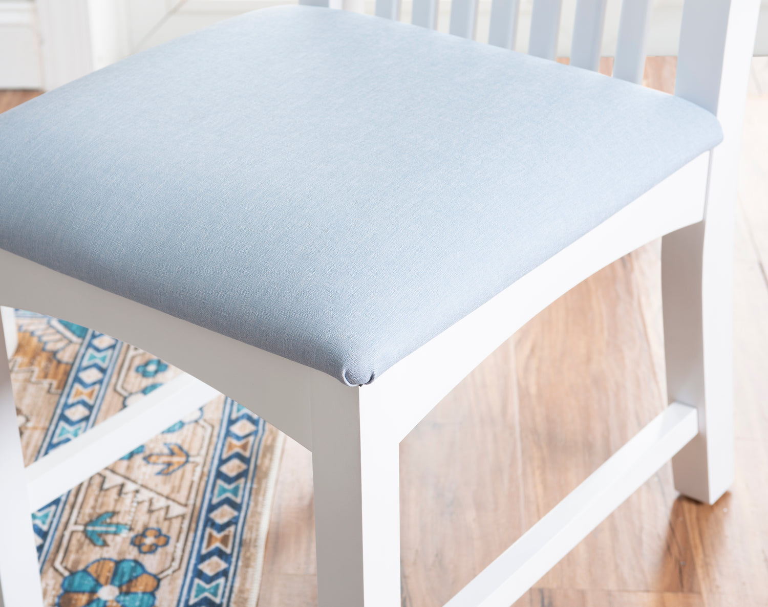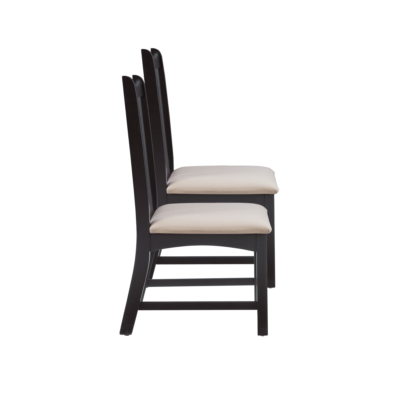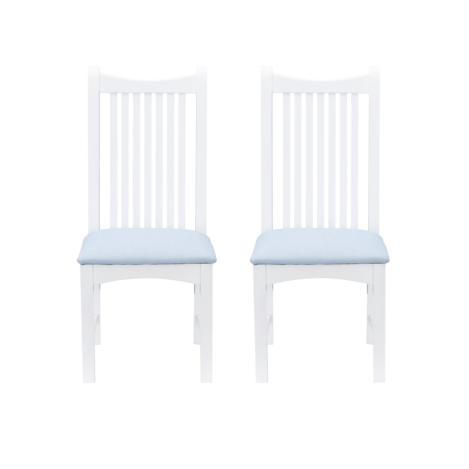 This set of two traditional dining chairs brings an understated and low key touch to your dining room or eat in kitchen. These chairs are made from solid beechwood and feature an extra tall openwork slatted back for just the right amount of classic appeal. Four sturdy square legs help these chairs support up to 300 lbs., Each conforming to commercial grade standards. Available in a deep black finish and light grey faux leather upholstered seat, or white with light blue faux leather allow these chairs to blend in with neutral and earthy color palettes alike.