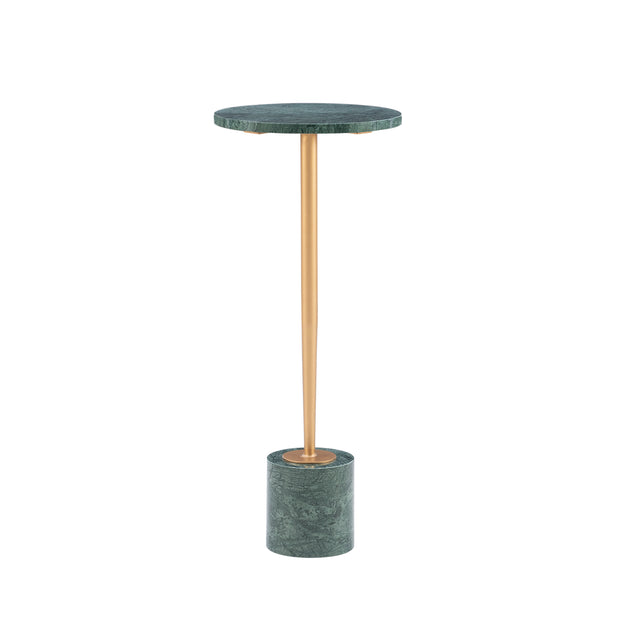 Whether it's holding your drink at a cocktail party or displaying a work of art in your entryway, this table will bring a new panache to your home. The beautiful green marble top with swirling earthy tones is complimented by an iron base in gold that stands on a marble block. Measuring at just 10.5" L x 10.5" W x 25.3" H, this piece is ideal in compact areas or anywhere that you'd like to conserve open floor space.