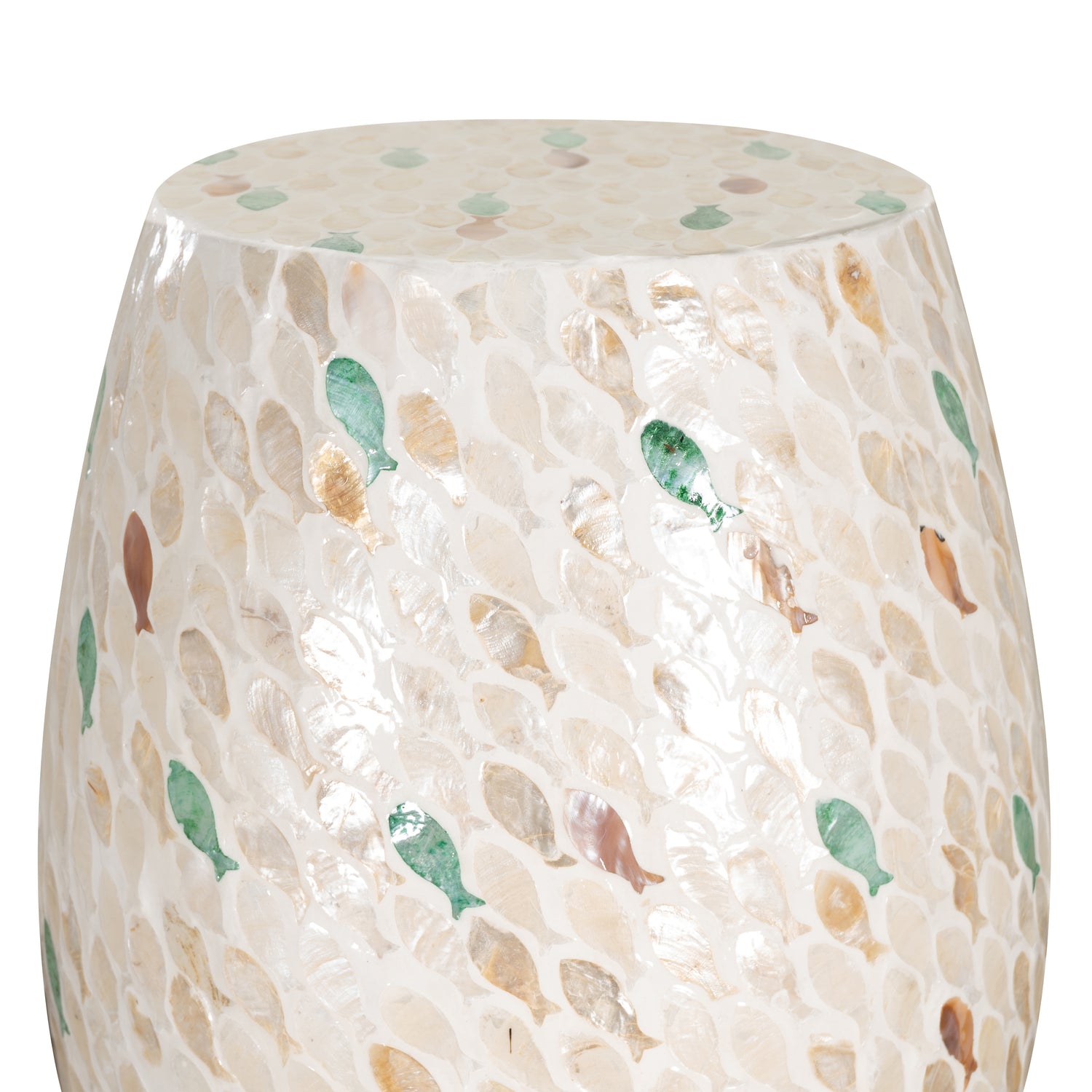 Shaped like a tapered drum and decorated with a mosaic, this accent table blends playful design with coastal-inspired elegance. The capiz shell inlay shimmers in earthy tones over an ivory base, creating a luminous finish that catches the eye. Compact yet versatile, its 13.75” diameter top and 19.75” height make it an ideal side table, decorative pedestal, or statement accent. Lightweight and easy to move, this piece adds charm and functionality to any space, from the living room to the sunroom.