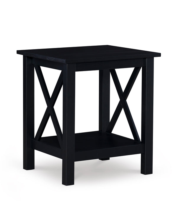This collection has a simple yet eye-catching design that is matched with incredible durability. The end table features a classic shape that makes it perfect for any space. A spacious tabletop and a large bottom shelf provide ample storage and display space. A neutral, black finish allows this piece to easily complement your homes decor.
