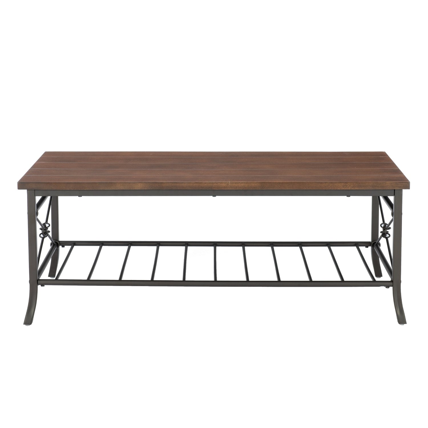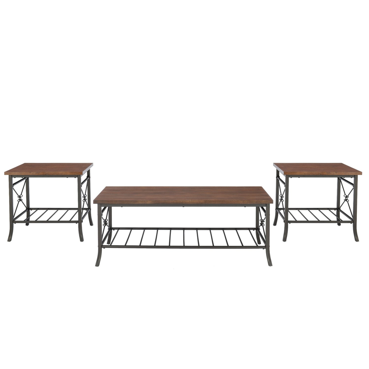 Designed for relaxed gatherings and effortless living, this table set cultivates a grounded, welcoming atmosphere for everyday connection. Complete with a coffee table and two matching end tables, each piece features a plank-style MDF top in a rich chestnut brown finish that evokes a rustic, lived-in feel. The sturdy iron bases, finished in dark bronze, introduce an industrial edge with gracefully flared legs and subtle crossbar detailing. Lower slatted shelves provide space for books, baskets, or decorative accents, merging storage and display with ease. Whether for entertaining guests or unwinding alone, this trio lends an inviting rhythm and sense of cohesion to any living space.