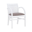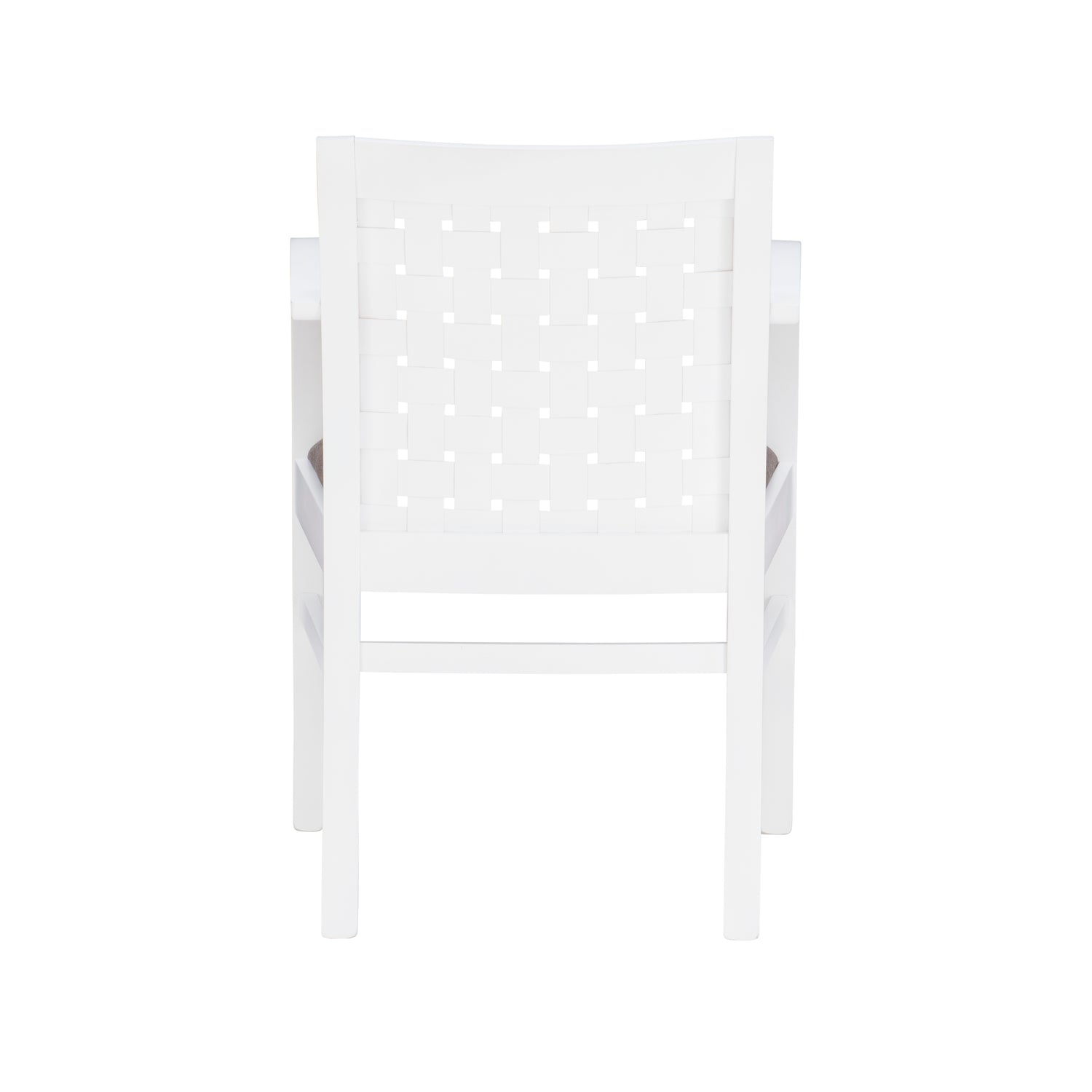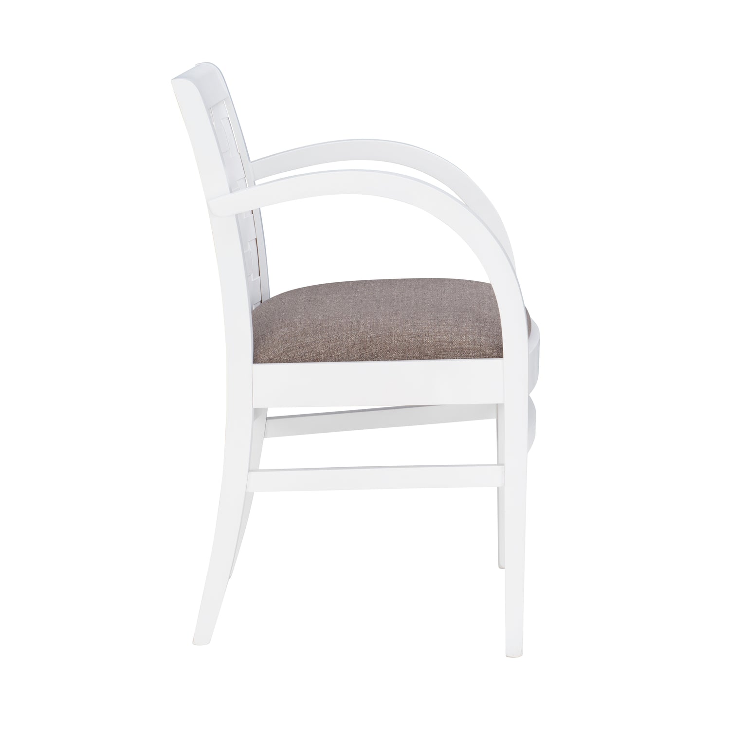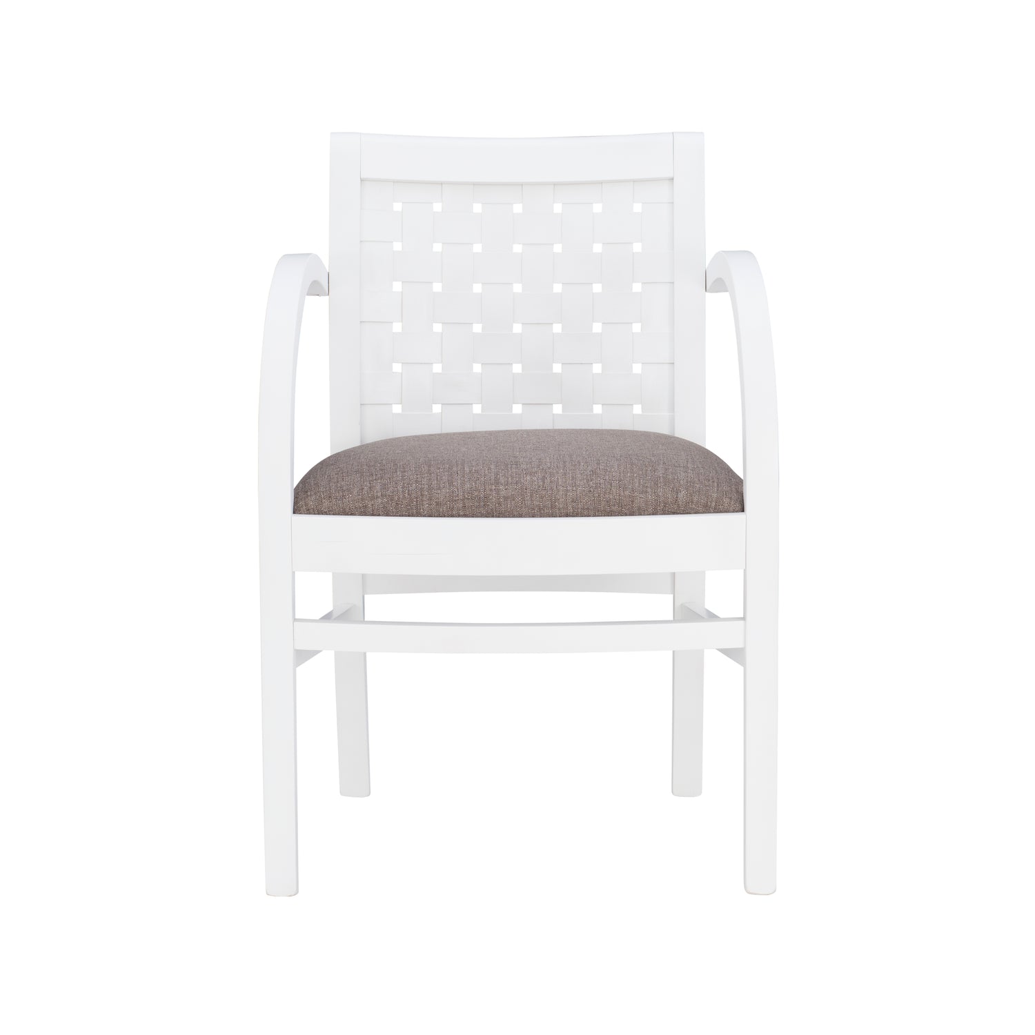 Reminiscent of classic woven strap armchairs, this accent chair adds a modern touch with beautifully curved arms and clean lines. It easily finds a home in a living room, bedroom or the like. Crafted from solid beechwood finished in a bright white, the accent chair offers plenty of comfort. Its seat is upholstered in dark grey woven polyester, which is easy to clean, and blends with nearly any color scheme. Comes fully assembled. Commercial grade