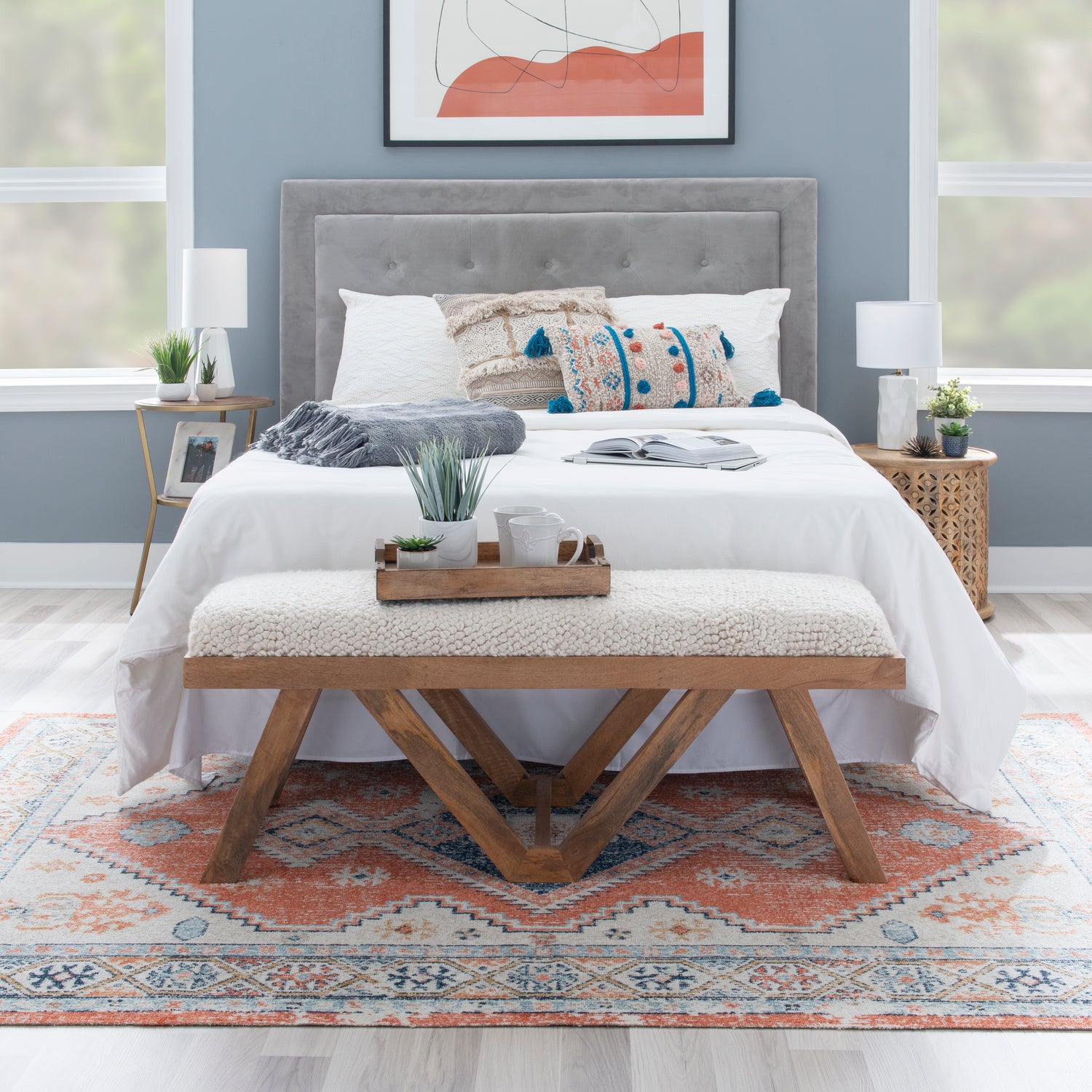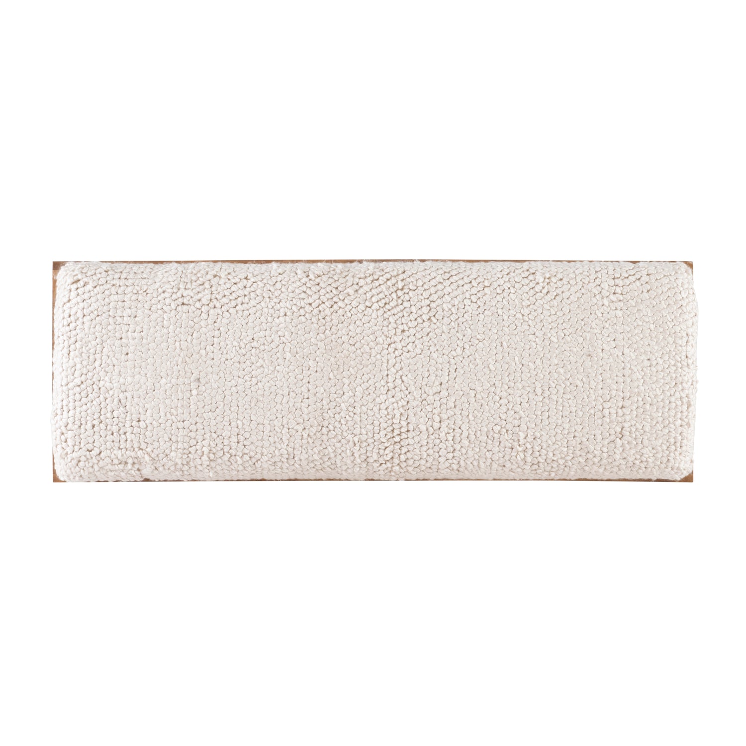 Enjoy the refined, yet light-hearted aesthetic of this boho style bench, brought forward by a shaggy cushion and rustic wooden base. This comfortable perch is wrapped in white cotton and acrylic fabric, handwoven with a pit loom to create a thickness similar to that of a rug. In the supporting role is a sturdy, brown frame made of mango wood, which displays natural knots and grain patterns. All in all, the piece measures at 45"L x 16"D x 18"H, not too boxy, not too small; making it the perfect addition to your living room, bedroom, dining room or entryway.