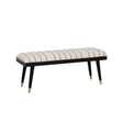 Make a bold yet elegant statement with this upholstered bench—perfect for styling at the end of a bed, in a hallway, or as extra living room seating. Crafted with a sturdy mango wood frame in a painted black finish, the bench is topped with a cream and black woven cotton upholstery and elegantly cushioned with foam and fiber batting for a refined balance of comfort and poised support. Sleek tapered legs are accented with brass detailing for a touch of modern glamour. Compact yet supportive with a 400 lb. weight capacity and a 19” seat height, this bench balances comfort, function, and refined style.