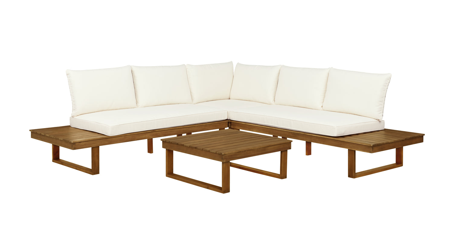 - Slatted Table Surfaces: The matching slatted coffee table provides a spacious surface for drinks, snacks, or sunny-day reads. Integrated side platforms on each loveseat also provide extra table space right where you need it.