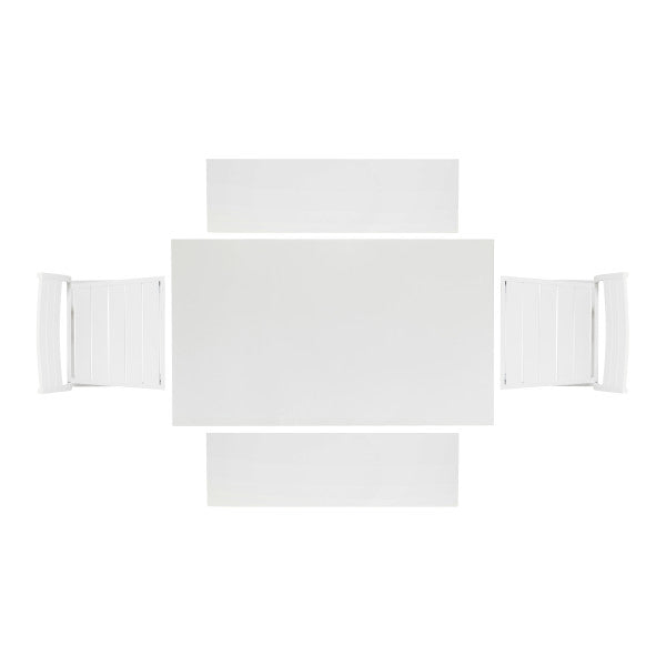 Make the most of your patio with this chic 5-piece dining set. Featuring a spacious aluminum table, two matching benches, and two contemporary chairs, this ensemble combines modern aesthetics with durable construction. The rust-resistant black or white powder-coated finish ensures year-round performance, while the lightweight aluminum frames make rearranging your layout effortless. The benches provide generous seating for gatherings and are flanked by 2 slatted side chairs for a balanced and cohesive look. With its minimalist aesthetic and low-maintenance design, this set is sure to elevate your outdoor space with functionality and understated style.