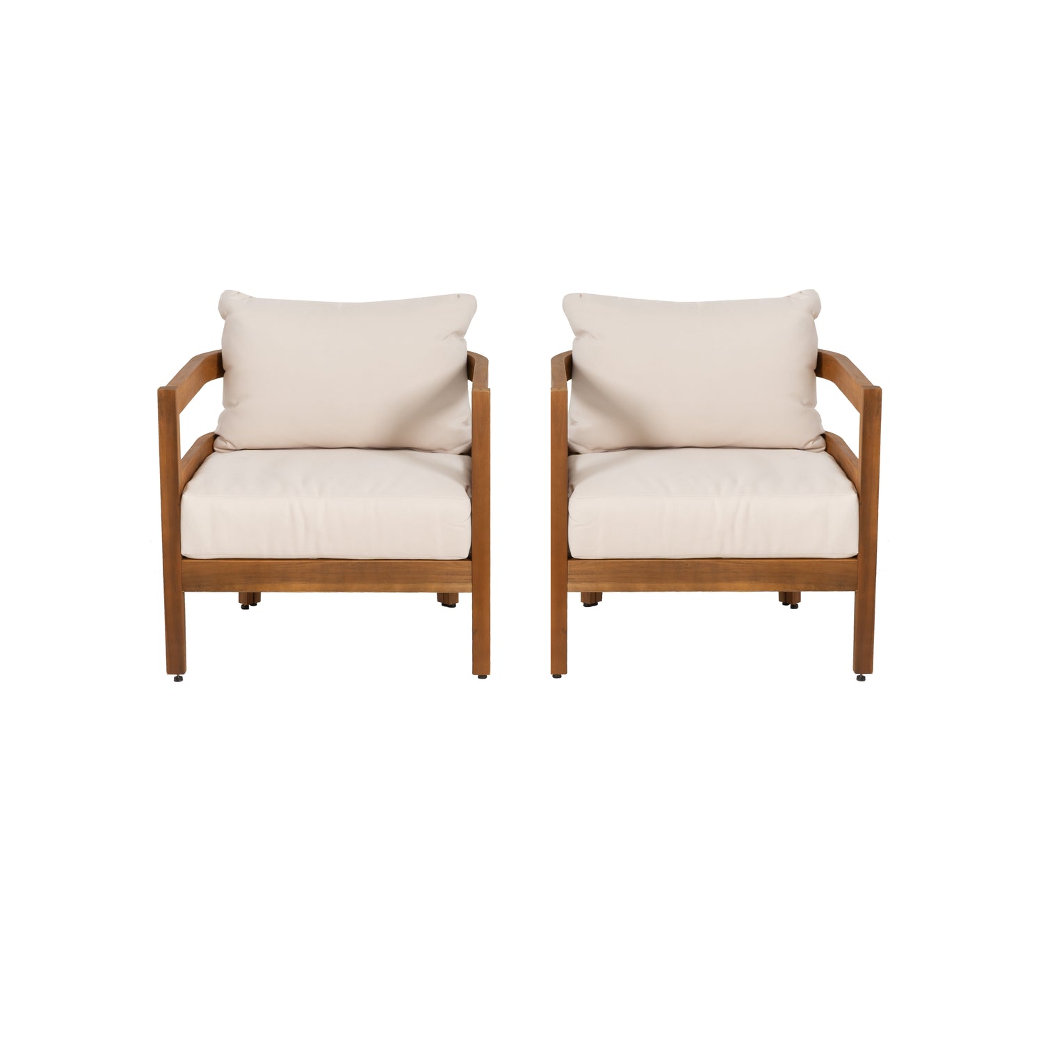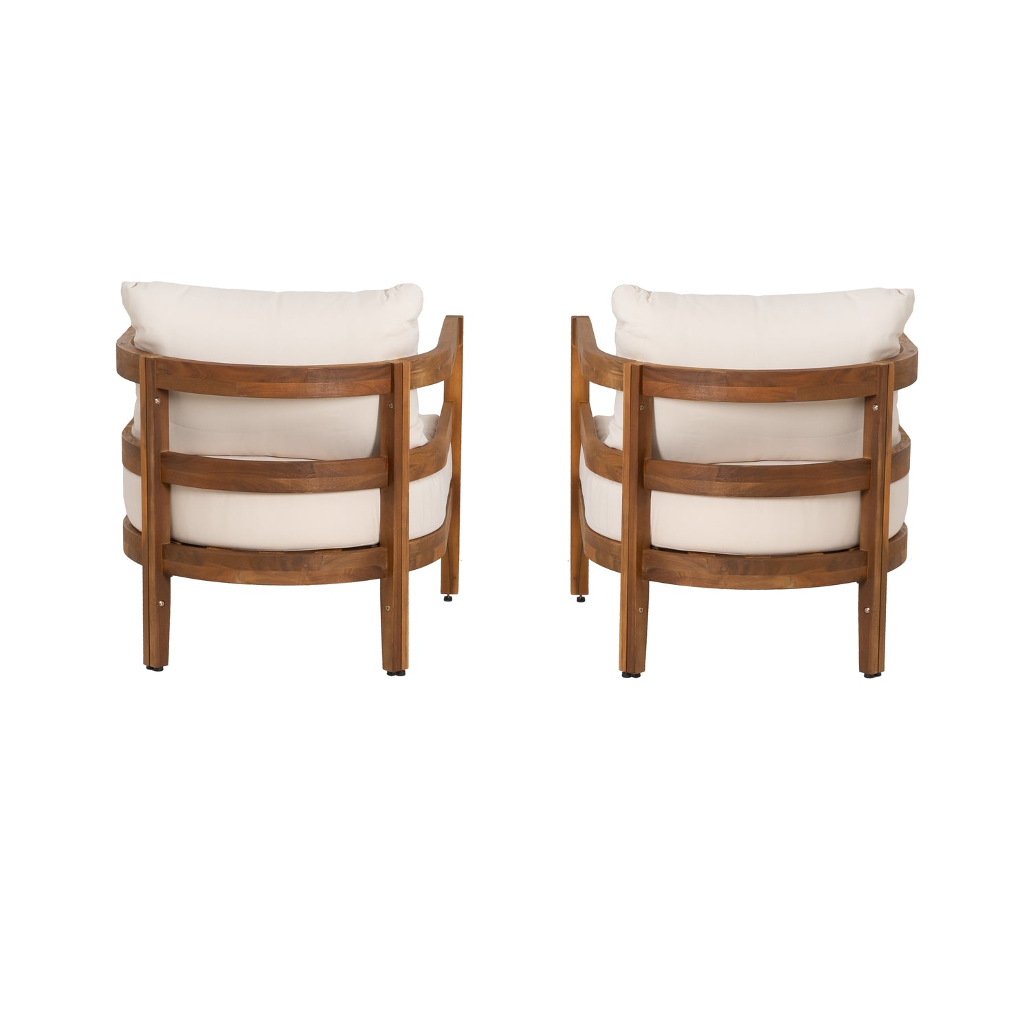 With its curved frame and low profile, this club chair brings sculptural elegance and inviting comfort to outdoor spaces. The solid acacia wood base features rounded ladder-back rails in a warm teak-toned finish, creating a midcentury-inspired barrel silhouette. Deep-set beige polyester cushions provide plush seating that resists fading, stains, and moisture, ensuring lasting comfort and style through every season. Perfect for a porch corner, sunlit rooftop, or paired with matching pieces on a patio, this chair offers a versatile design with timeless appeal.